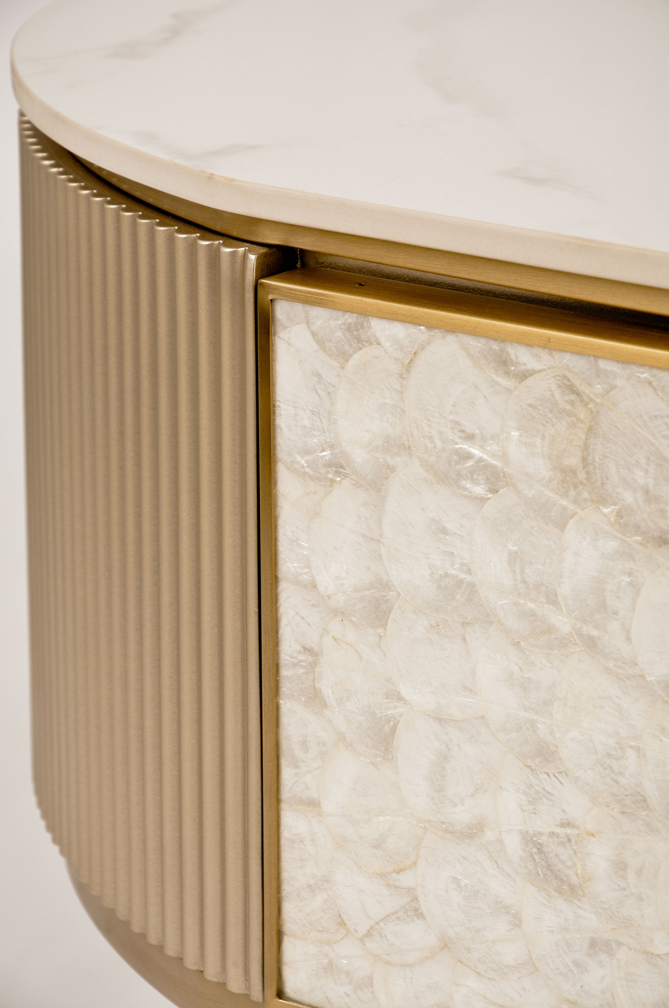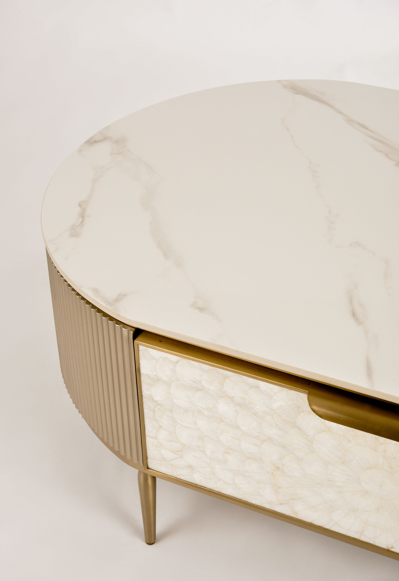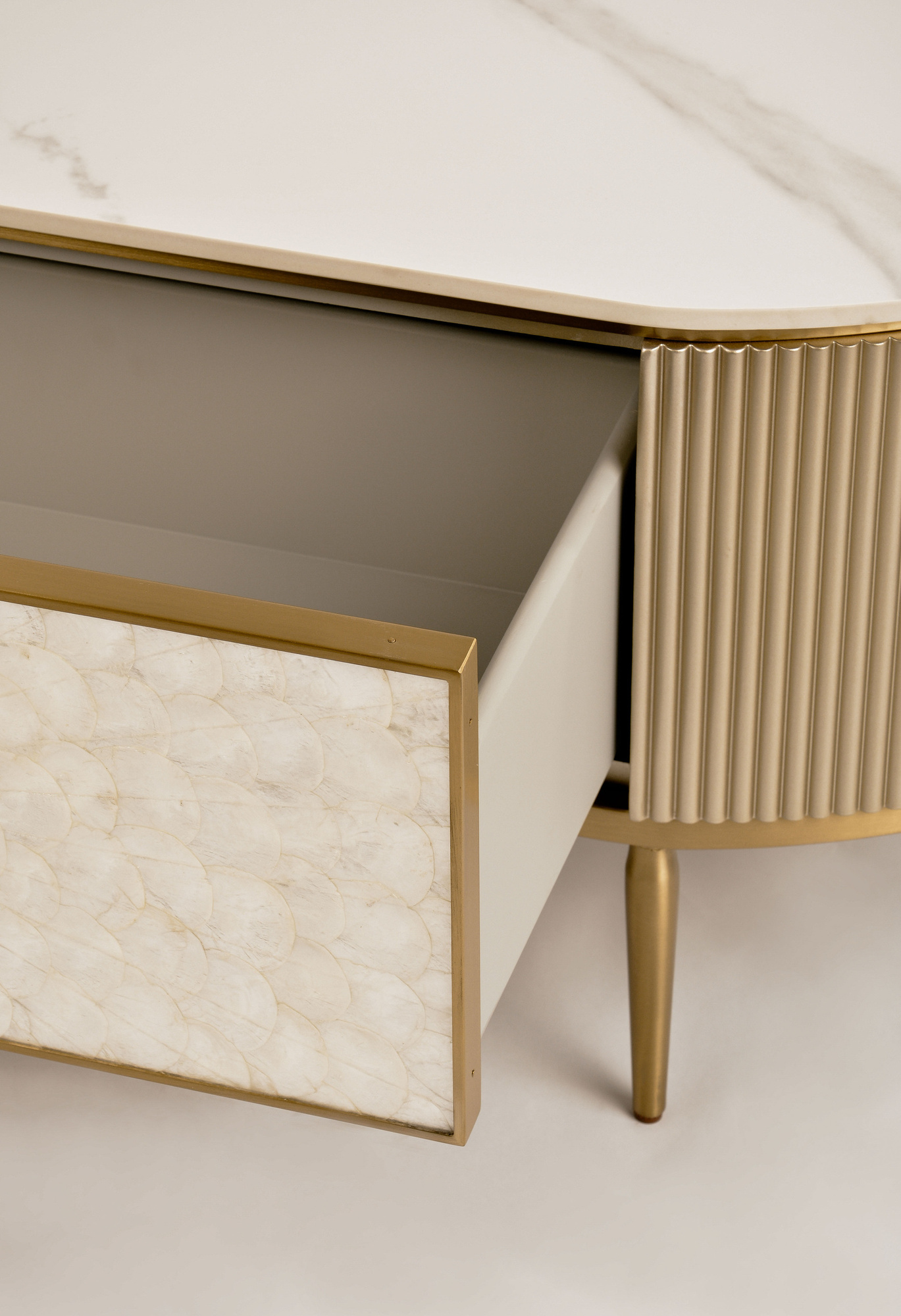 Stolik kawowy Stilig ST907 łączy luksus z funkcjonalnością. Jego blask szampańskiego złota, front z naturalnej muszli oraz marmurowy blat w połysku tworzą elegancki duet.