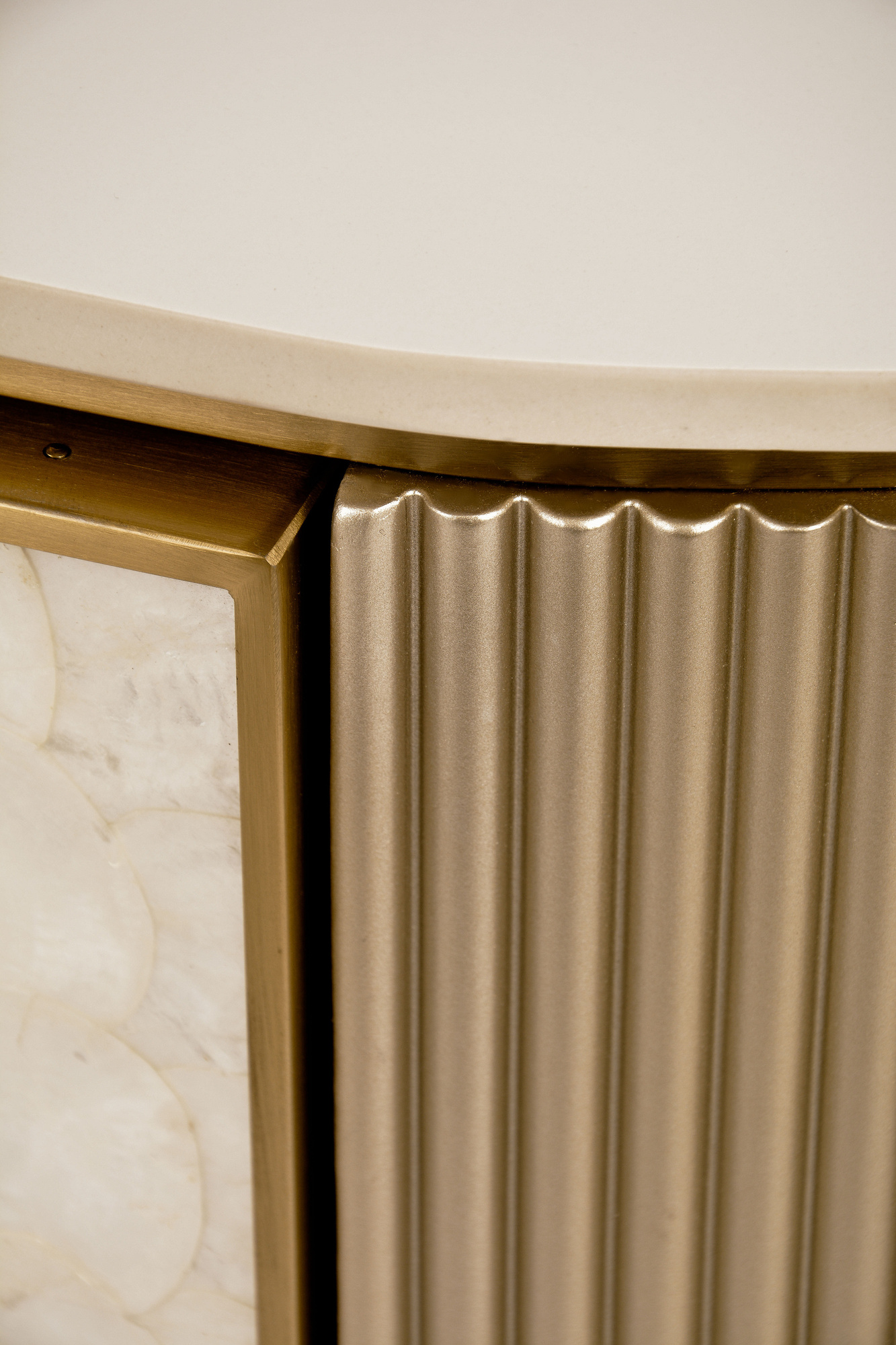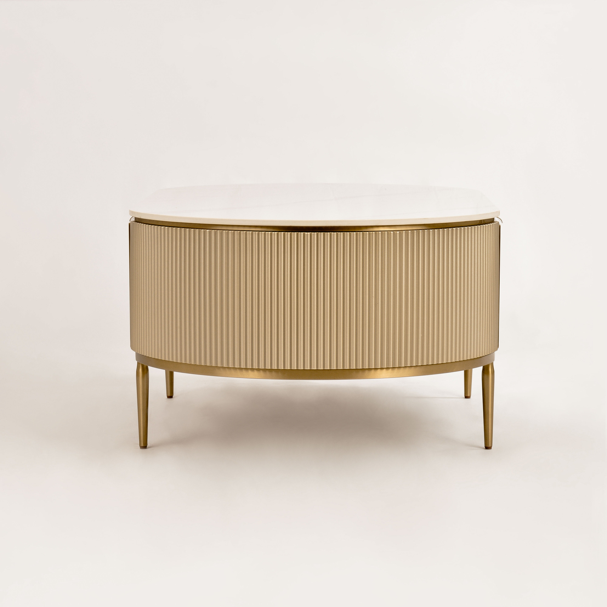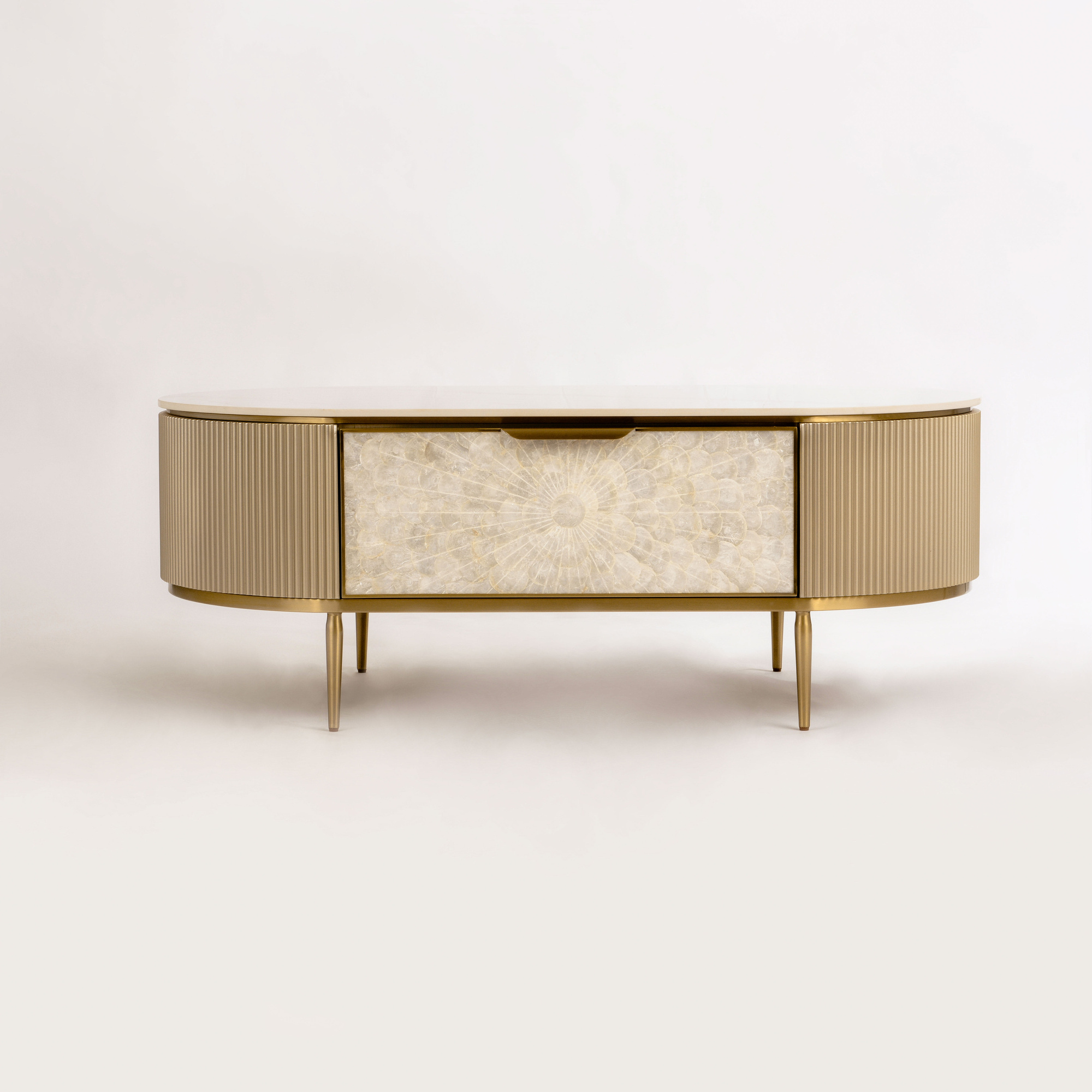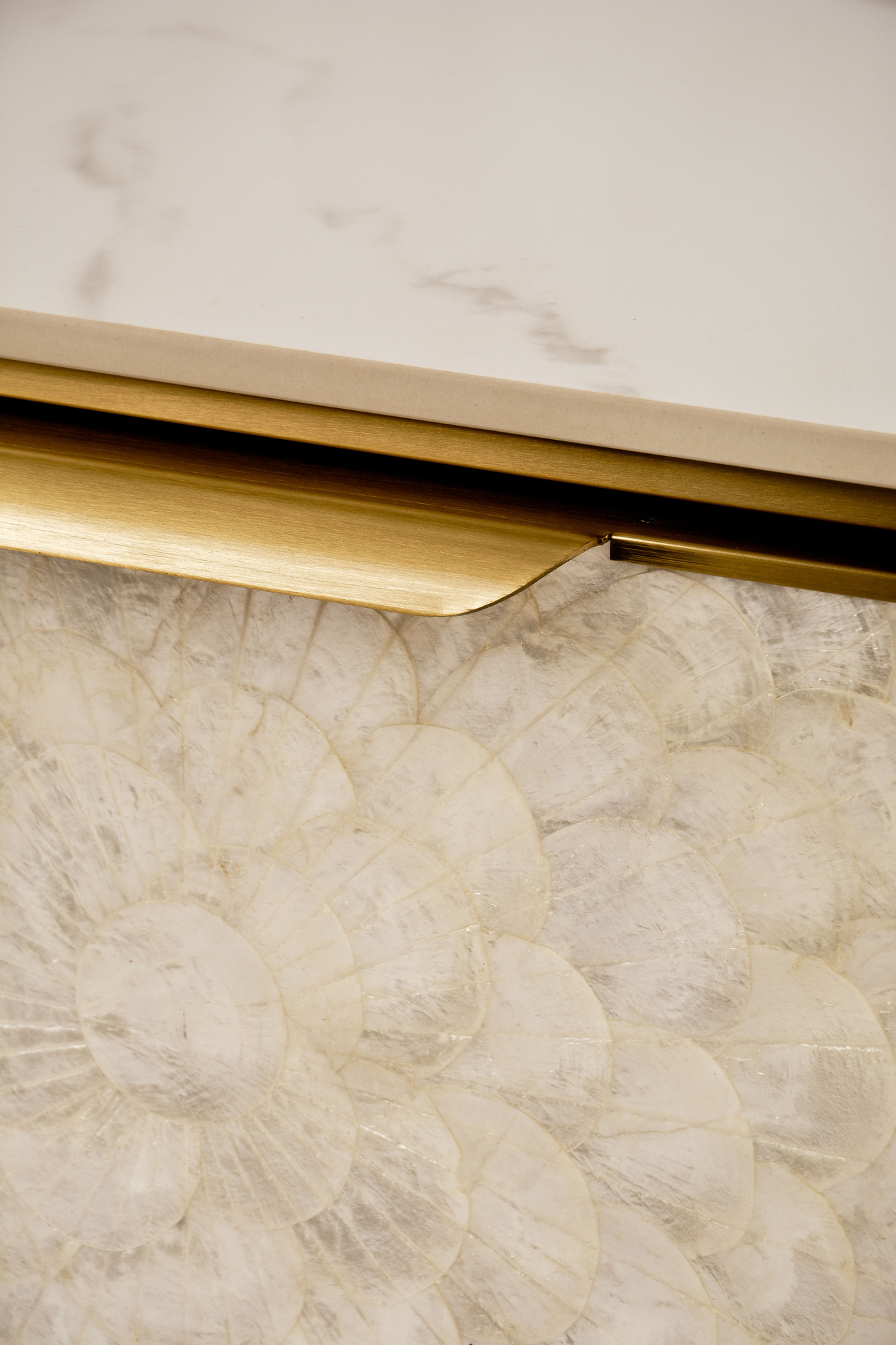 Stolik kawowy Stilig ST907 łączy luksus z funkcjonalnością. Jego blask szampańskiego złota, front z naturalnej muszli oraz marmurowy blat w połysku tworzą elegancki duet.