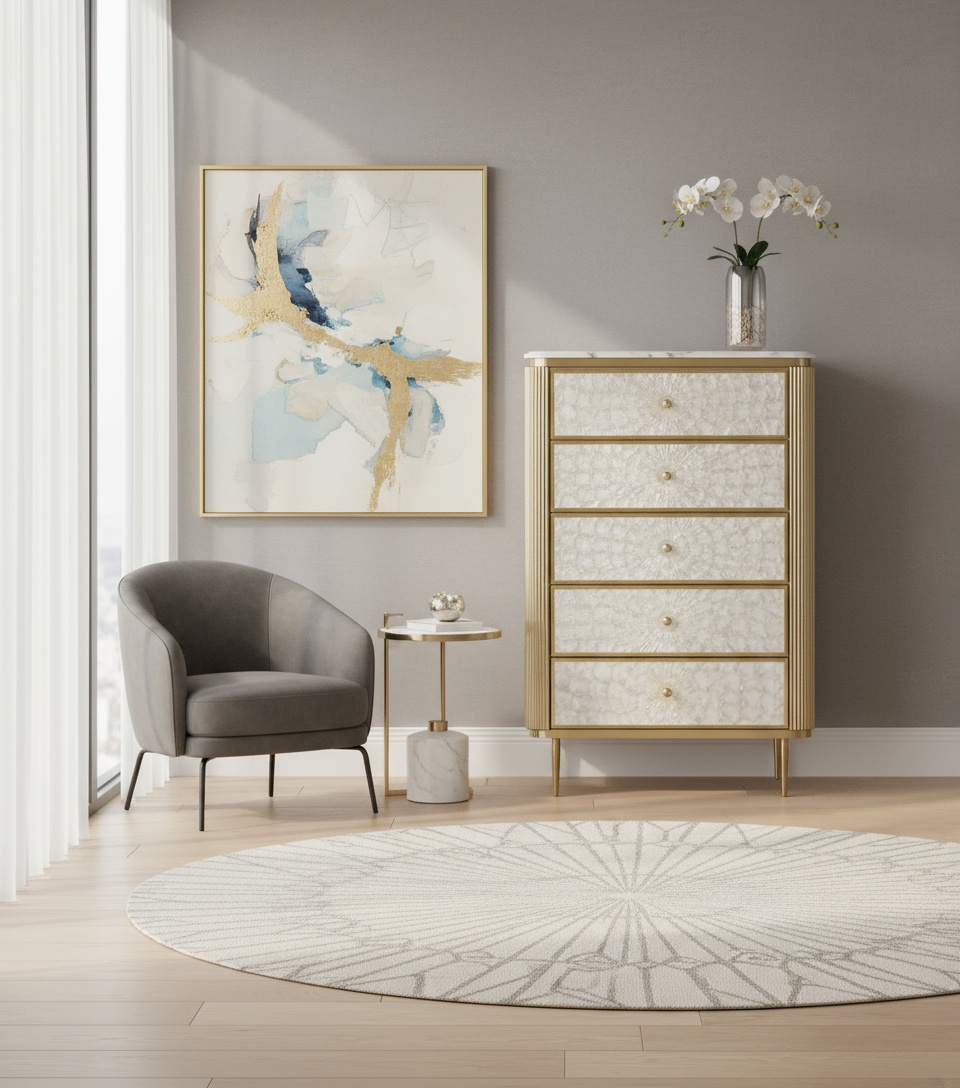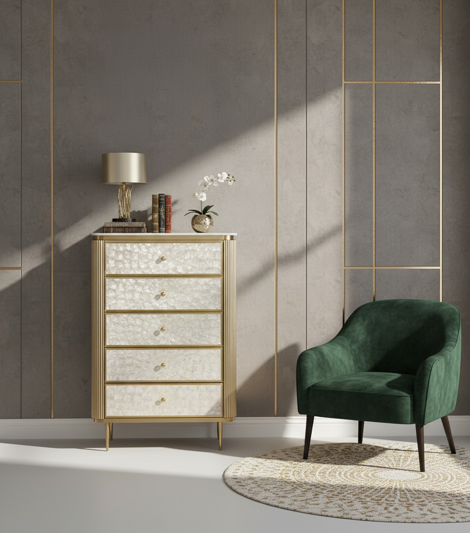 • Odkryj elegancję z komodą Stilig ST911 marki Livinhill! Wykonana z naturalnej muszli morskiej, ryflowanego drewna i syntetycznego marmuru, łączy szampańskie złoto z nowoczesnym stylem.