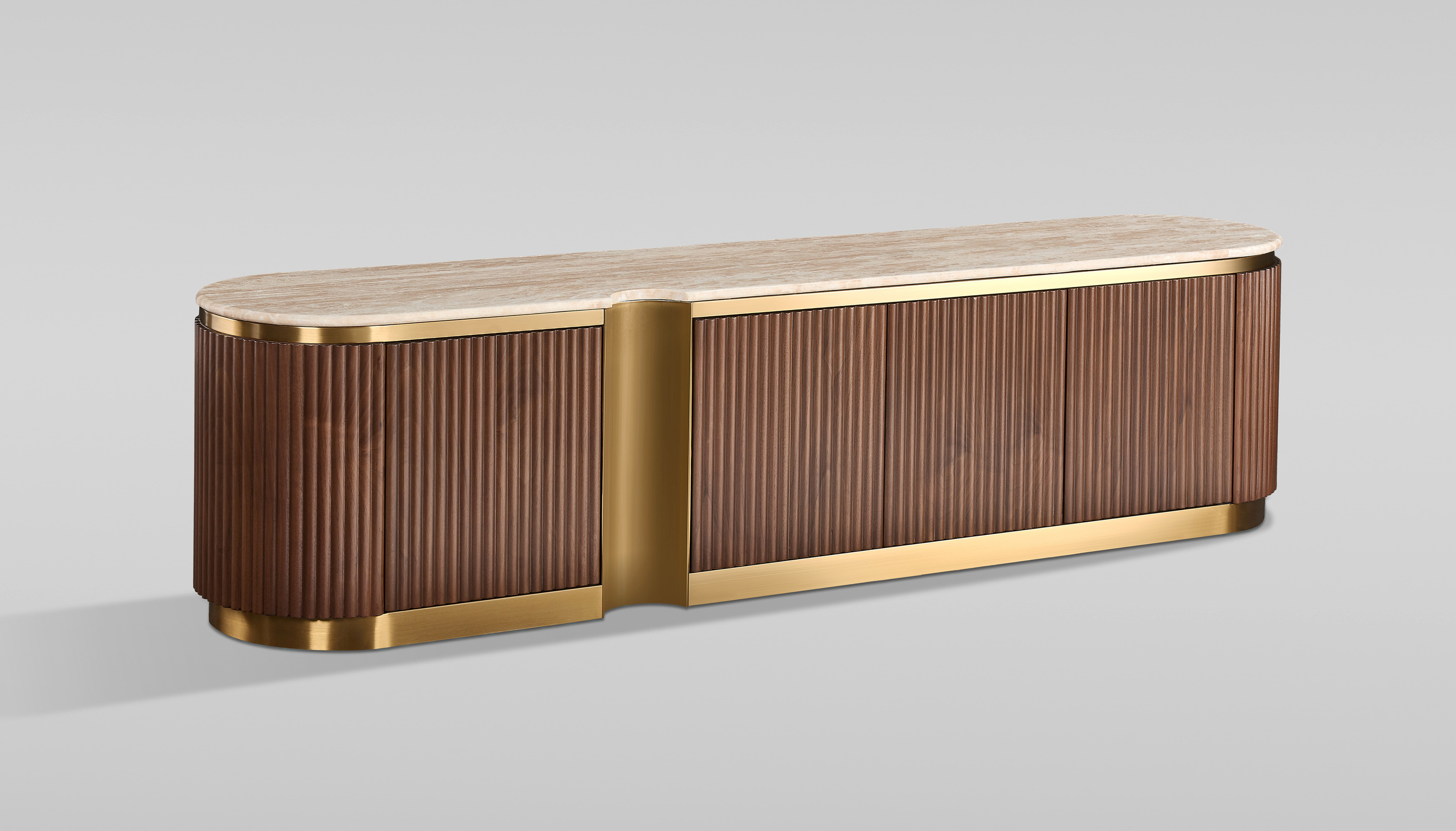 Stylowa komoda RTV Stilig ST916D marki Livinhill łączy elegancję orzecha włoskiego z luksusowymi złotymi akcentami. Jej ryflowany front, naturalny kamień trawertynowy oraz system push to open sprawiają, że jest nie tylko funkcjonalna, ale i wyjątkowo este