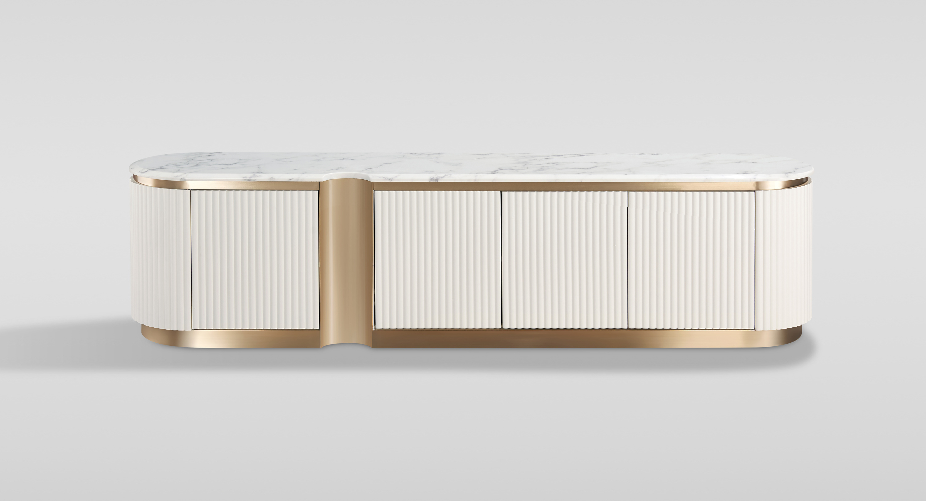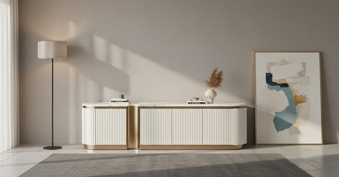 Odkryj elegancję z komodą RTV Stilig ST916F od Livinhill. Wykonana z ryflowanego MDF i syntetycznego marmuru, z błyszczącym blatem oraz złotymi akcentami. Posiada system push to open oraz miękkie domykanie, łącząc styl i funkcjonalność w jednym.