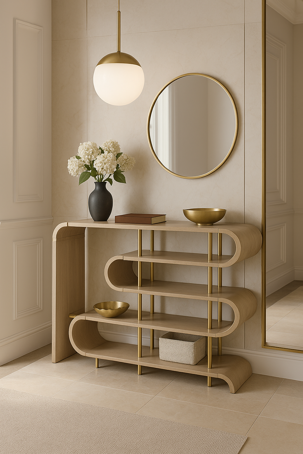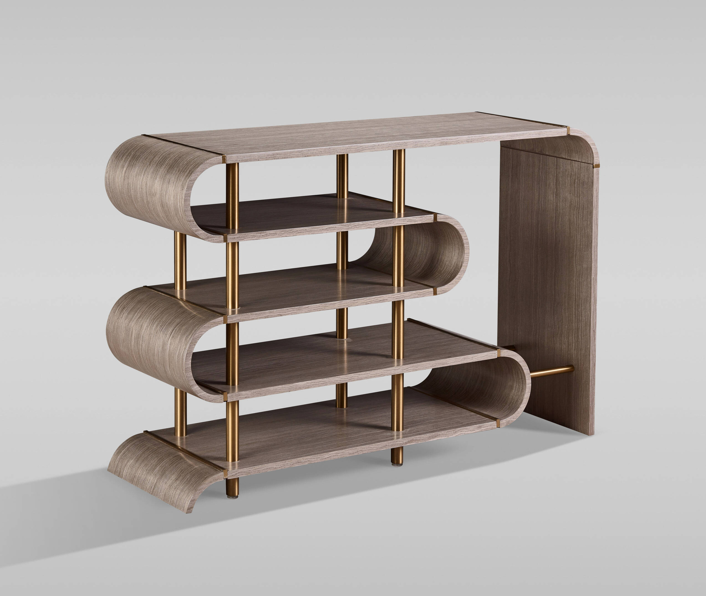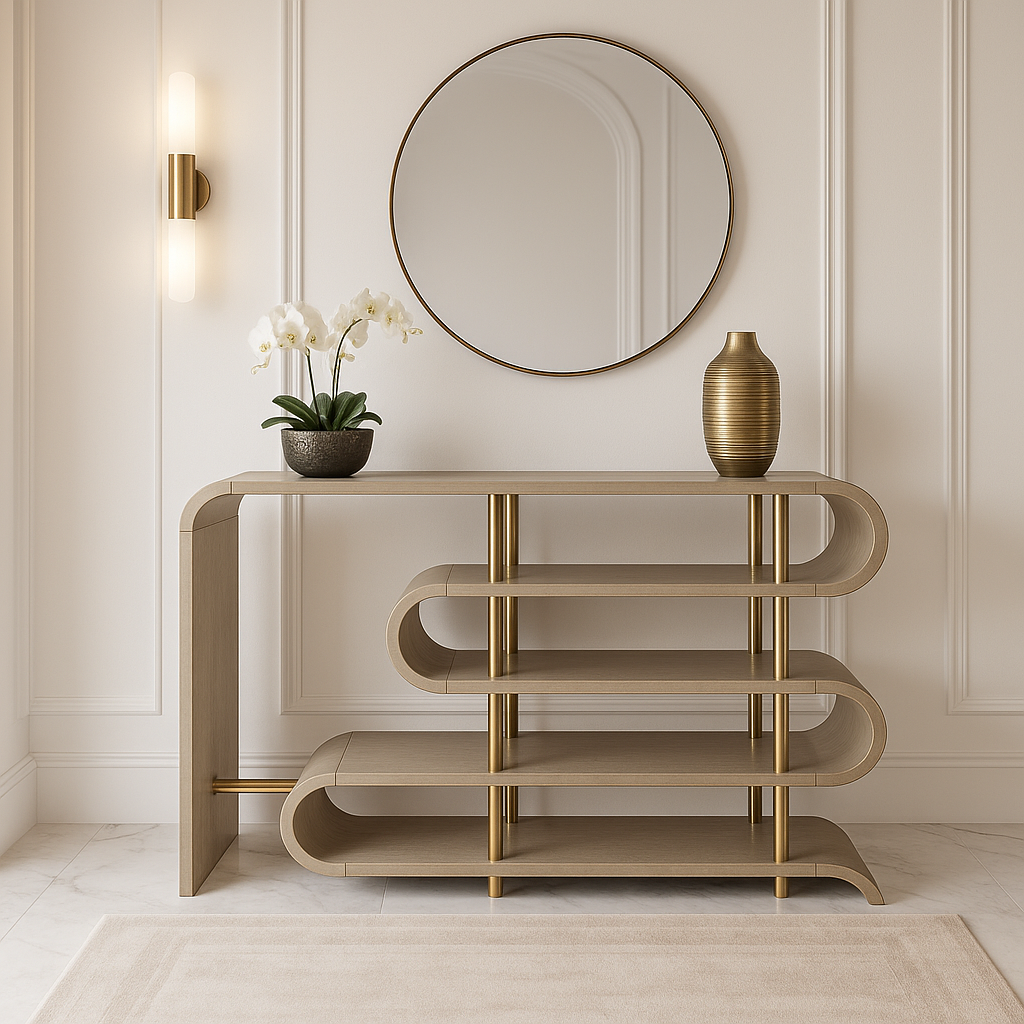 Konsolę charakteryzuje nietuzinkowy sinusoidalny kształt półek, który nadaje jej wyjątkowo oryginalnego charakteru.