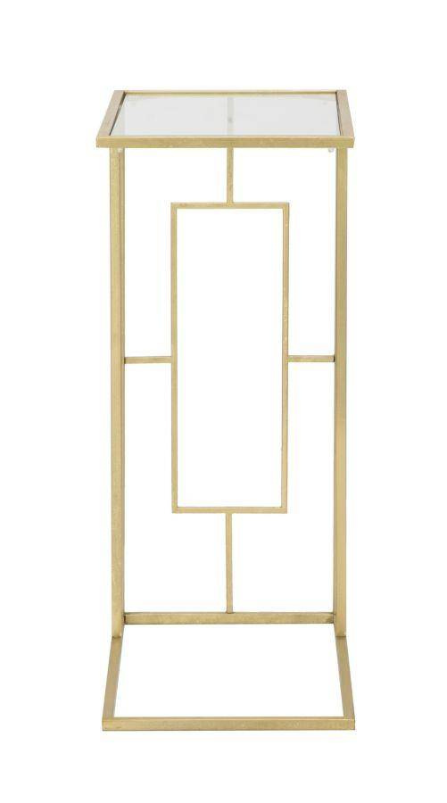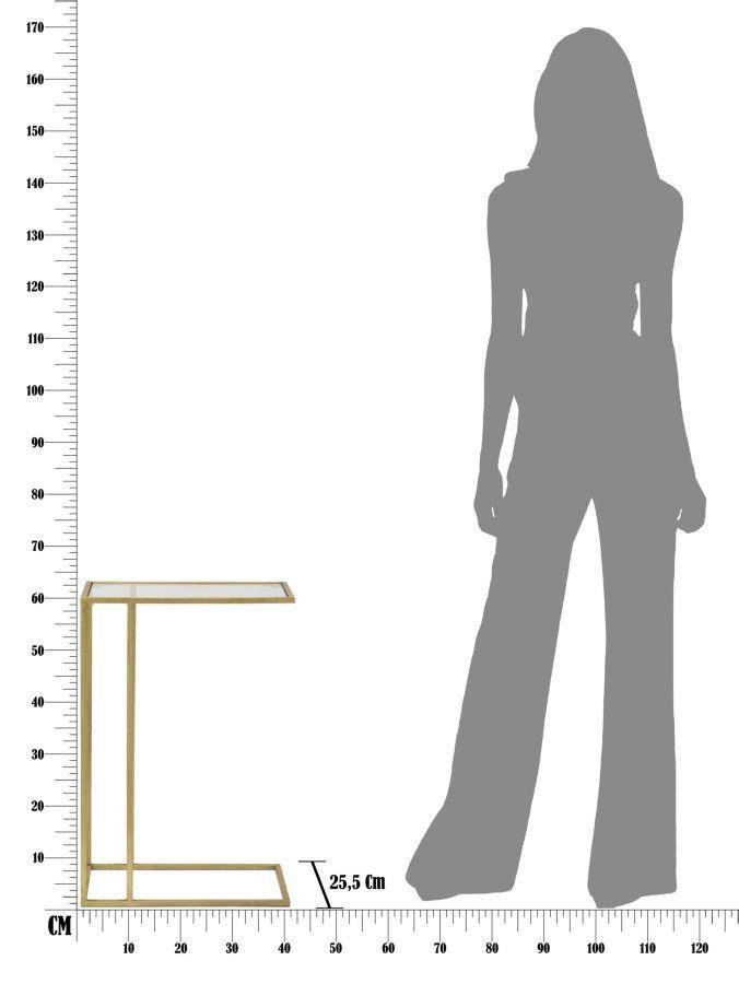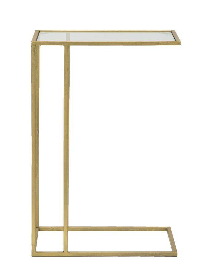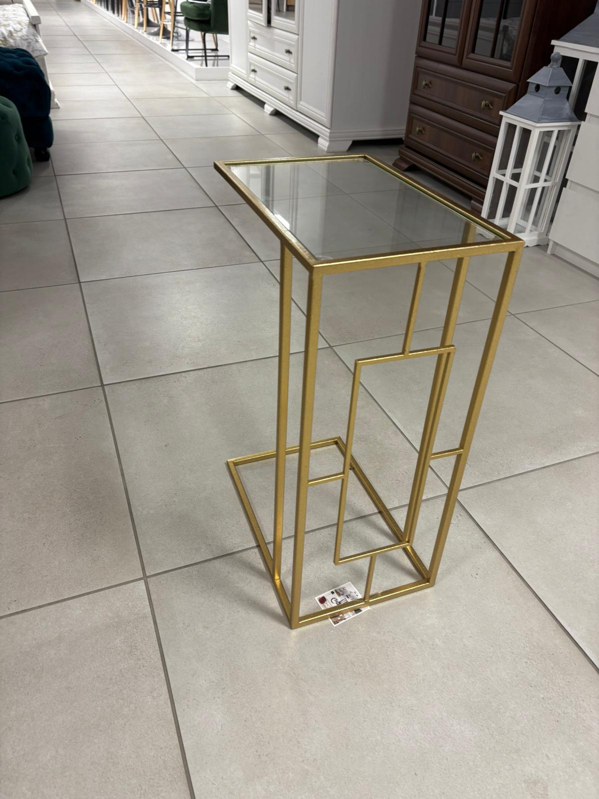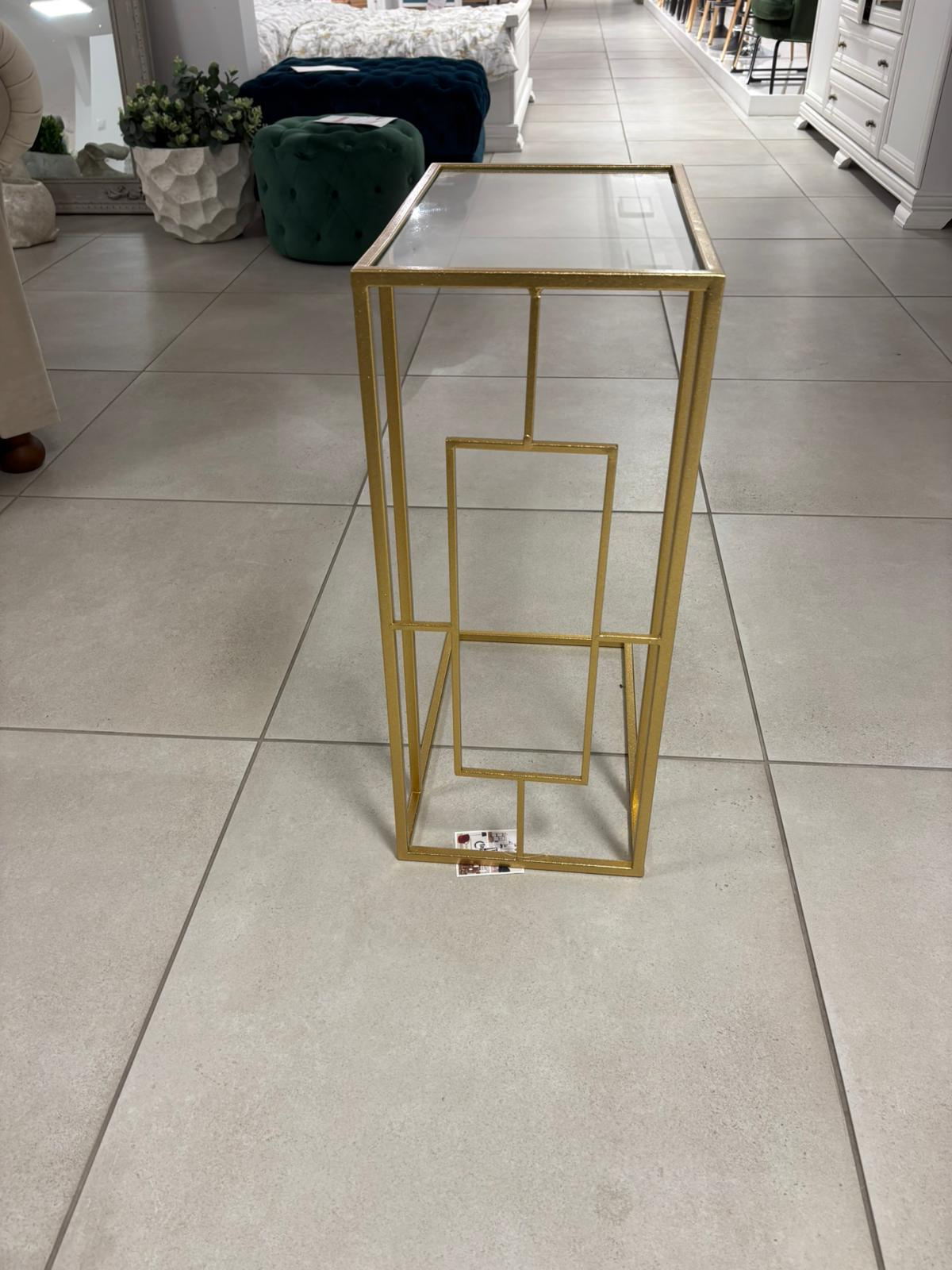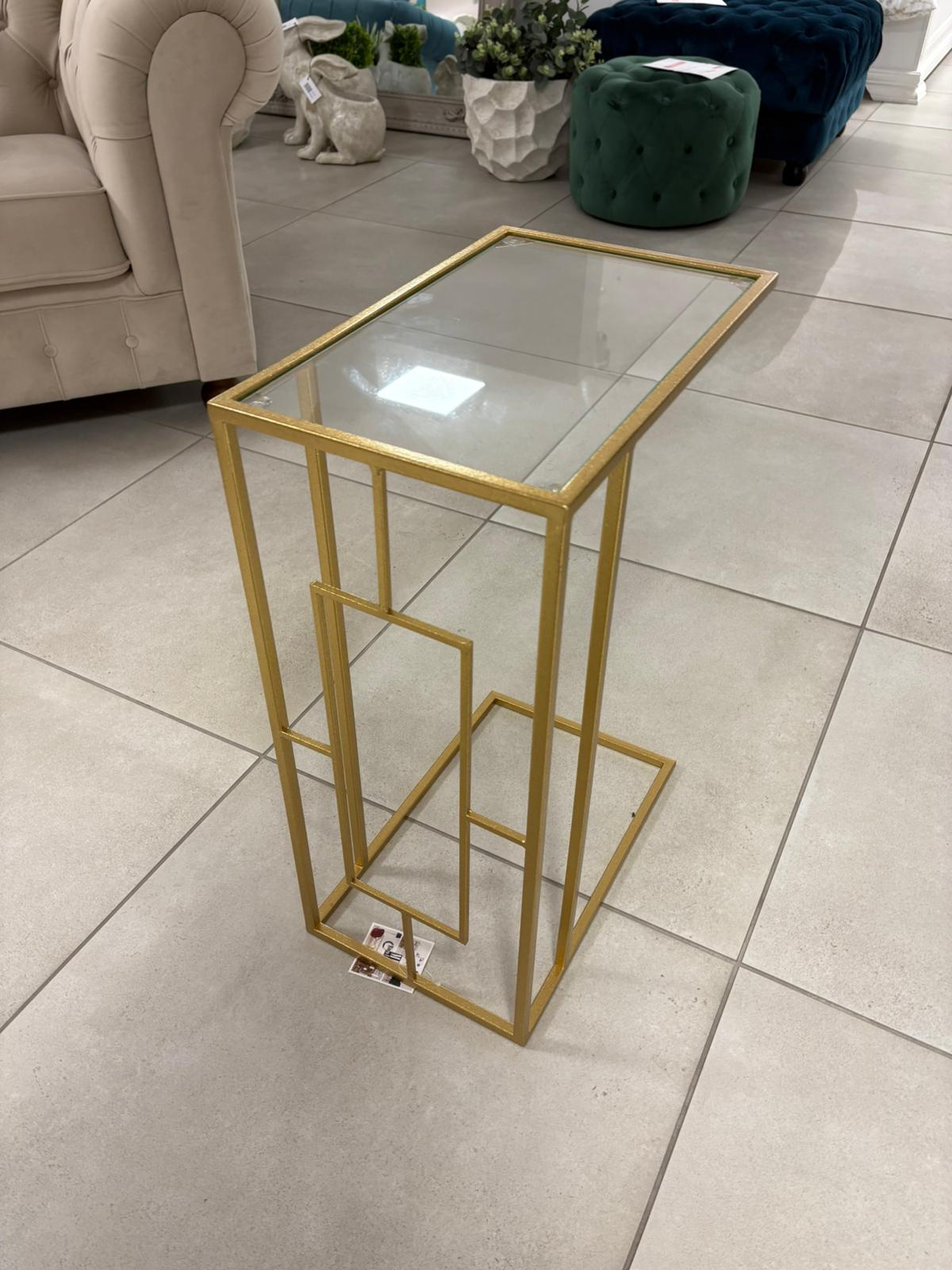 - Prostokątny stolik na sofę z metalu w kolorze złotym ze szklanym blatem. Geometryczne i regularne linie w połączeniu ze stylem glamour dodadzą elegancji i blasku każdemu salonowi.