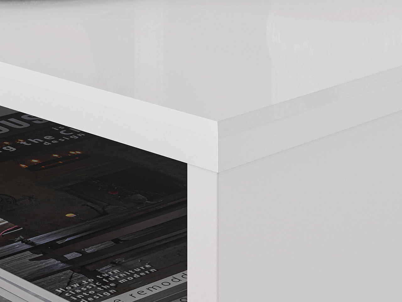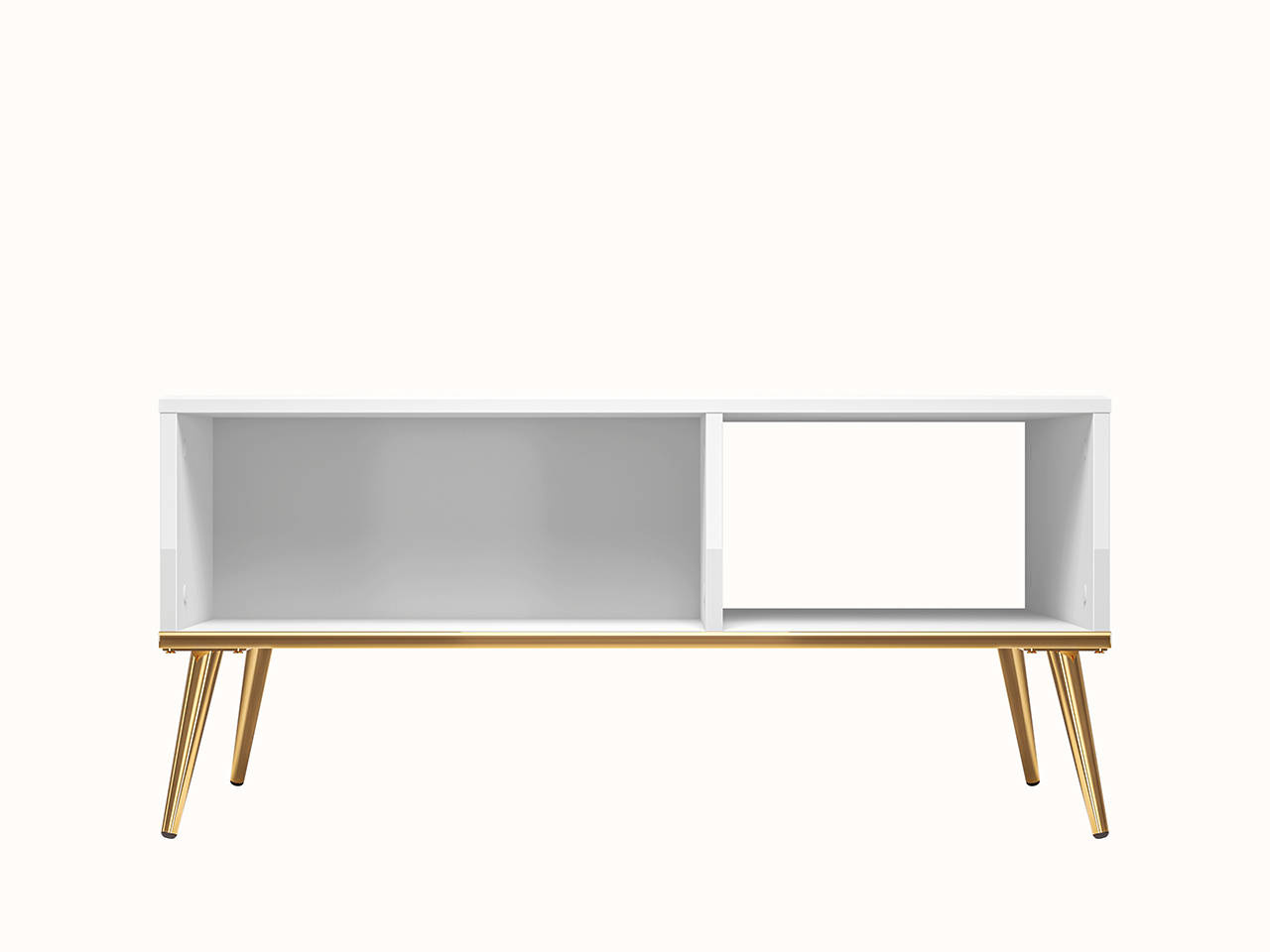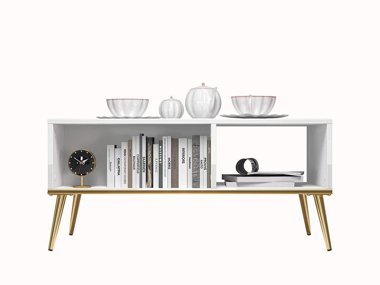 - Stolik kawowy o szerokości 90 cm z wnękami na przechowywanie wykonany z płyty laminowanej w kolorze uniwersalnej połyskującej bieli z pięknymi złotymi nóżkami.