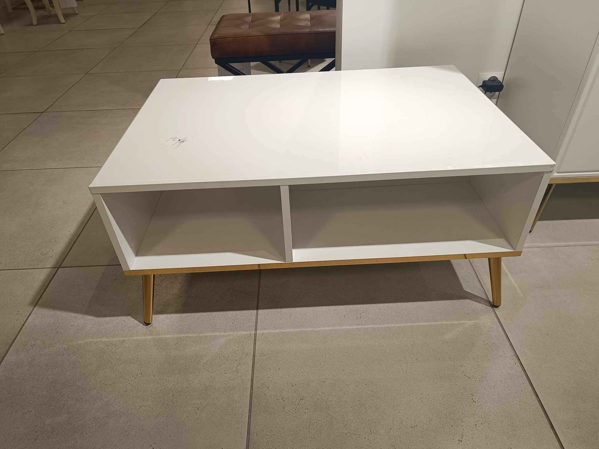 Stolik kawowy o szerokości 90 cm z wnękami na przechowywanie wykonany z płyty laminowanej w kolorze uniwersalnej połyskującej bieli z pięknymi złotymi nóżkami. Towar poekspozycyjny.