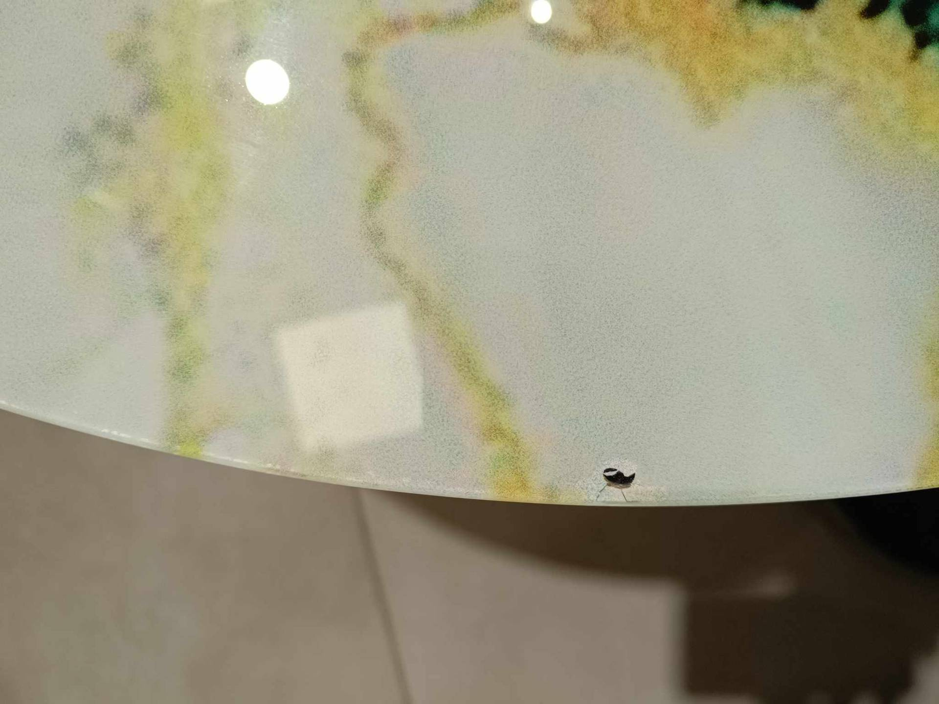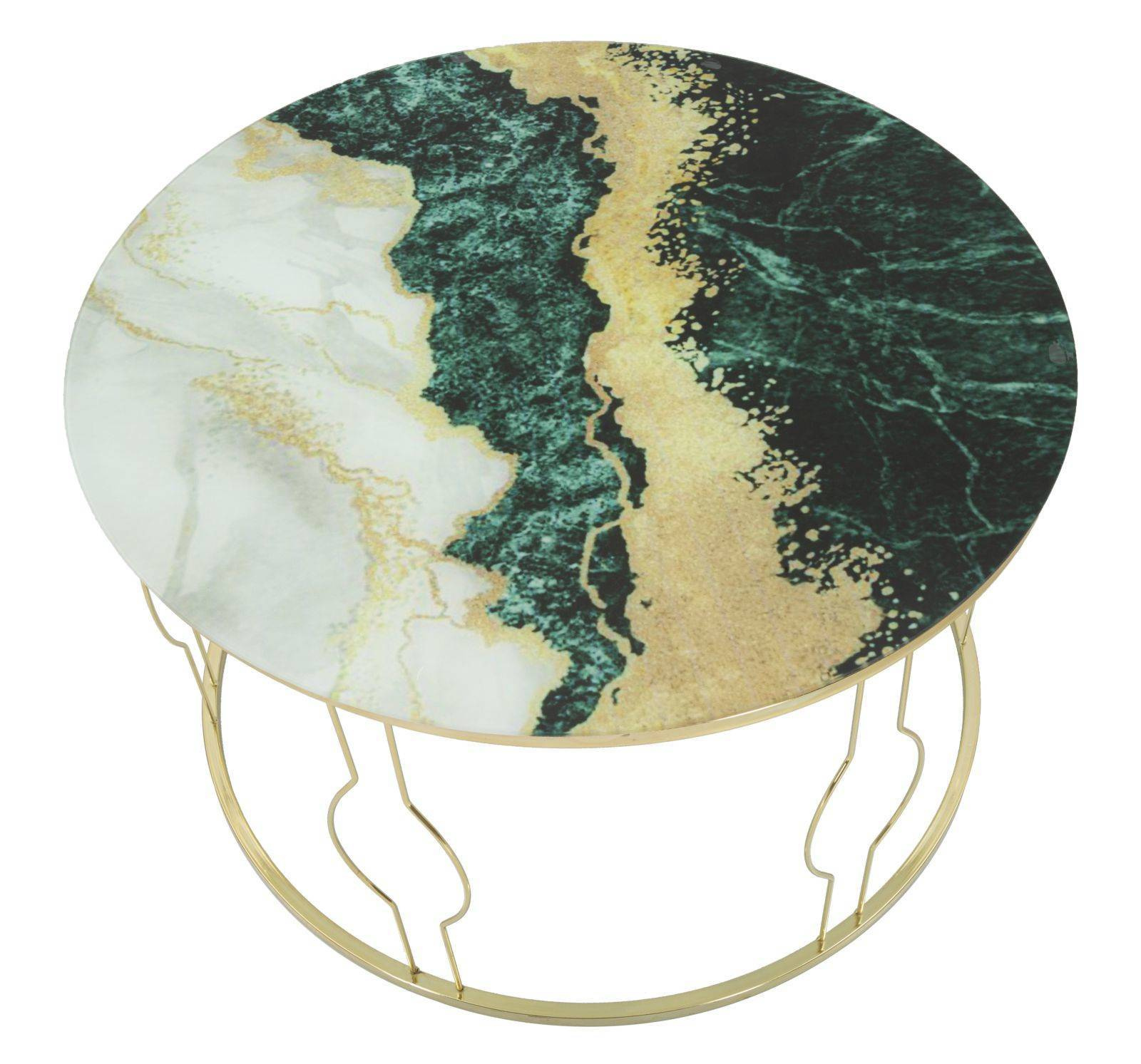 - Okrągły stolik kawowy w złotym metalu ze szklanym blatem z imitacją obróbki marmuru. Posiada uszczerbienia blatu. Towar poekspozycyjny.