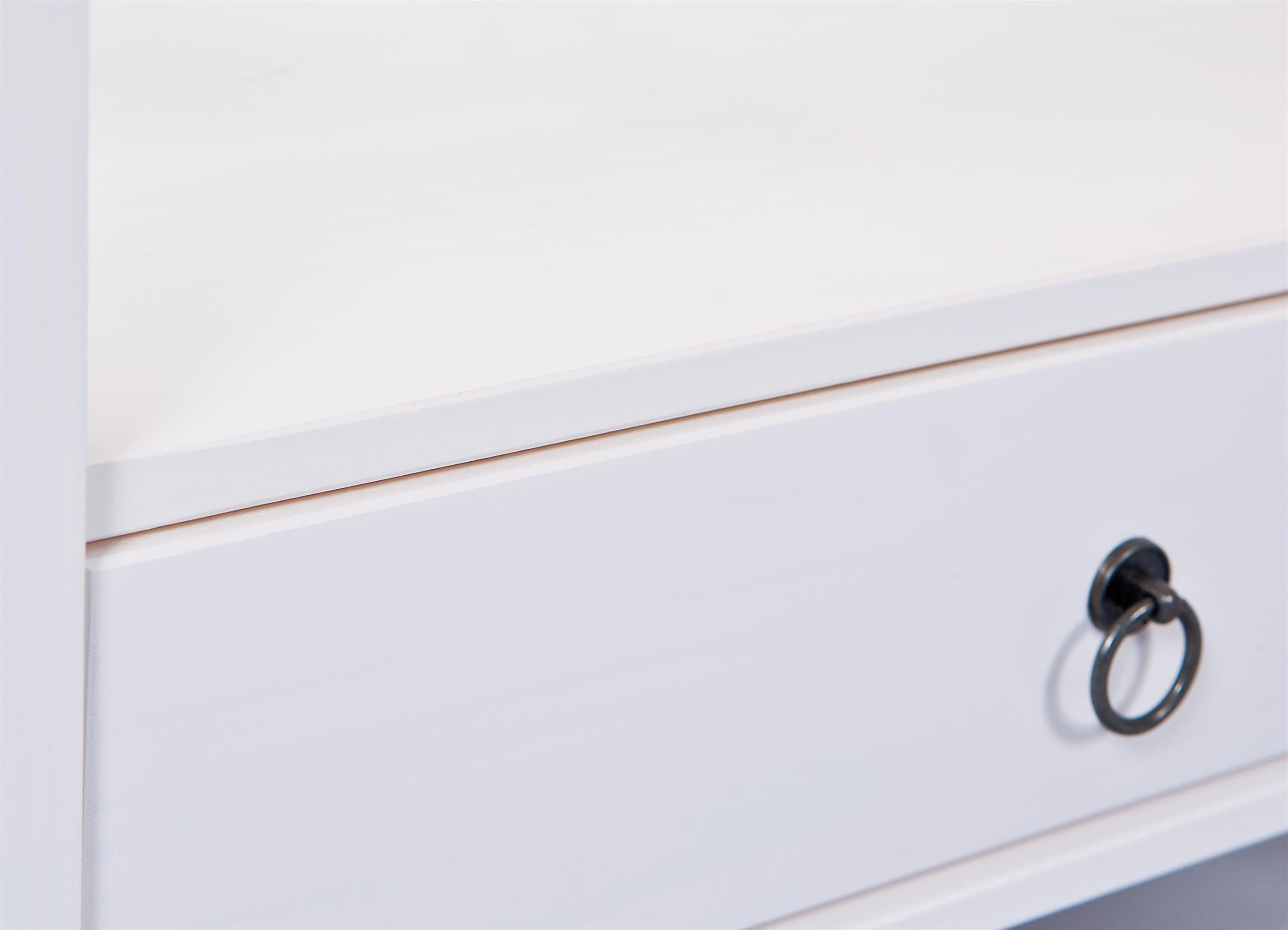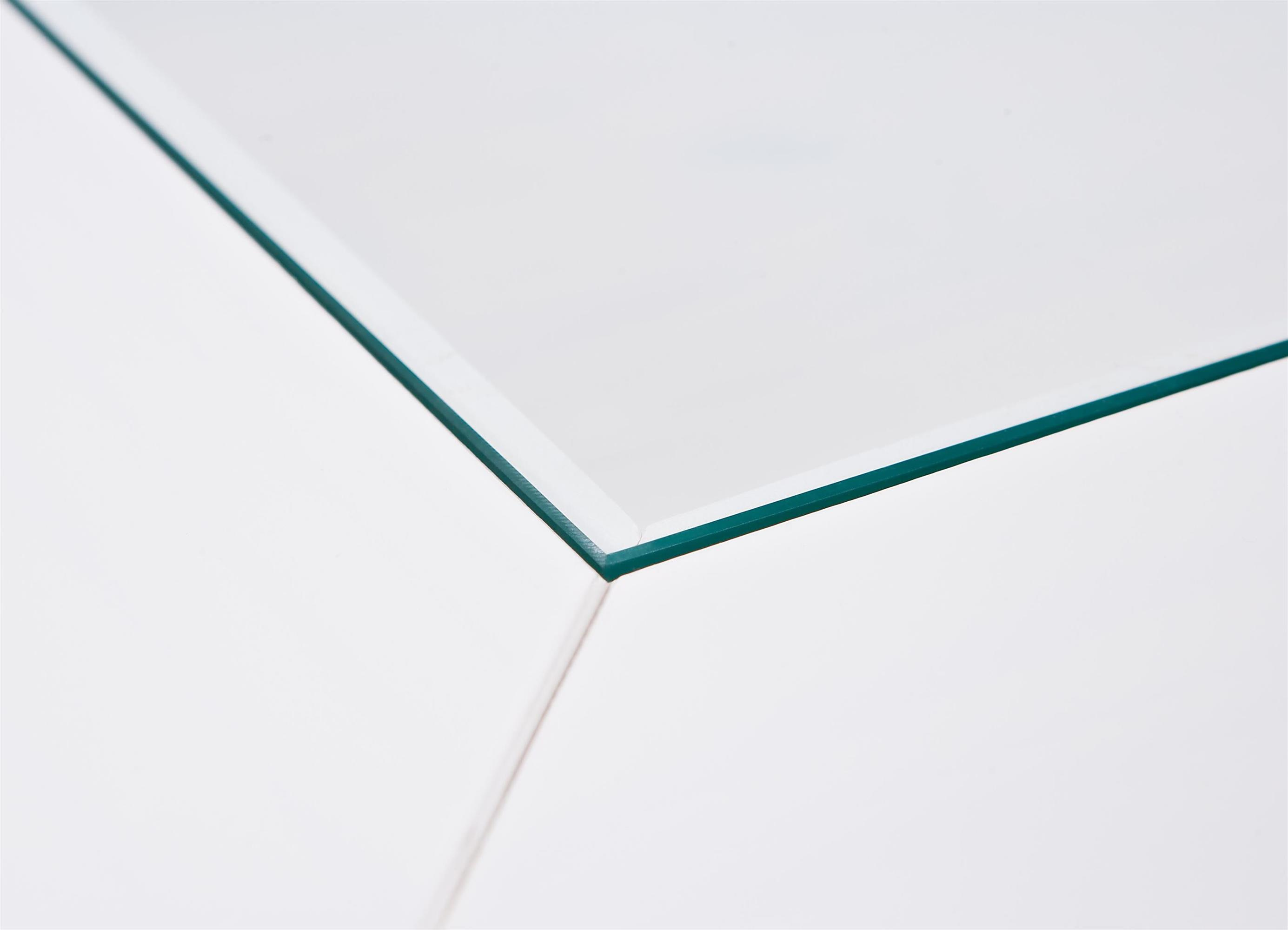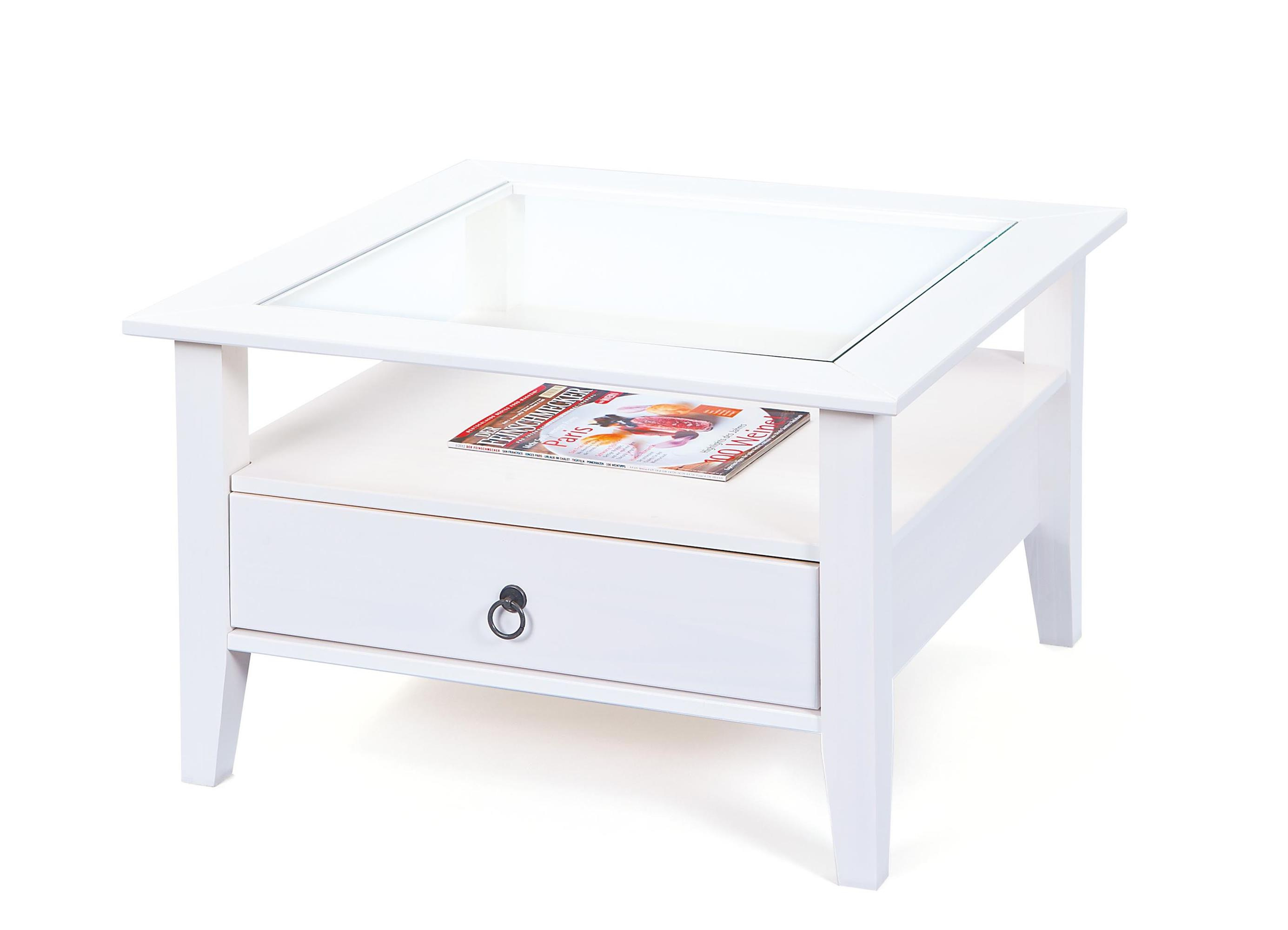 - Stolik kawowy z drewna sosnowego z blatem z bezpiecznego szkła. Stolik z jedną szufladą i wnęką do przechowywania w kolorze białym w stylu nowoczesnym, skandynawskim.