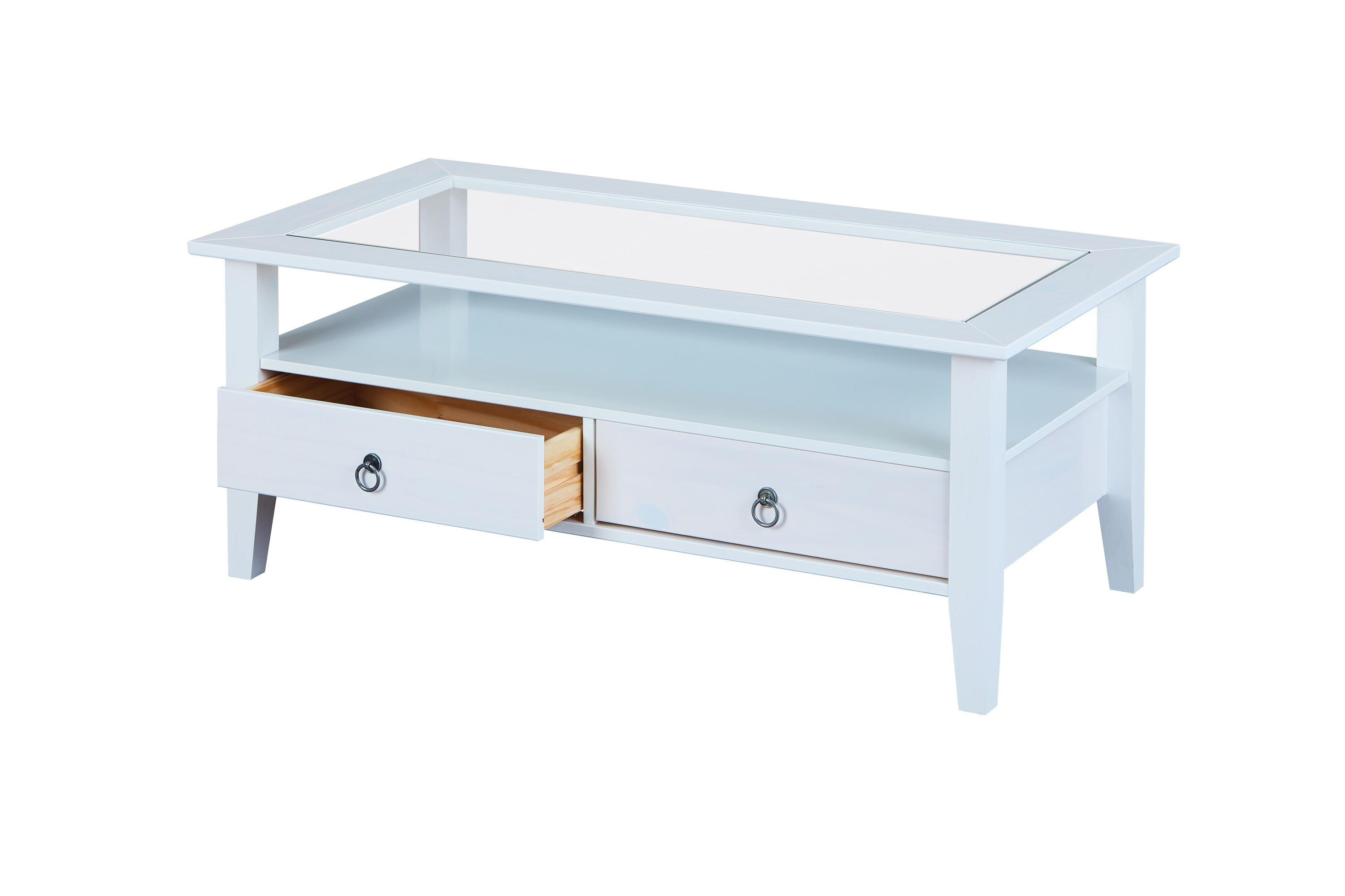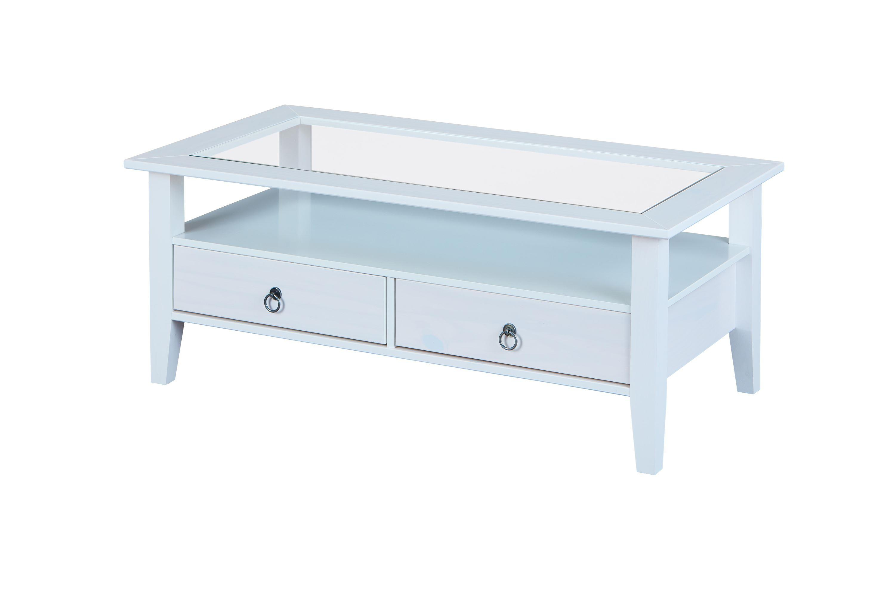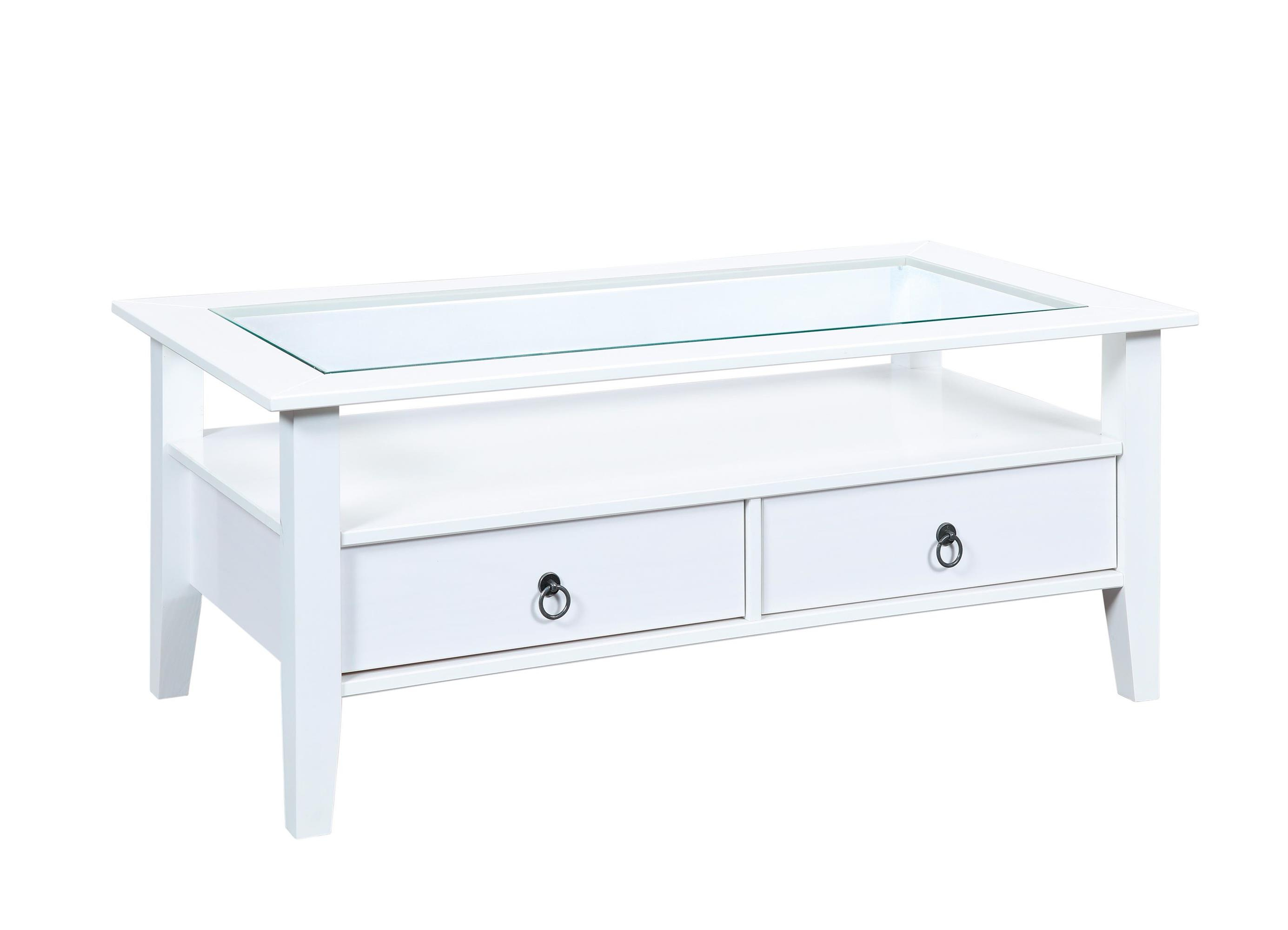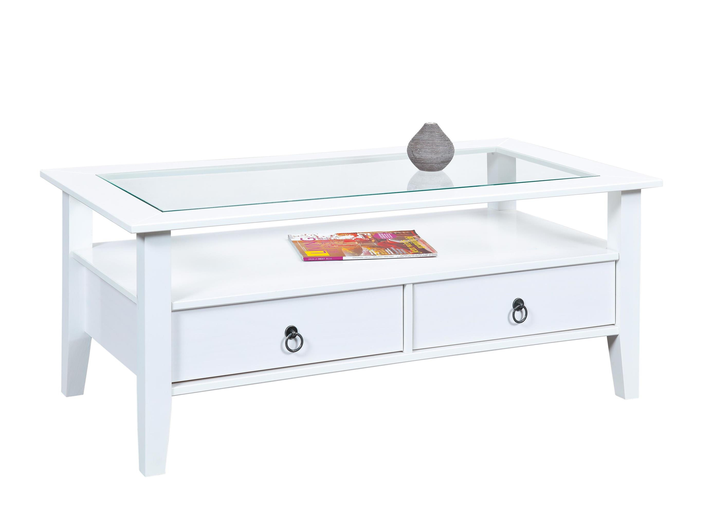 - Stolik kawowy z drewna sosnowego z blatem z bezpiecznego szkła. Stolik z dwiema szufladami i wnęką do przechowywania w kolorze białym w stylu nowoczesnym, skandynawskim.