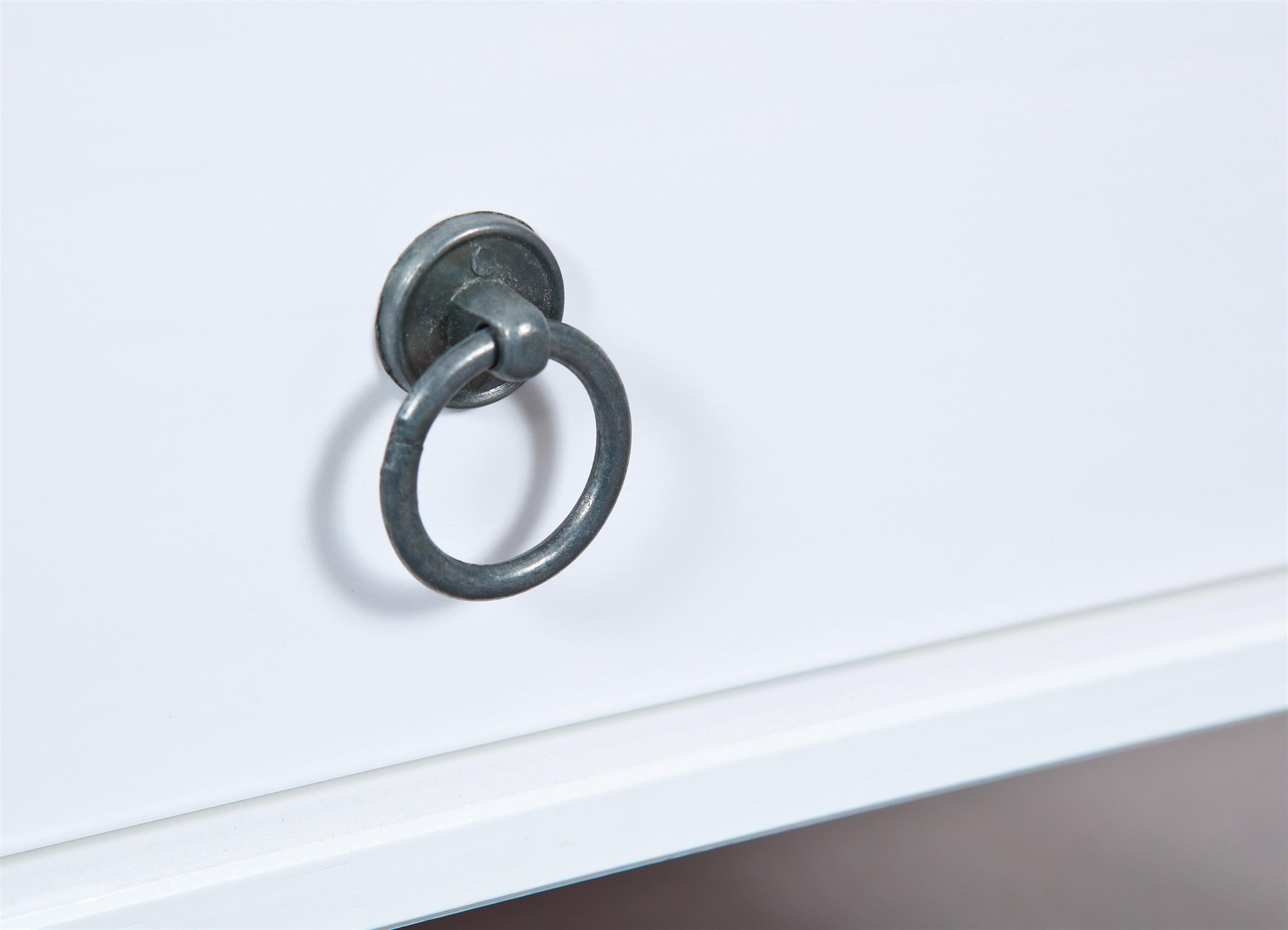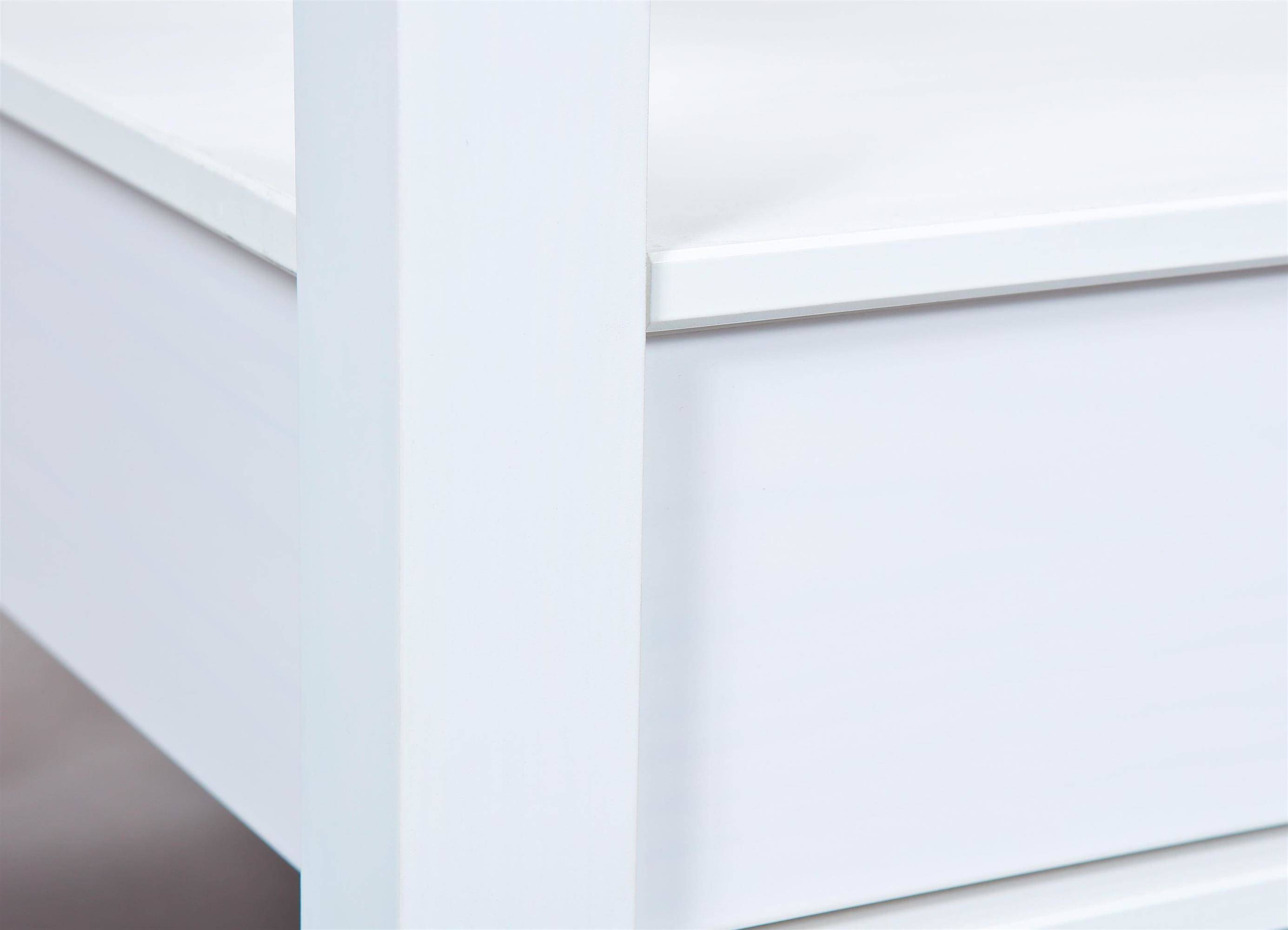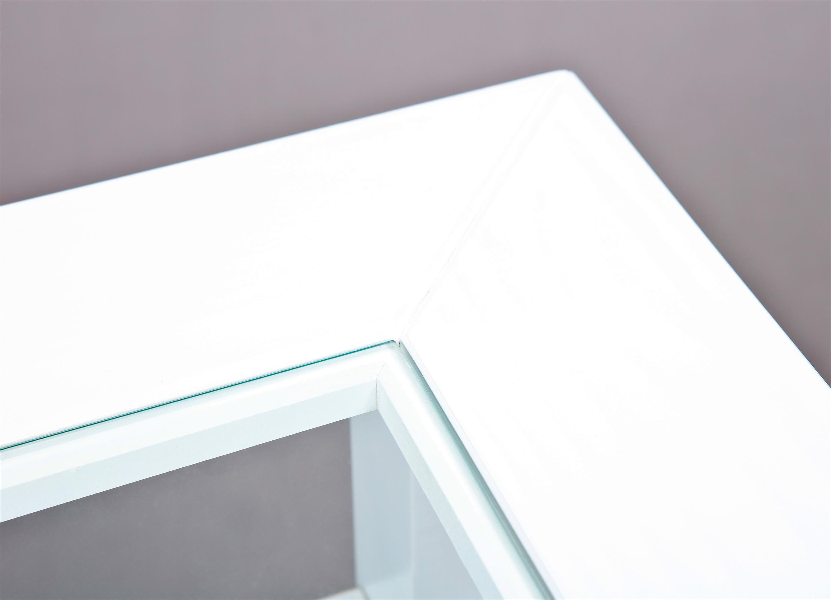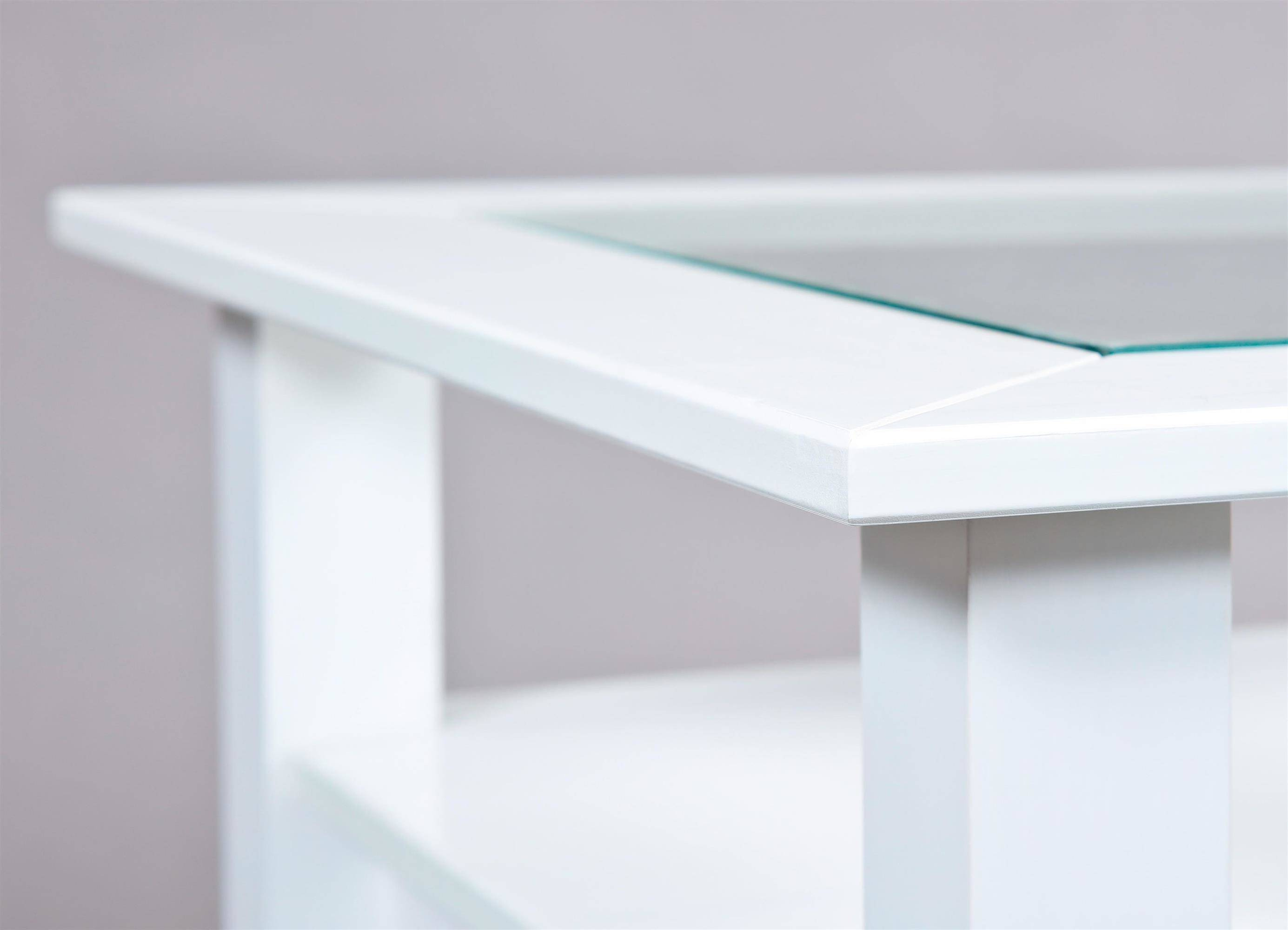 - Stolik kawowy z drewna sosnowego z blatem z bezpiecznego szkła. Stolik z dwiema szufladami i wnęką do przechowywania w kolorze białym w stylu nowoczesnym, skandynawskim.