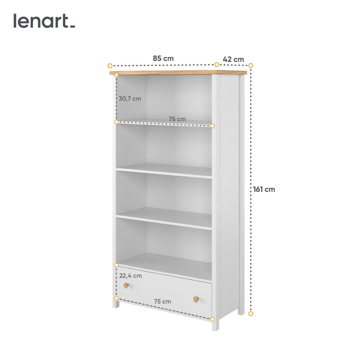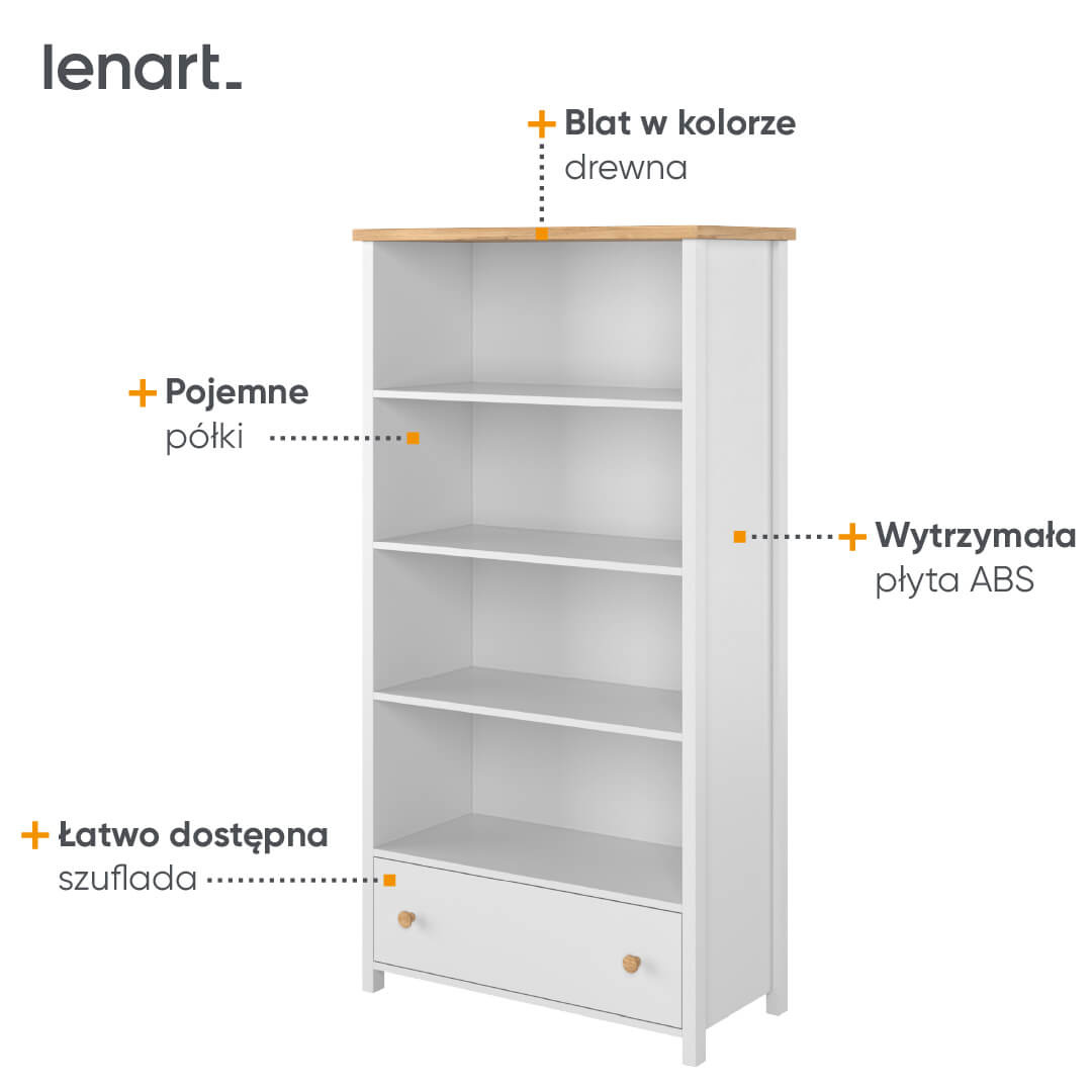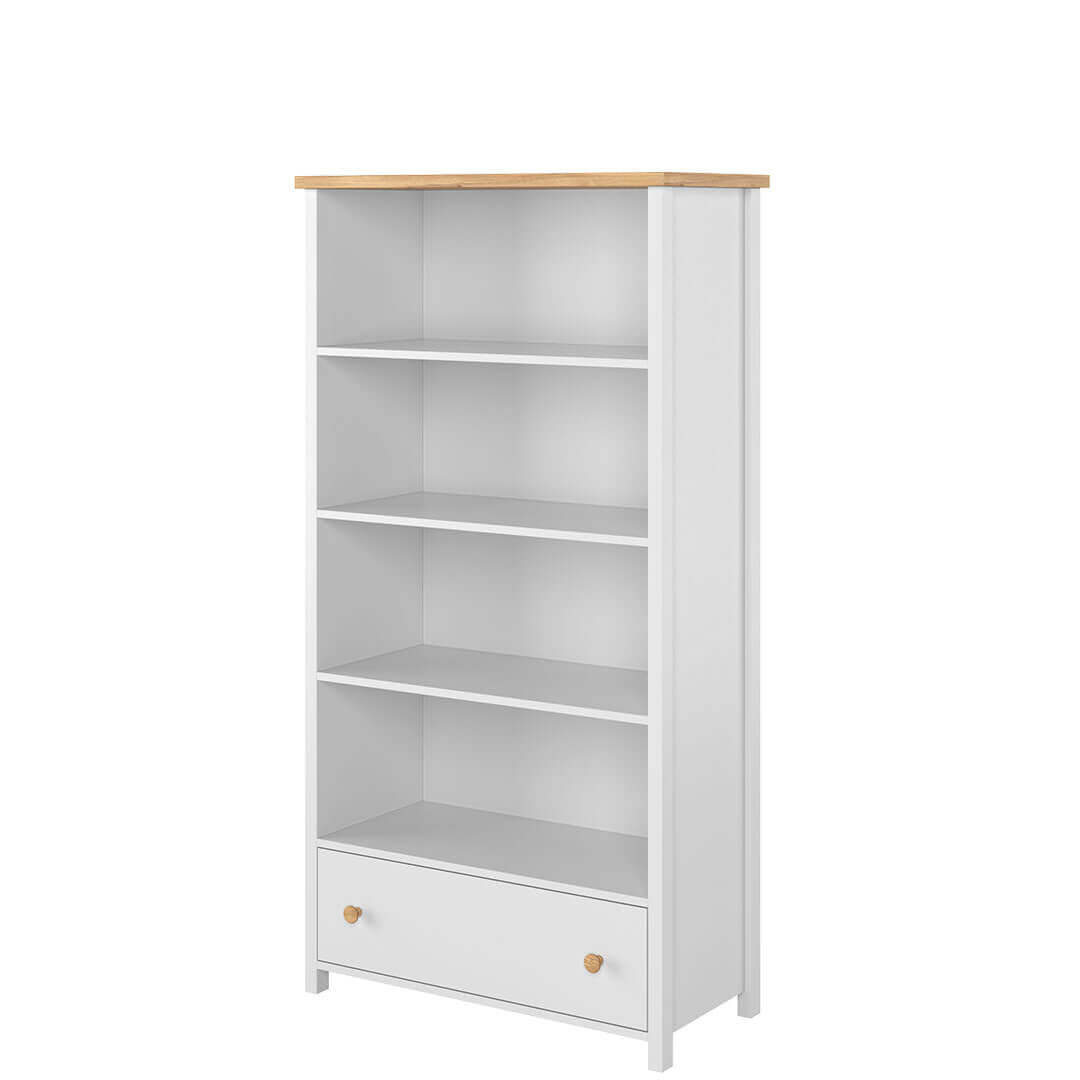 - Elegancki regał STORY SO-02 łączy biel z akcentami dębu nash, idealny dla subtelnych wnętrz. Wytrzymała konstrukcja z półkami i użyteczną szufladą uporządkuje przestrzeń w każdym pokoju.