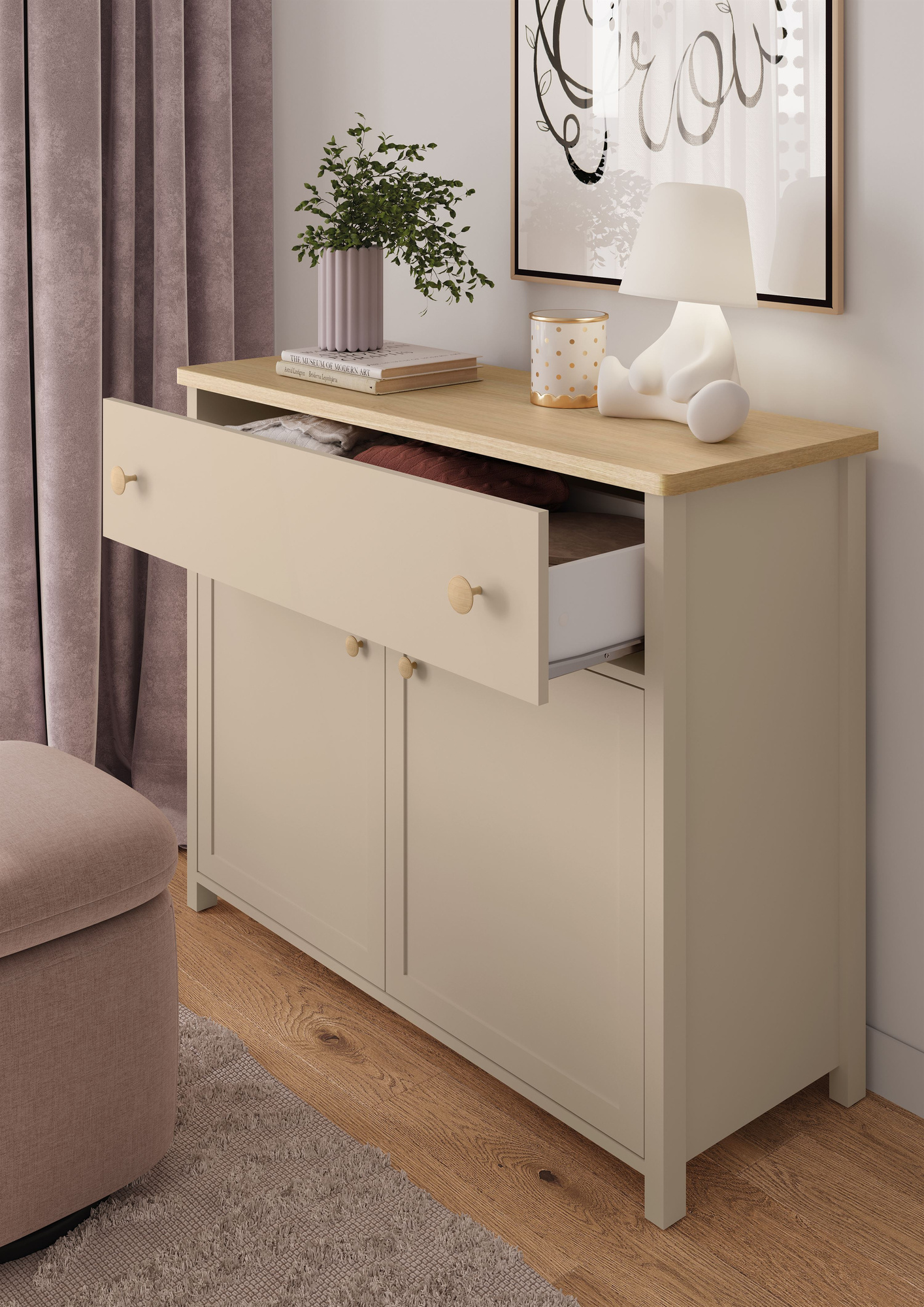 Zamontuj komodę STORY SO-05 w salonie, sypialni czy przedpokoju, aby zyskać dodatkowe miejsce do przechowywania. Jej dwie przestronne drzwi oraz jedna szuflada pomieszczą wszystkie potrzebne drobiazgi, a wizualna lekkość i harmonijna kolorystyka wprowadzą do wnętrza przytulny klimat. Dzięki niej stworzysz zadowalającą równowagę pomiędzy stylowym designem a codziennym użytkowaniem.