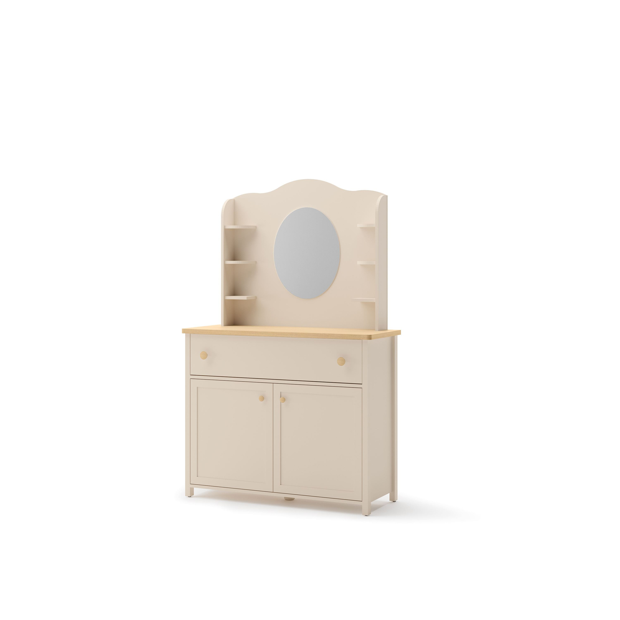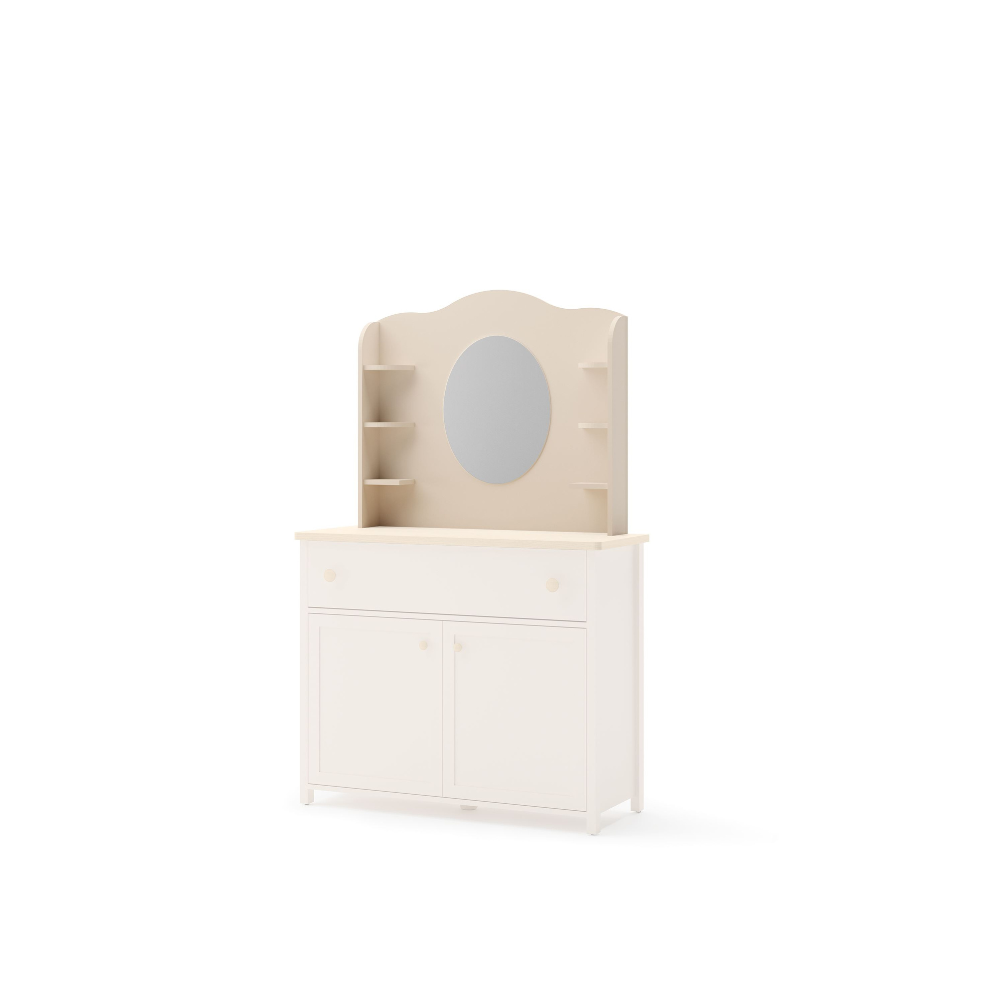 Kiedy myślisz o idealnym miejscu do codziennej pielęgnacji, STORY SO-06 spełnia wszystkie z wymagań. Wyposażona w eleganckie, duże lustro o owalnym kształcie, umożliwia komfortowe i dokładne przygotowanie się do każdego dnia. Oprócz lustra, toaletka posiada małe półeczki, które są idealne na kosmetyki, biżuterię lub inne ulubione dodatki, dzięki czemu wszystko, co potrzebne, masz zawsze pod ręką.