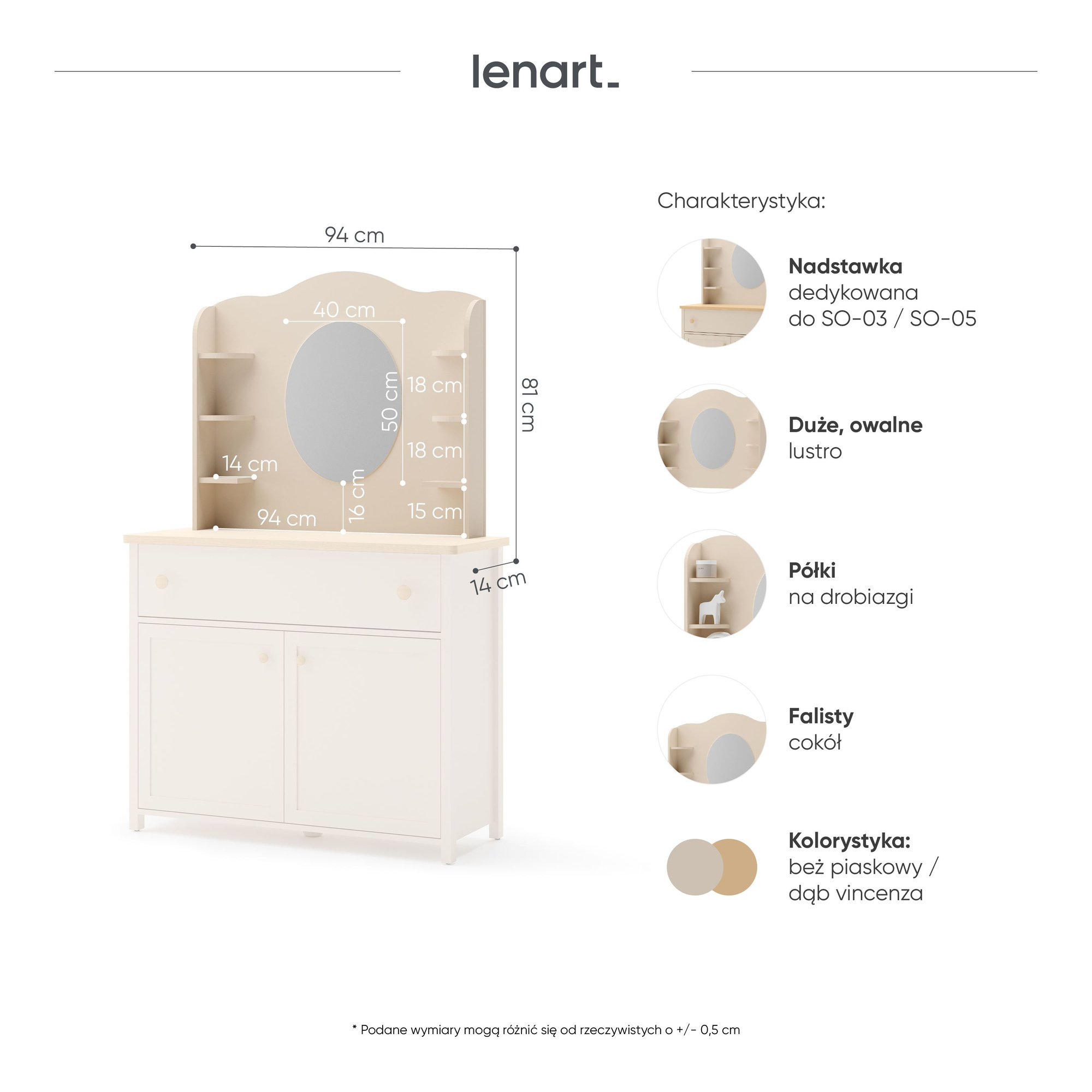 • Elegancka toaletka STORY SO-06 w odcieniu beżowym i dębie vincenza to idealny dodatek do Twojego wnętrza. Z dużym, owalnym lustrem i praktycznymi półkami na kosmetyki, łączy funkcjonalność z nowoczesnym stylem. Wykonana z wytrzymałej płyty laminowanej.