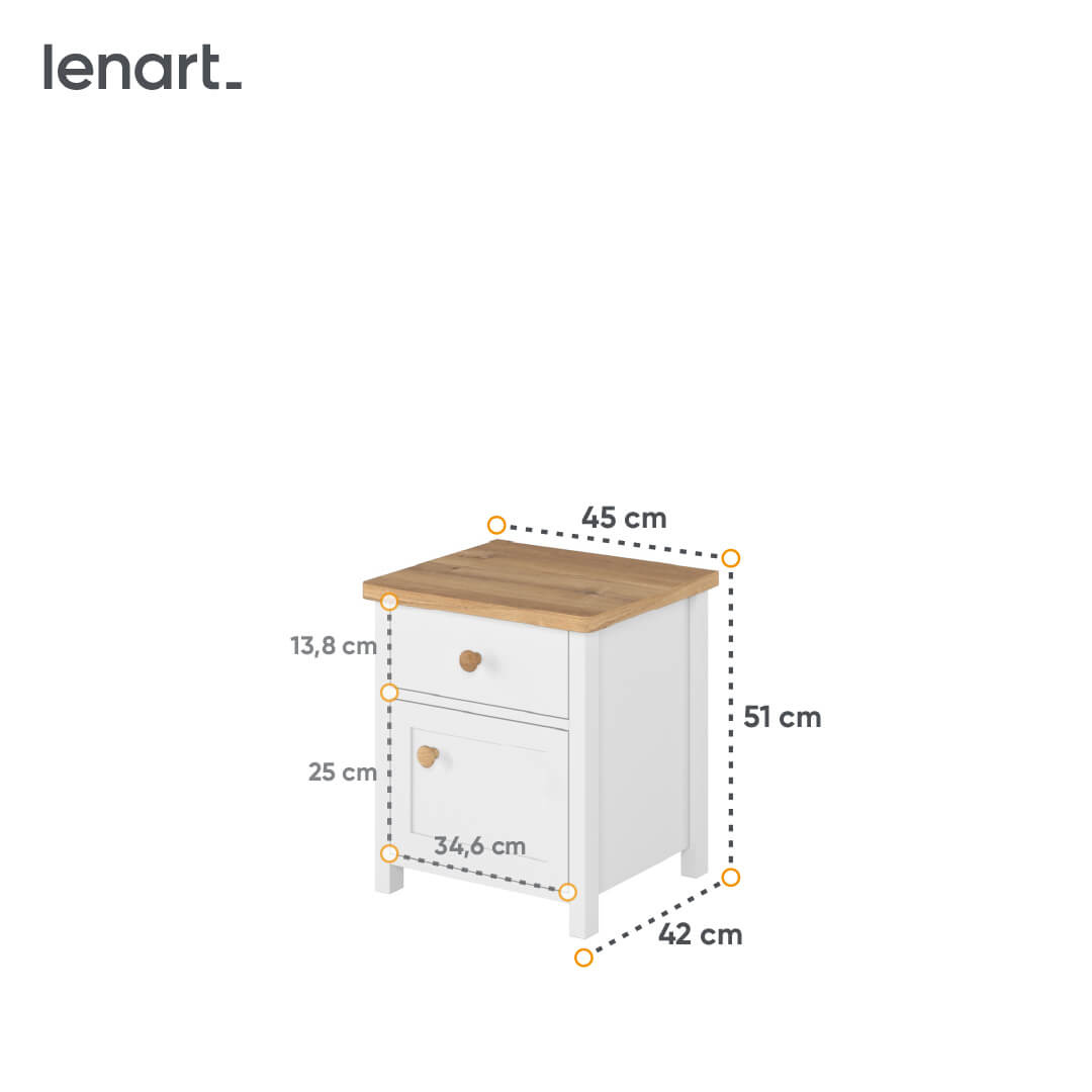 - Stolik nocny STORY SO-07 w kolorze biały/dąb nash to idealne rozwiązanie do przechowywania z wygodną szufladą i drzwiczkami. Nowoczesny design i kompaktowe wymiary (45x51x42 cm) doskonale wpasują się w każdą sypialnię.