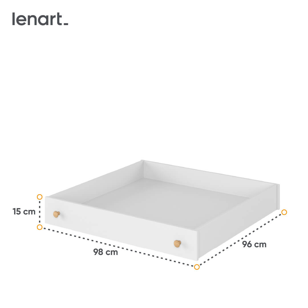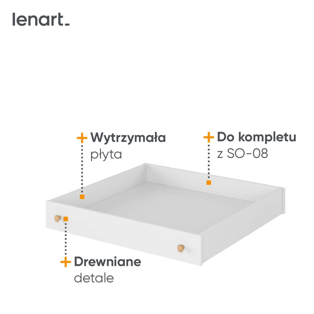 - Praktyczna szuflada STORY SO-09 w kolorze biały/dąb nash pozwala efektywnie wykorzystać miejsce pod łóżkiem SO-08, przechowując pościel czy dodatki. Nowoczesny design i wymiary: 98x15x96 cm, wykonanie: wytrzymała płyta laminowana.