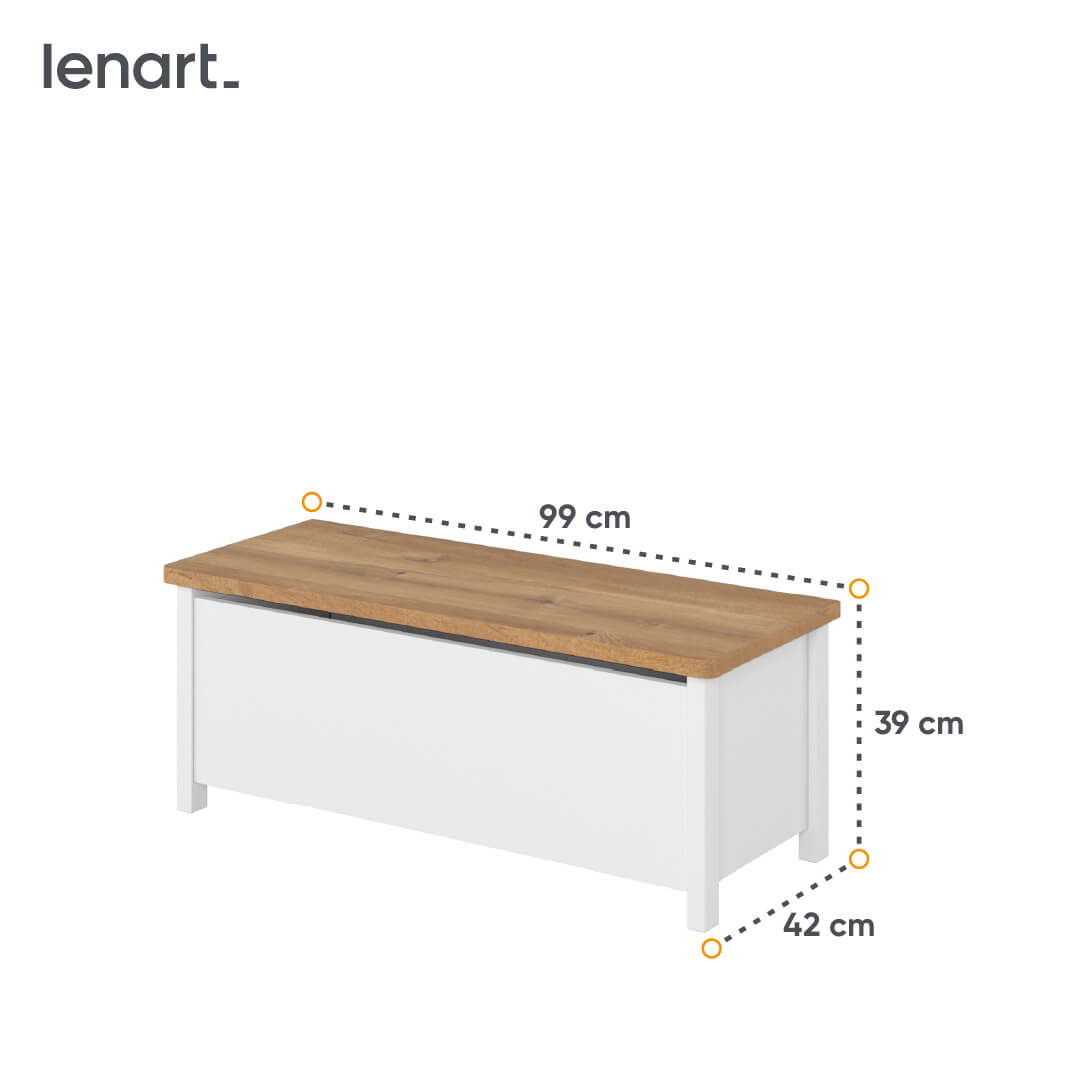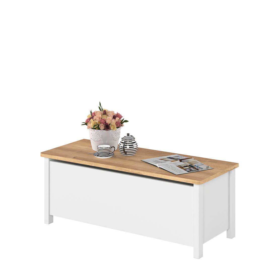 - Multifunkcyjna skrzynia STORY SO-10 w kolorze biało-dębowym to idealne miejsce do przechowywania zabawek czy tekstyliów. Gazowy podnośnik ułatwia dostęp, a elegancki design sprawia, że może pełnić rolę stolika lub siedziska.