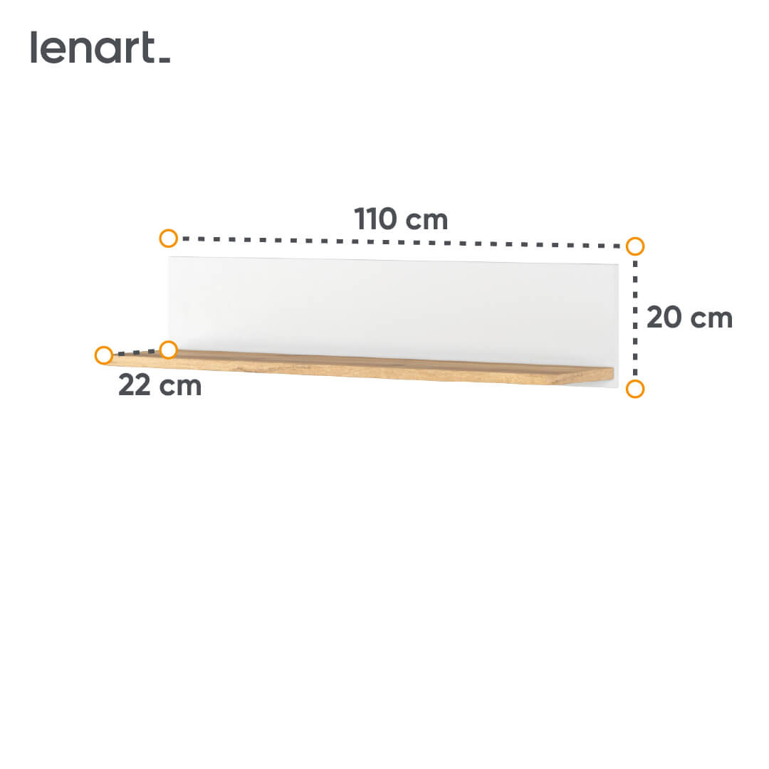 - Nowoczesna półka wisząca STORY SO-14 w odcieniu biały/dąb nash - idealna do pokojów młodzieżowych czy sypialni. Wytrzymała konstrukcja, udźwig do 5 kg, wymiary: 110x20x22 cm.