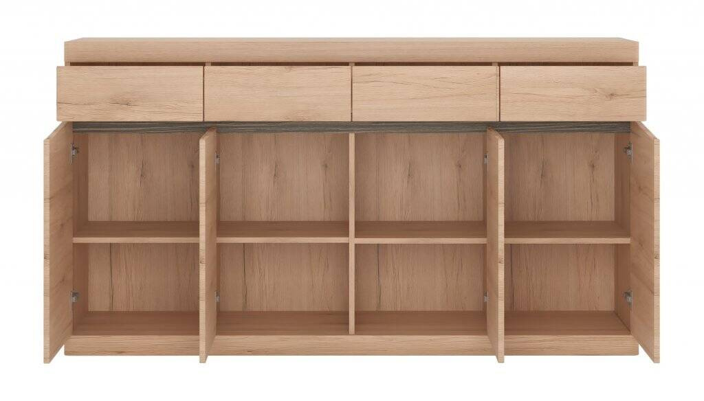 Z dumą przedstawiamy mebel, który swoimi wymiarami - szerokość 168 cm, wysokość 92,1 cm oraz głębokość 39,9 cm - jest stworzony do dużej liczby przedmiotów, od dekoracji po wszelkie niezbędne akcesoria. Przemyślana konstrukcja oferuje cztery pojemne szuflady oraz cztery drzwi, za którymi ukryć można wszystko, co chcesz zachować z dala od wzroku gości, dbając jednocześnie o porządek i estetykę pomieszczenia.