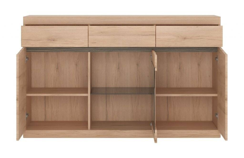 Wymiary witryny Summer TYP 43 - szerokość 150 cm, wysokość 92,1 cm oraz głębokość 39,9 cm - gwarantują znakomitą pojemność i funkcjonalność. Komoda wyposażona jest w sześć przestronnych półek, z czego cztery są elegancko ukryte za pełnymi frontami, tworząc idealną przestrzeń na rzeczy, które wolisz mieć poza zasięgiem wzroku. Dwie dodatkowe półki za frontem przeszklonym umożliwiają eksponowanie dekoracji czy zastawy, co czyni mebel niezwykle praktycznym rozwiązaniem.