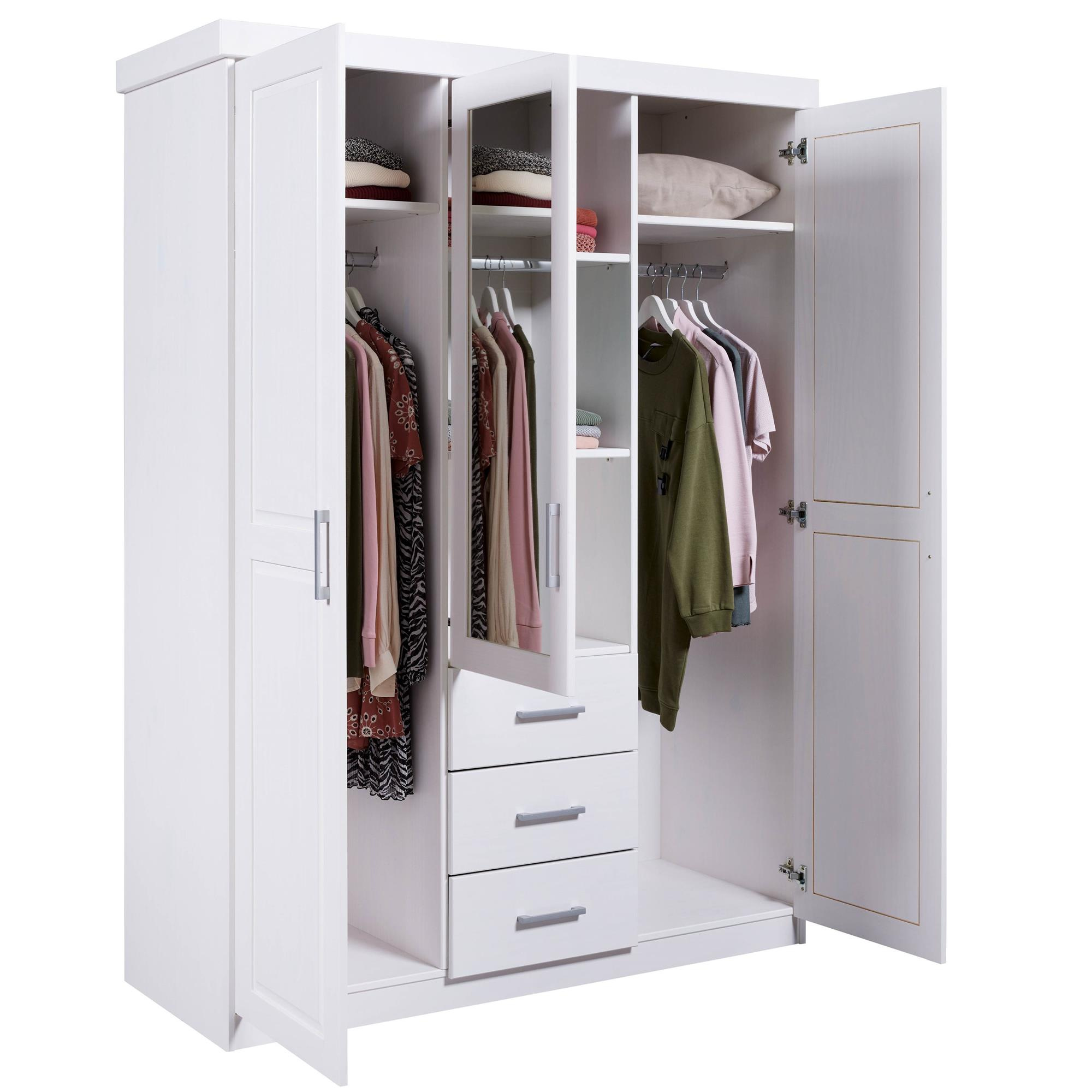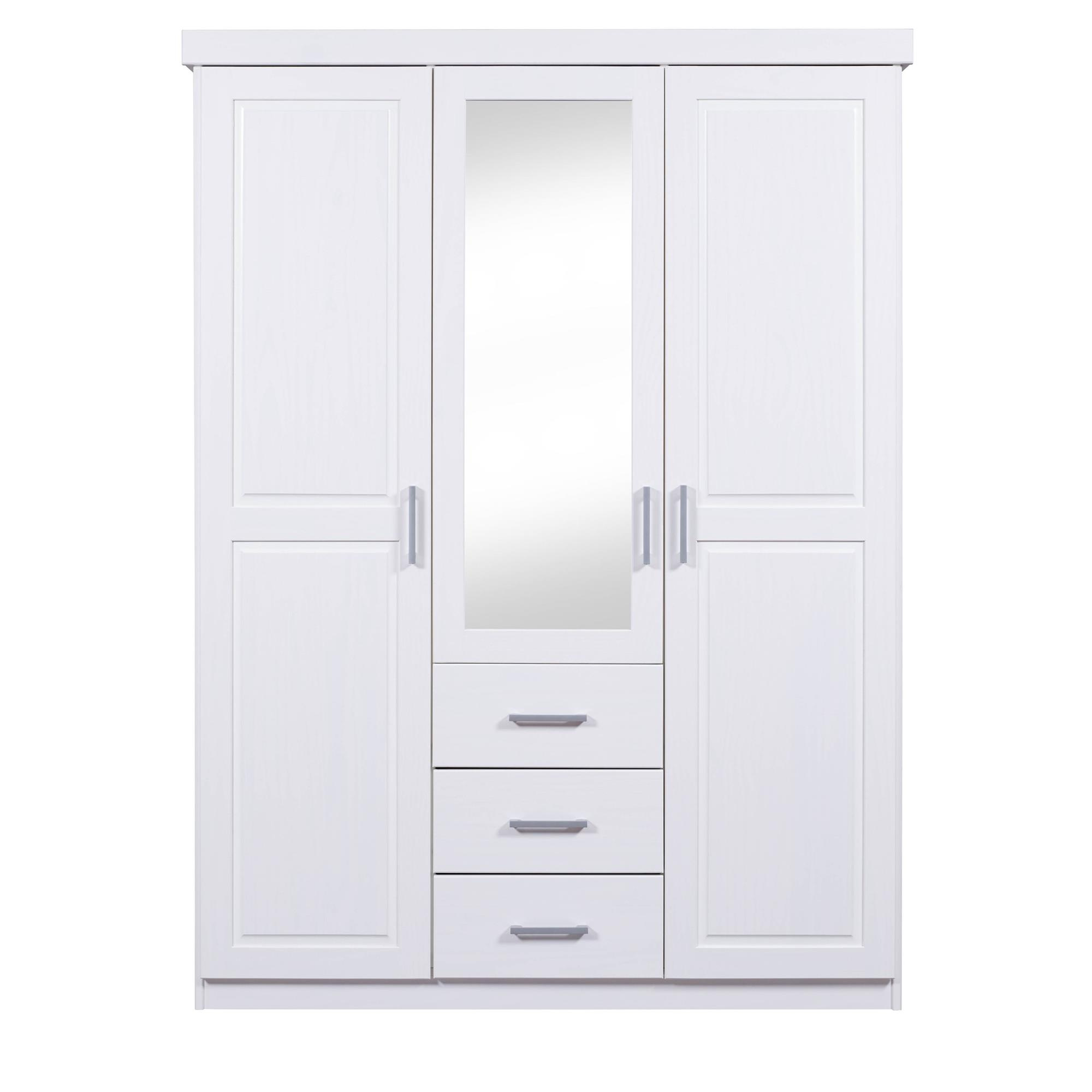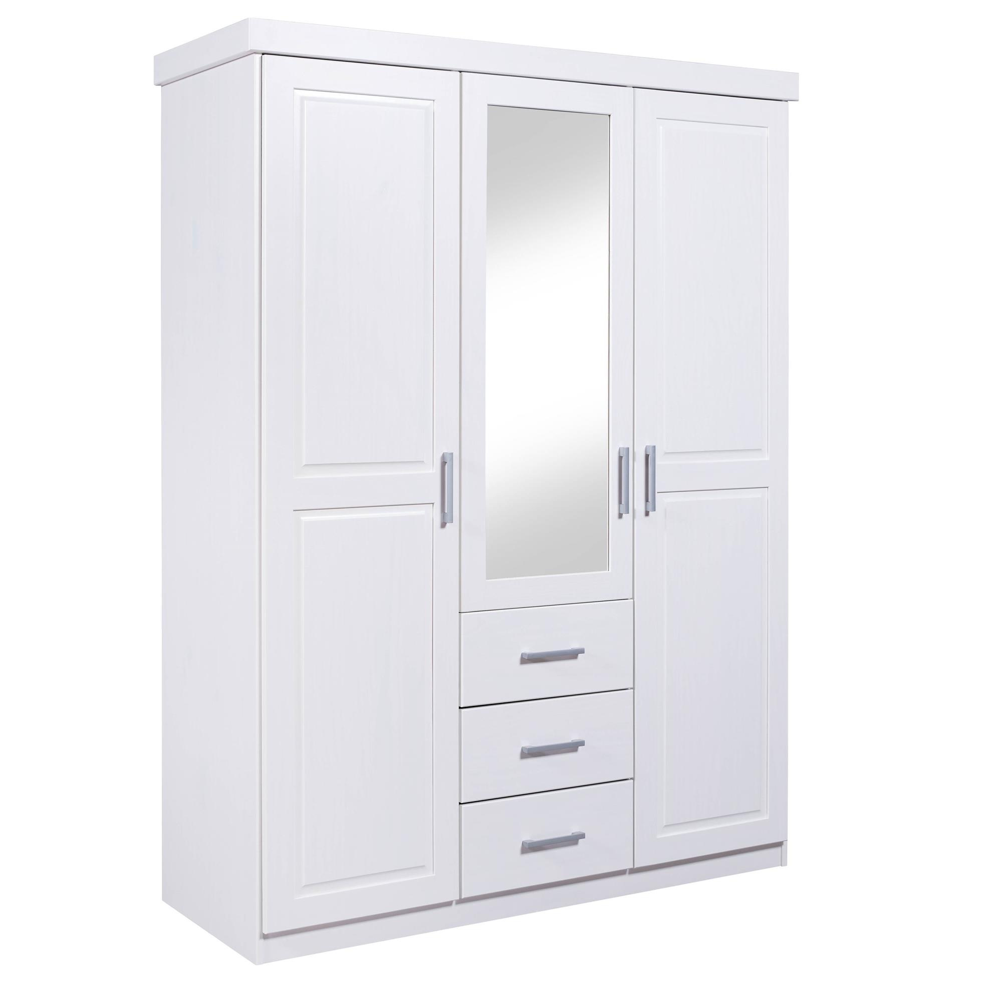- Szafa z drewna sosnowego o szerokości 140 cm z trojgiem drzwiczek, czterema półkami i trzema szufladami w kolorze białym.