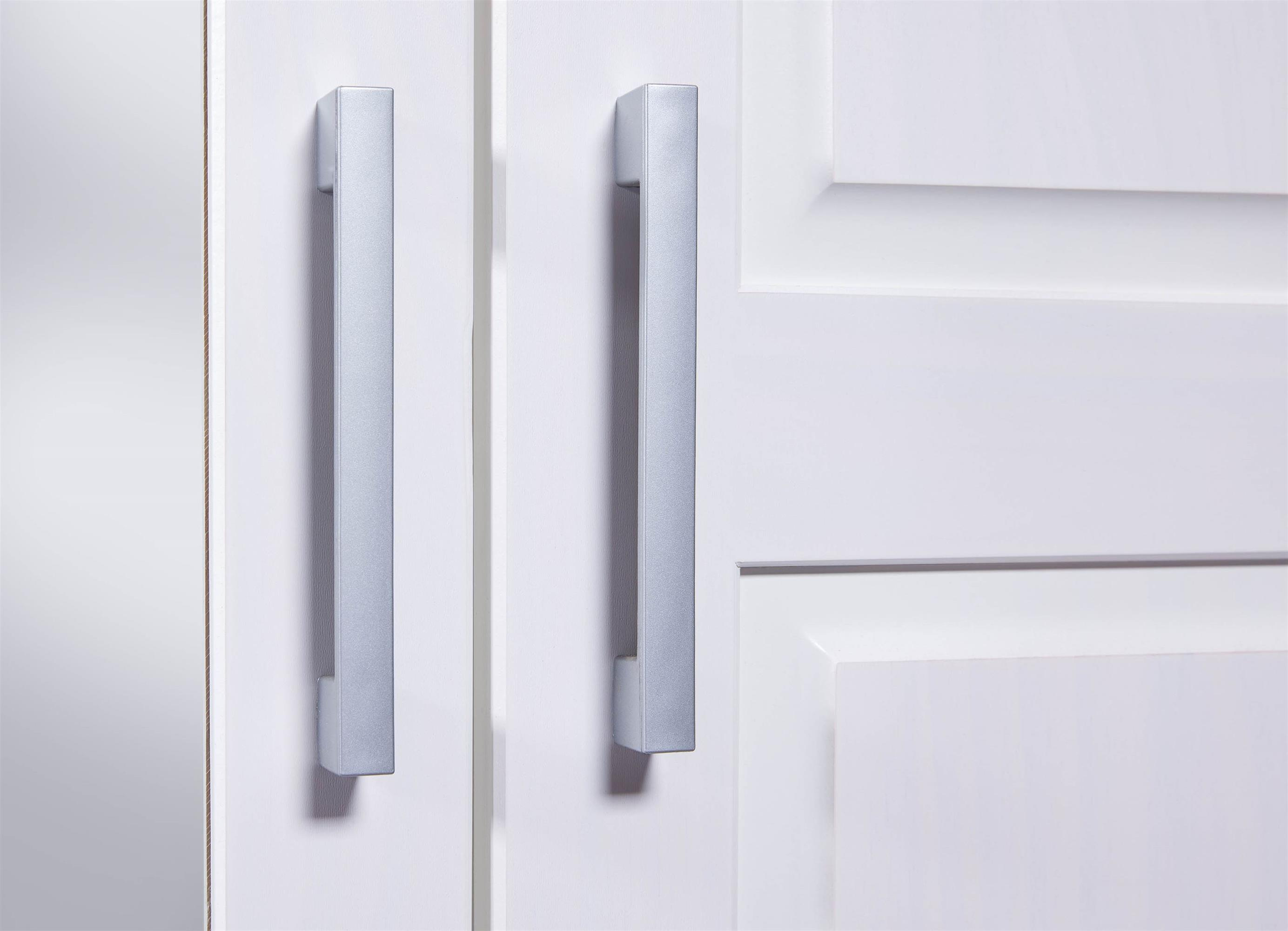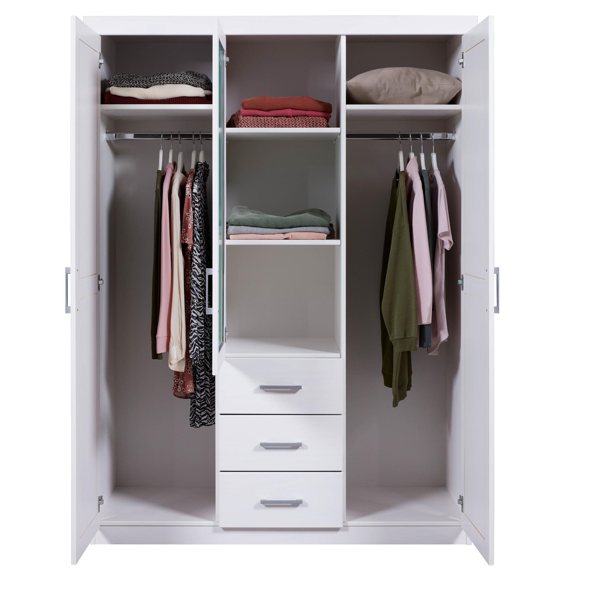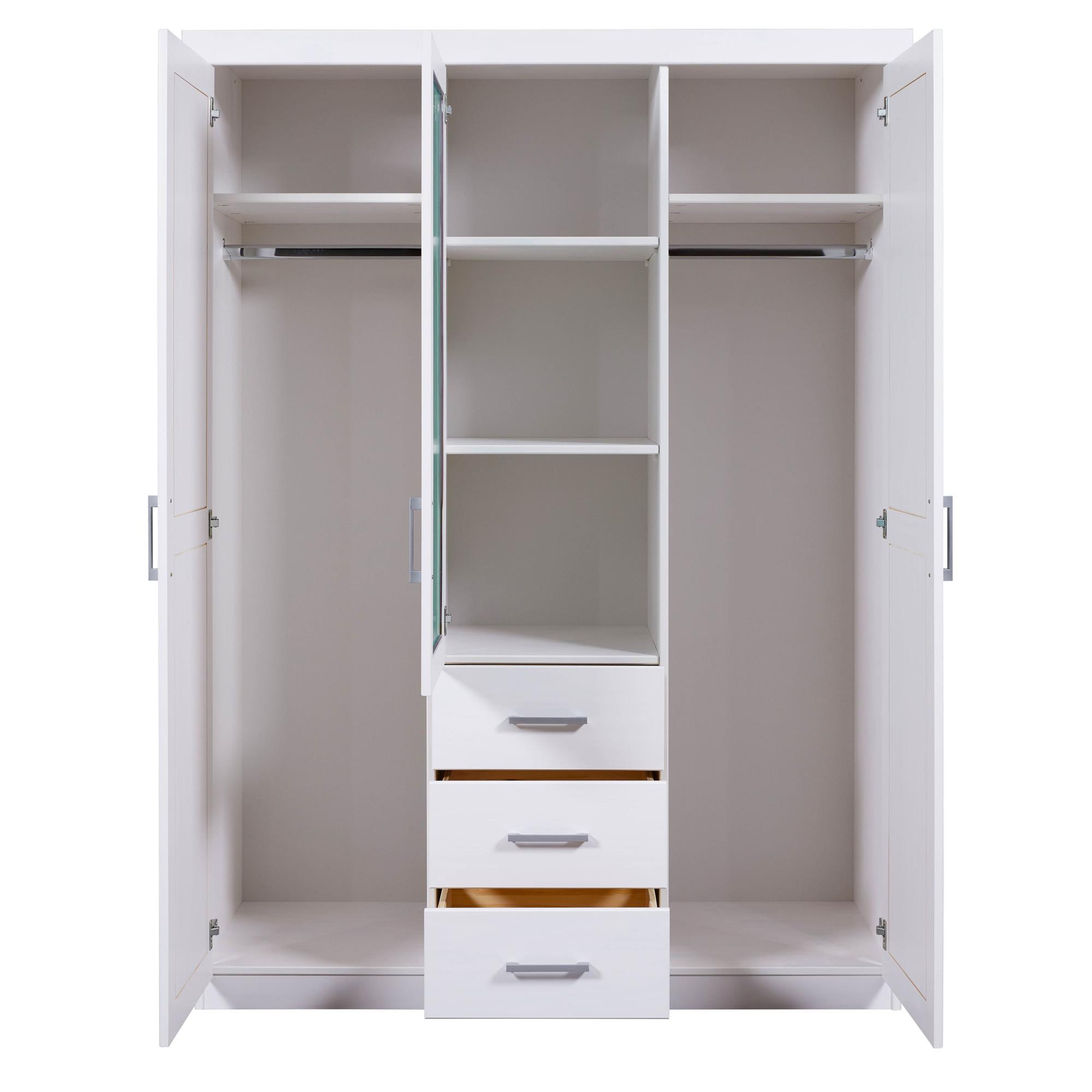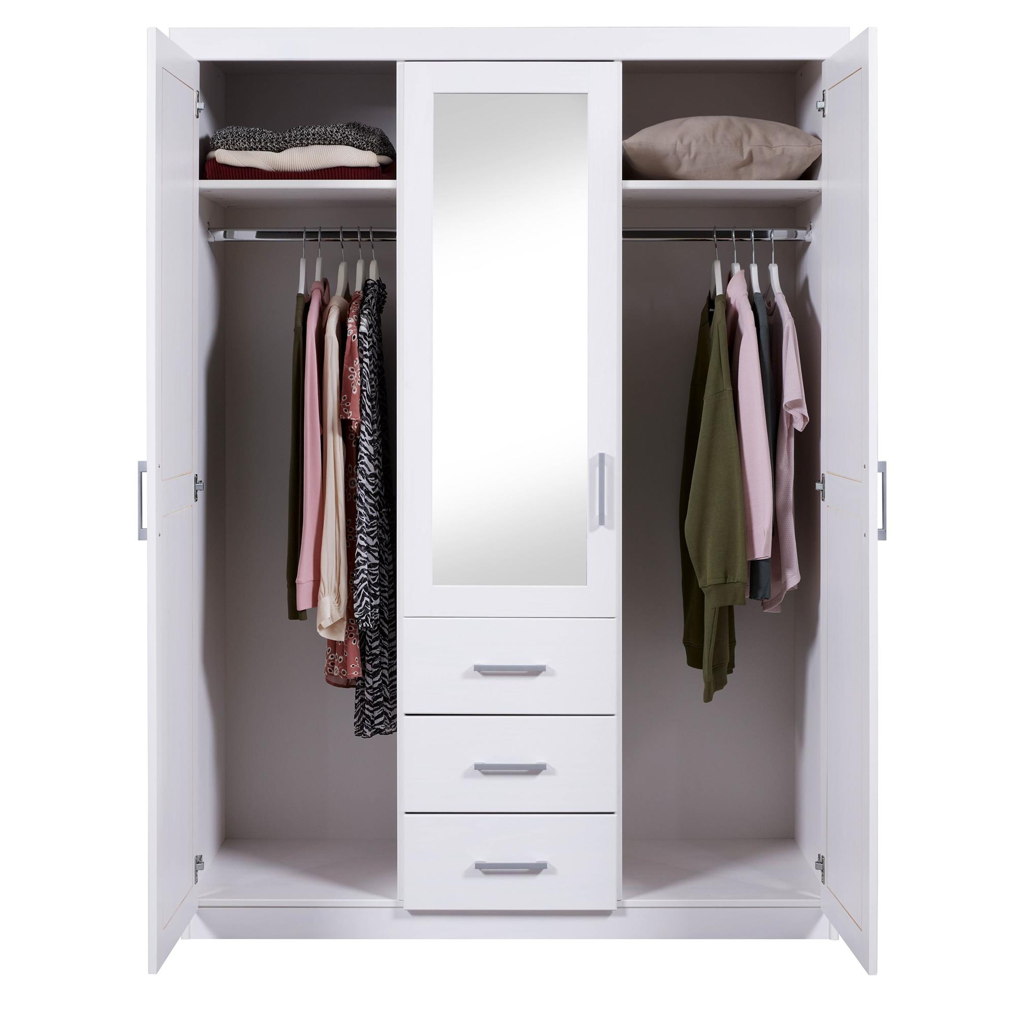 - Szafa z drewna sosnowego o szerokości 140 cm z trojgiem drzwiczek, czterema półkami i trzema szufladami w kolorze białym.