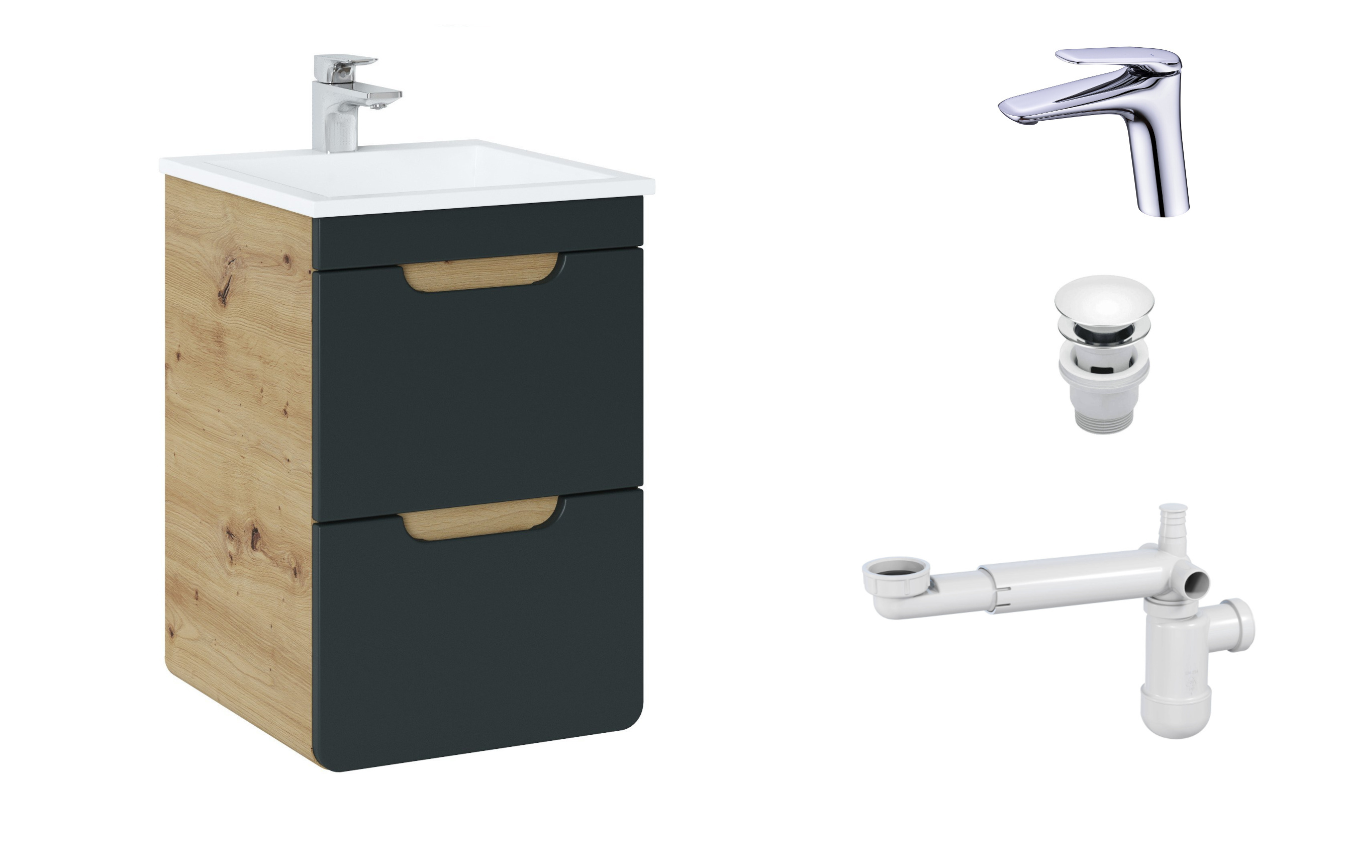 - Szafka 40 cm Aruba Cosmos z umywalką z dwiema szufladami i systemem cichego domykania w zestawie z baterią, korkiem i syfonem.