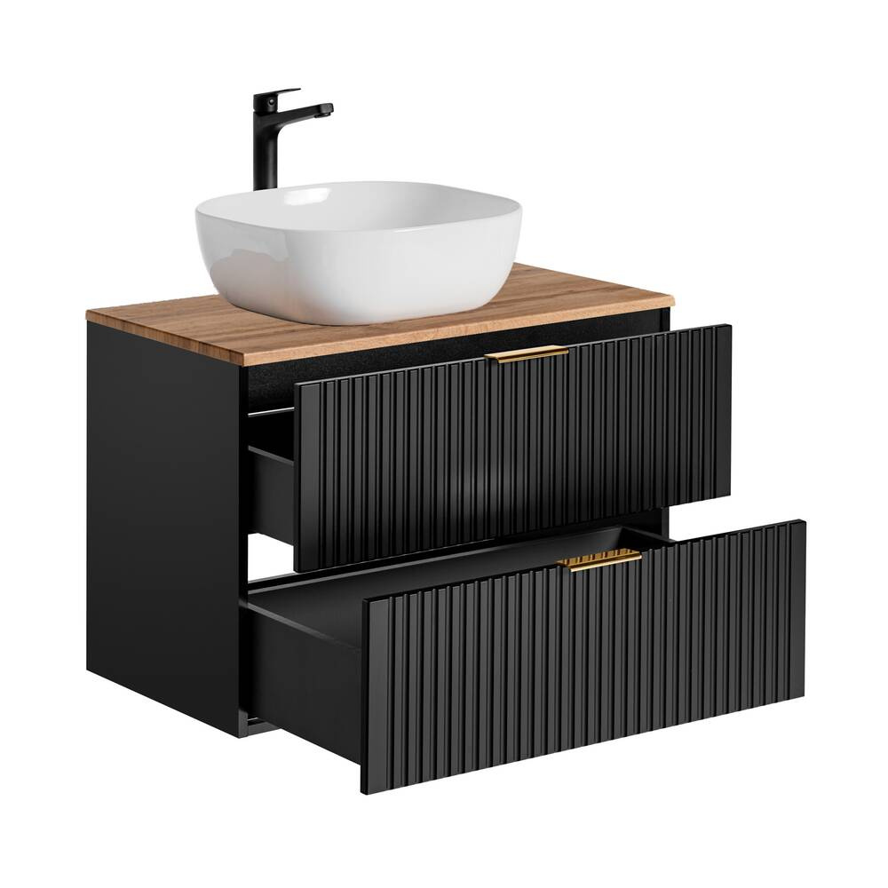 - Kompletny zestaw łazienkowy ADEL BLACK od Comad, zawiera szafkę (80x46x57 cm) z dwoma szufladami i cichym domykiem, blat Łazienkowy Wotan oraz nowoczesną, nablatową umywalkę ceramiczną Smile. Wykończenie w matowej czerni zapewnia elegancję i styl.
