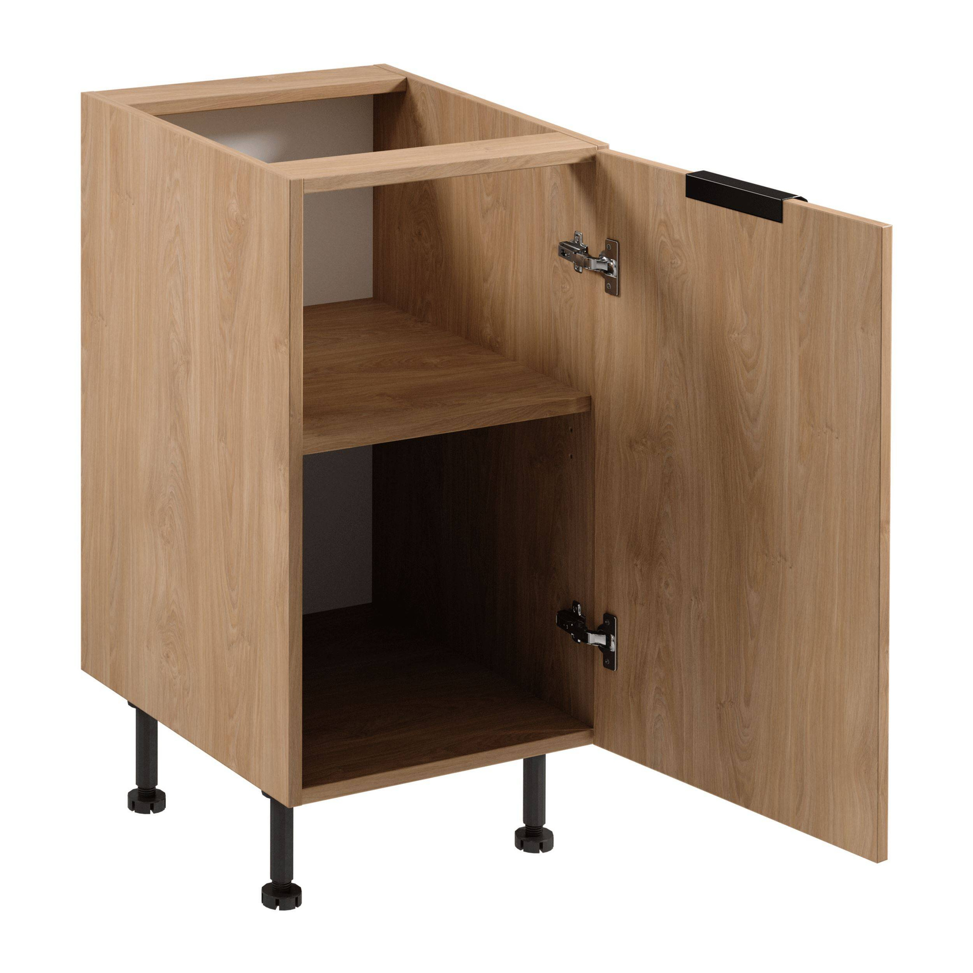 Szafka kuchenna dolna Sorento w kolorze Puccini to elegancja i funkcjonalność. Wykonana z odpornej płyty laminowanej. Metalowy czarny uchwyt oraz zawiasy Clip-On z cichym domykiem dodają uroku. Regulowane nóżki ułatwiają dopasowanie.