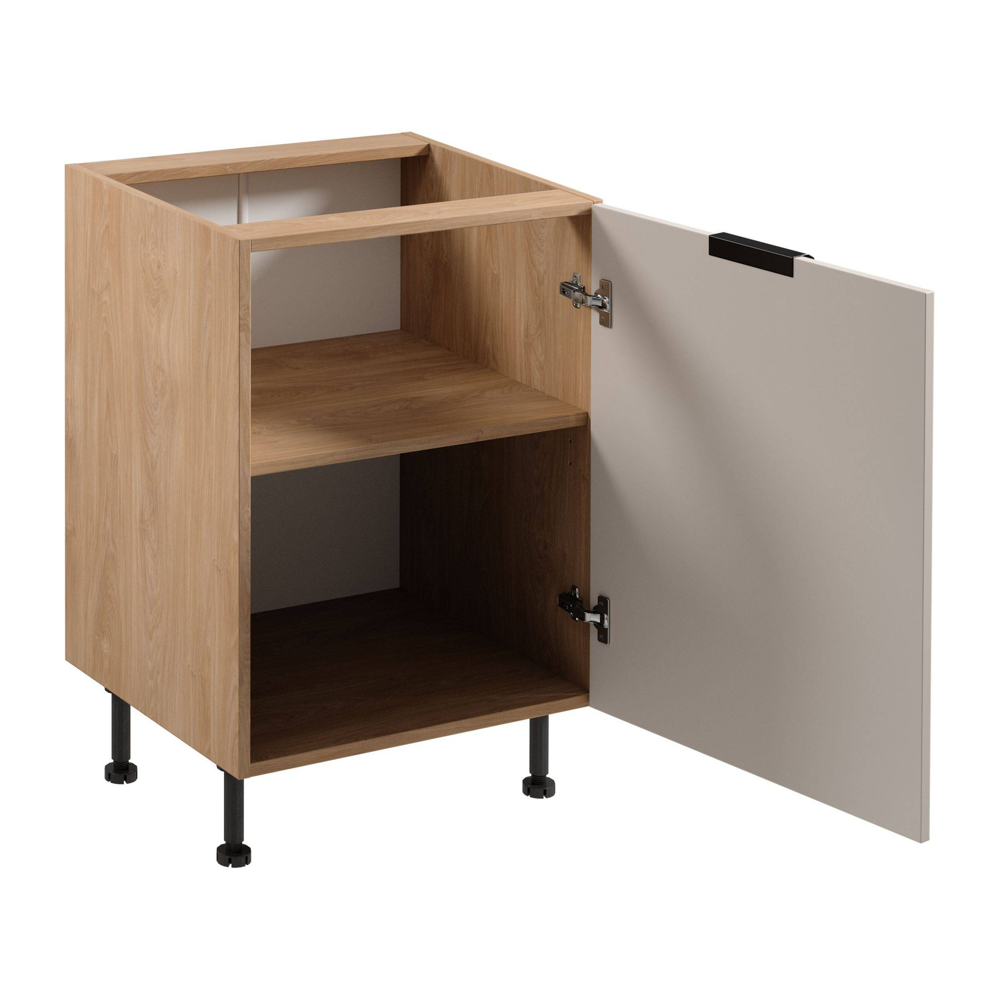 Szafka kuchenna Dolna Sorento D60 Gała Meble to elegancja w beżowym macie. Wykonana z trwałej płyty laminowanej, posiada metalowy uchwyt w czerni. Zawiasy Clip-On z cichym domykiem, regulowane nóżki, łatwy montaż. Idealna do nowoczesnych kuchni.