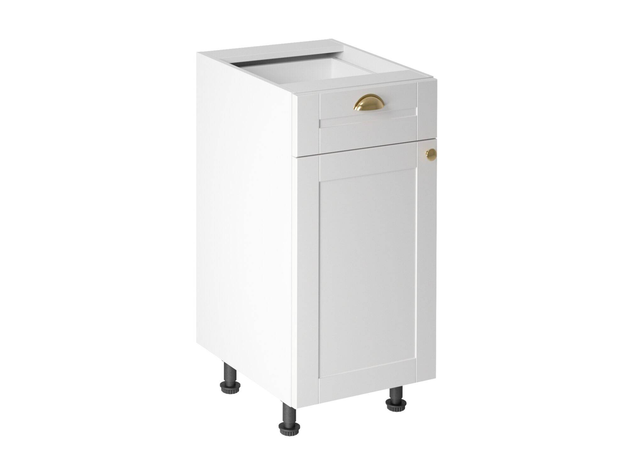 - Elegancka szafka kuchenna Linea White D40S1 w białym macie. Front z płyty MDF z cichym domykiem. Złote metalowe uchwyty dodają luksusu. Regulowane nóżki i łatwość montażu. Idealna do nowoczesnych kuchni.