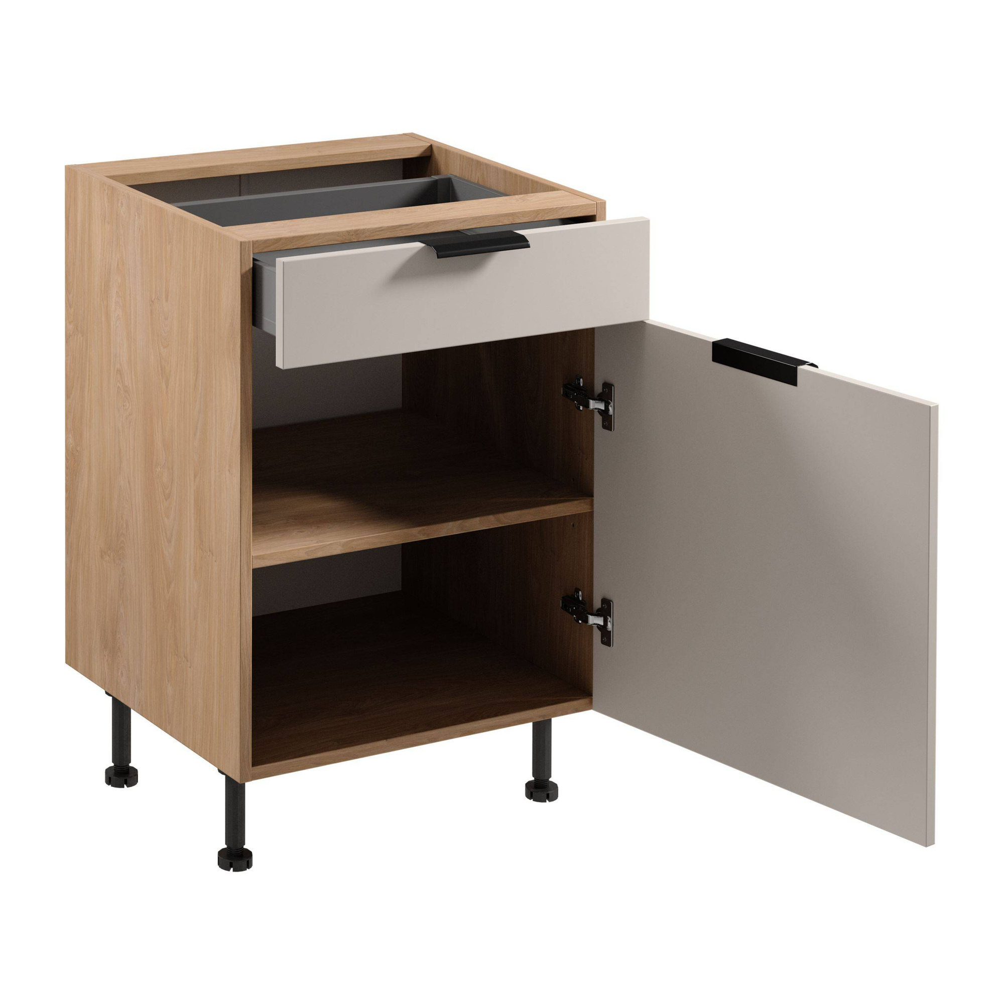Elegancka szafka Sorento w beżowym macie z czarnymi metalowymi uchwytami. Wykończona laminatem, odporna na uszkodzenia. Wyposażona w półkę i szufladę z pełnym wysuwem, cichym domykiem dla komfortu. Regulowane nóżki ułatwiają ustawienie.