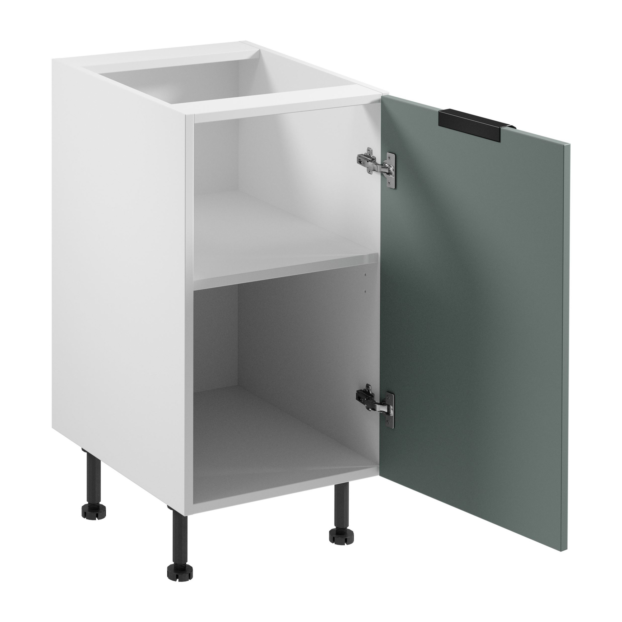 Stylowa szafka kuchenna Dolna 1S Sorento łączy elegancki zielony mat z białym korpusem. Wykonana z odpornej na uszkodzenia płyty laminowanej, z regulowanymi nogami i cichym domykiem zawiasów. Idealna do nowoczesnej kuchni! Montaż samodzielny.