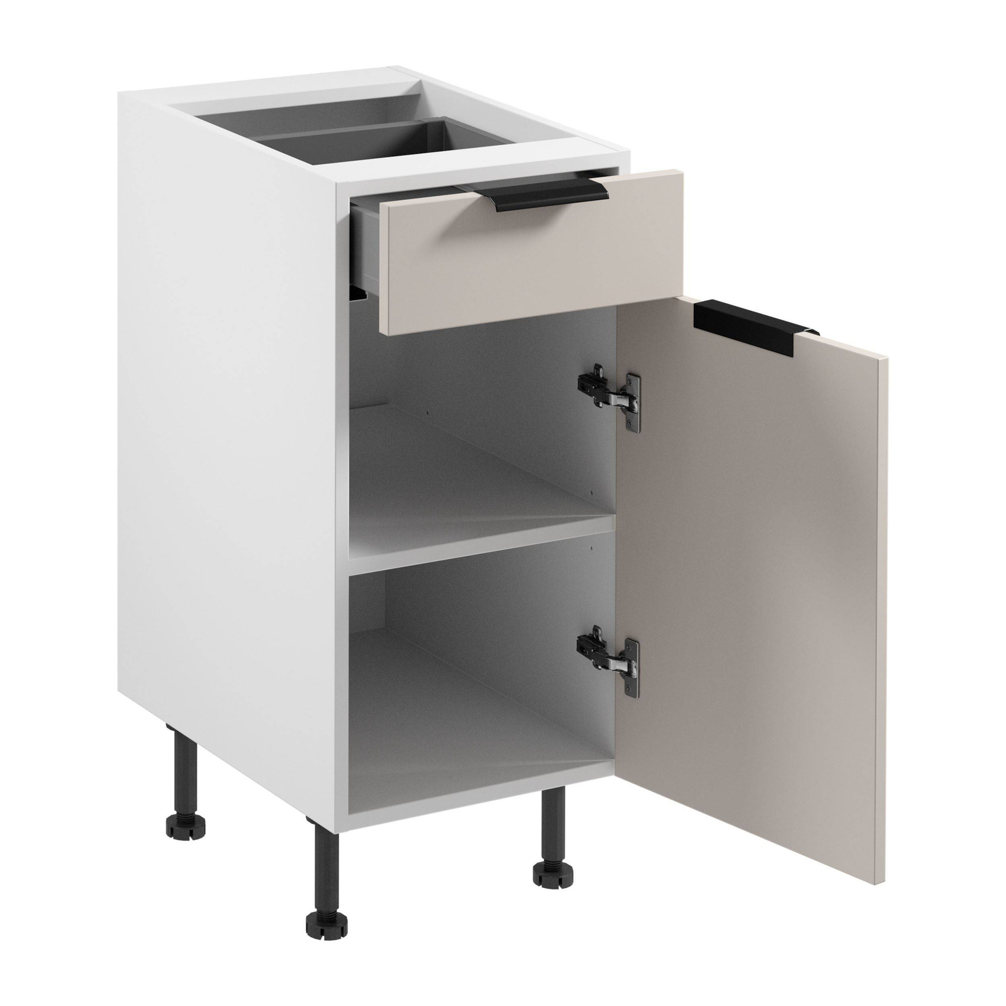 - Szafka kuchenna Sorento D40S1 łączy beżowy matowy front z białym korpusem. Laminowana płyta, metalowe uchwyty i cichy domyk gwarantują trwałość i funkcjonalność. Regulowane nóżki i pełny wysuw szuflad dodają praktyczności. Idealna do nowoczesnych wnętrz!