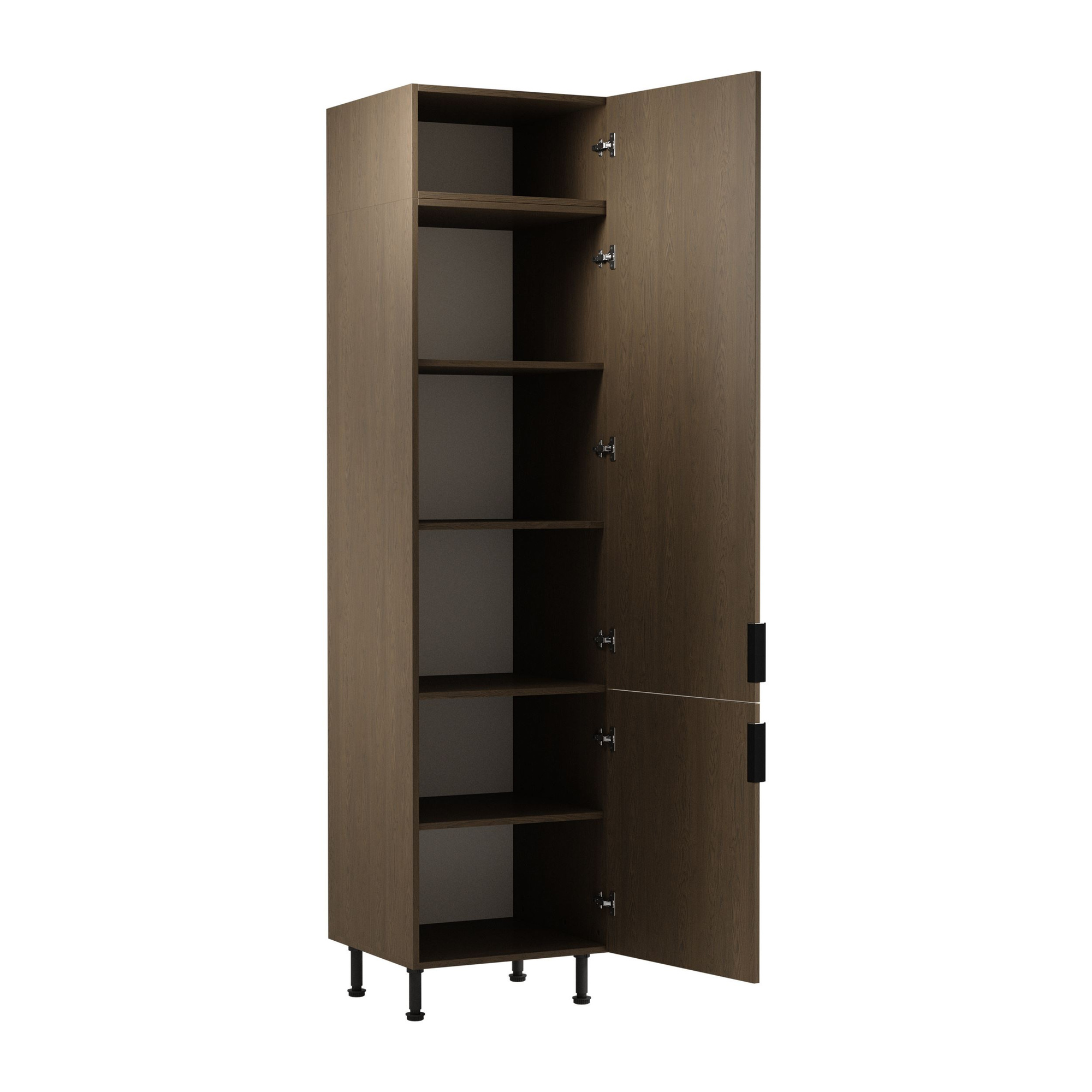 Funkcjonalność tego mebla podkreśla przemyślana konstrukcja, która zawiera aż pięć półek, idealnych do organizacji akcesoriów kuchennych i produktów spożywczych. Ciche domykanie zawiasów typu Clip-On gwarantuje komfort użytkowania, eliminując hałas, co jest szczególnie istotne w dynamicznej kuchennej przestrzeni. Oprócz tego, wysokie nóżki o regulowanej wysokości zapewniają wygodny dostęp oraz możliwość dostosowania szafki do indywidualnych potrzeb.