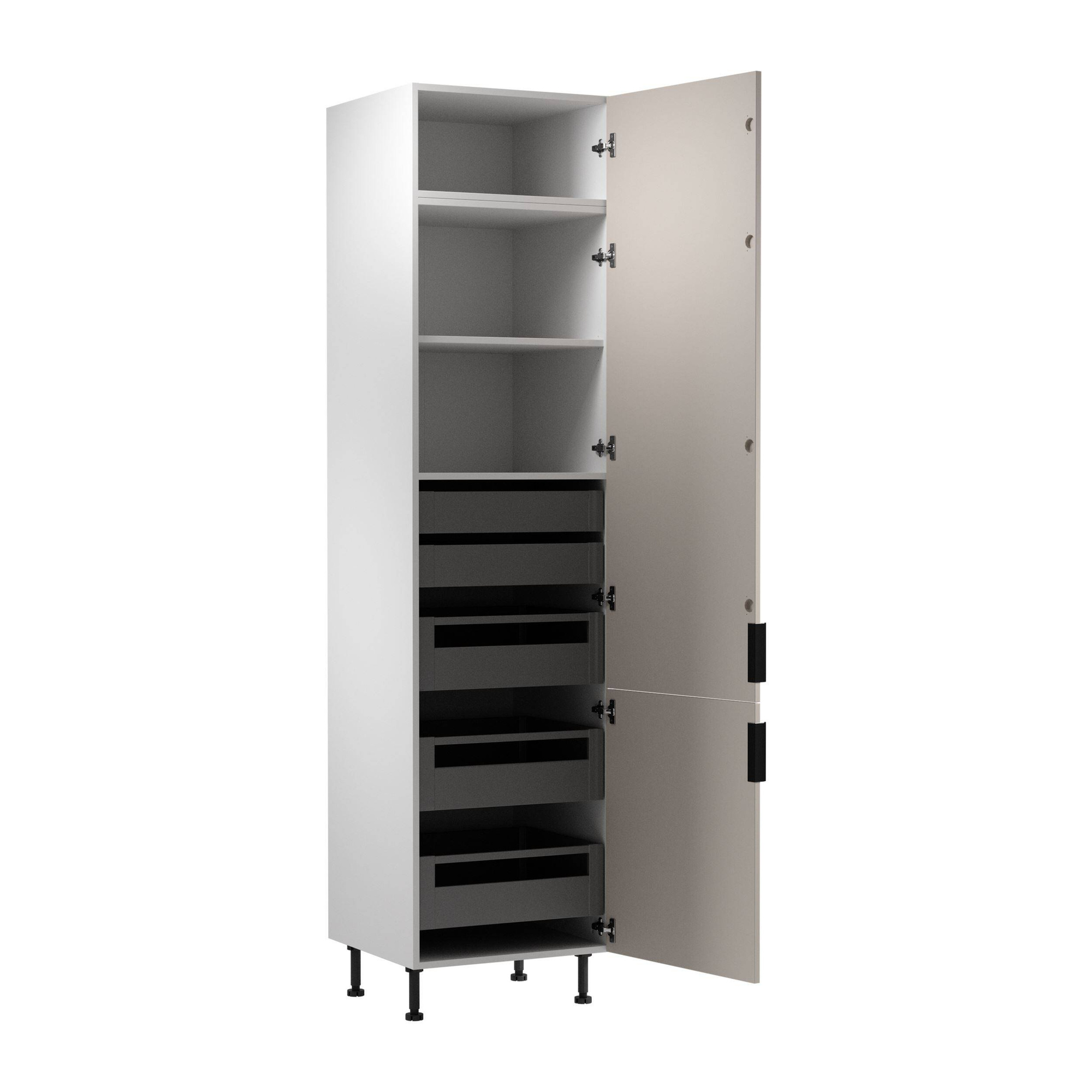 Szafka kuchenna Sorento łączy elegancję z funkcjonalnością. Płyta laminowana w beżowym i białym macie sprawia, że pasuje do każdej kuchni. Wyposażona w 5 szuflad z pełnym wysuwem i cichym domykiem. Regulowane nóżki i czarne metalowe uchwyty.