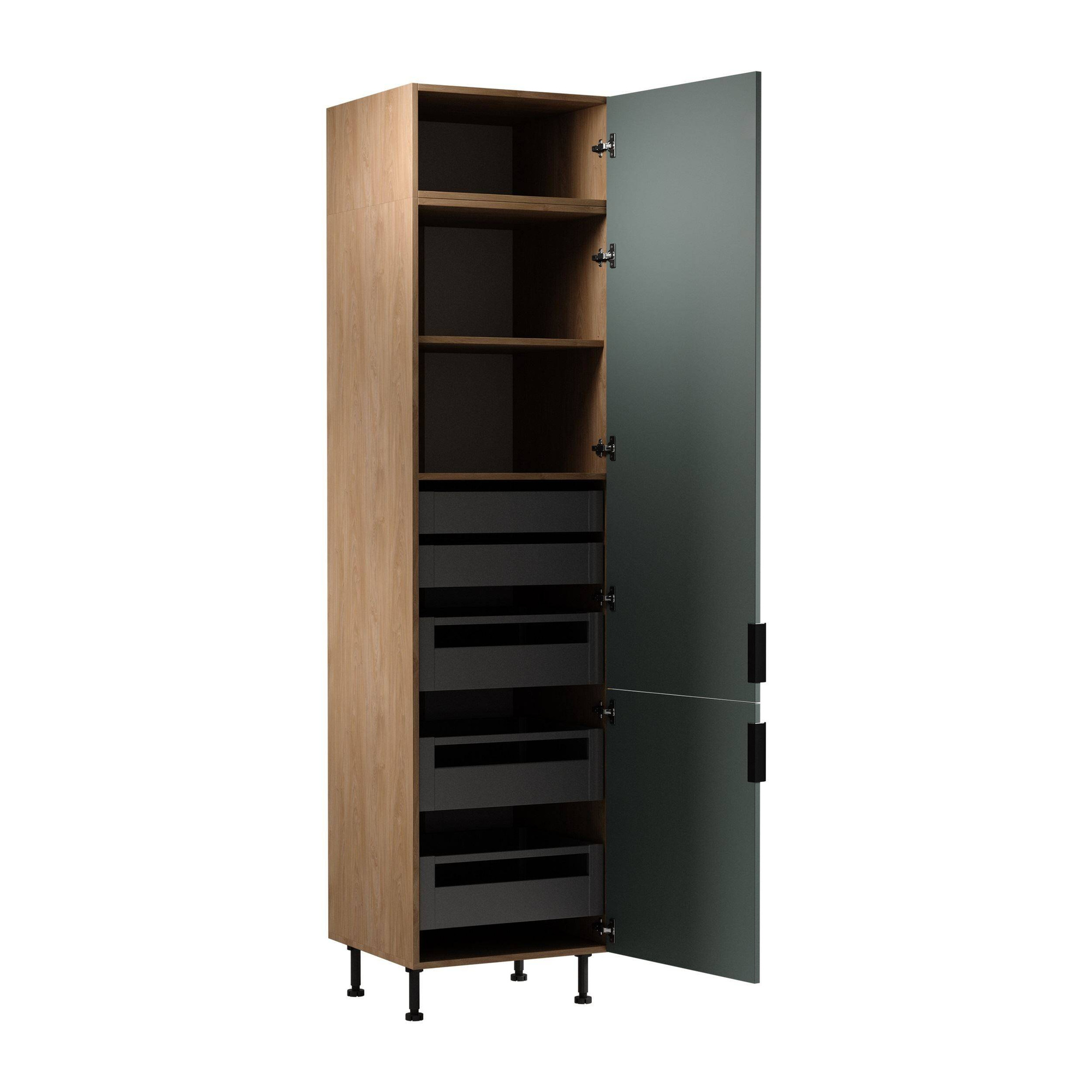 Stylowa szafka kuchenna Sorento w zielonym kolorze to połączenie funkcjonalności i elegancji. Wykonana z wytrzymałej laminowanej płyty, z 5 szufladami o pełnym wysuwie i udźwigu 40 kg. Metalowe uchwyty i ciche zawiasy Clip-On dodają nowoczesności.
