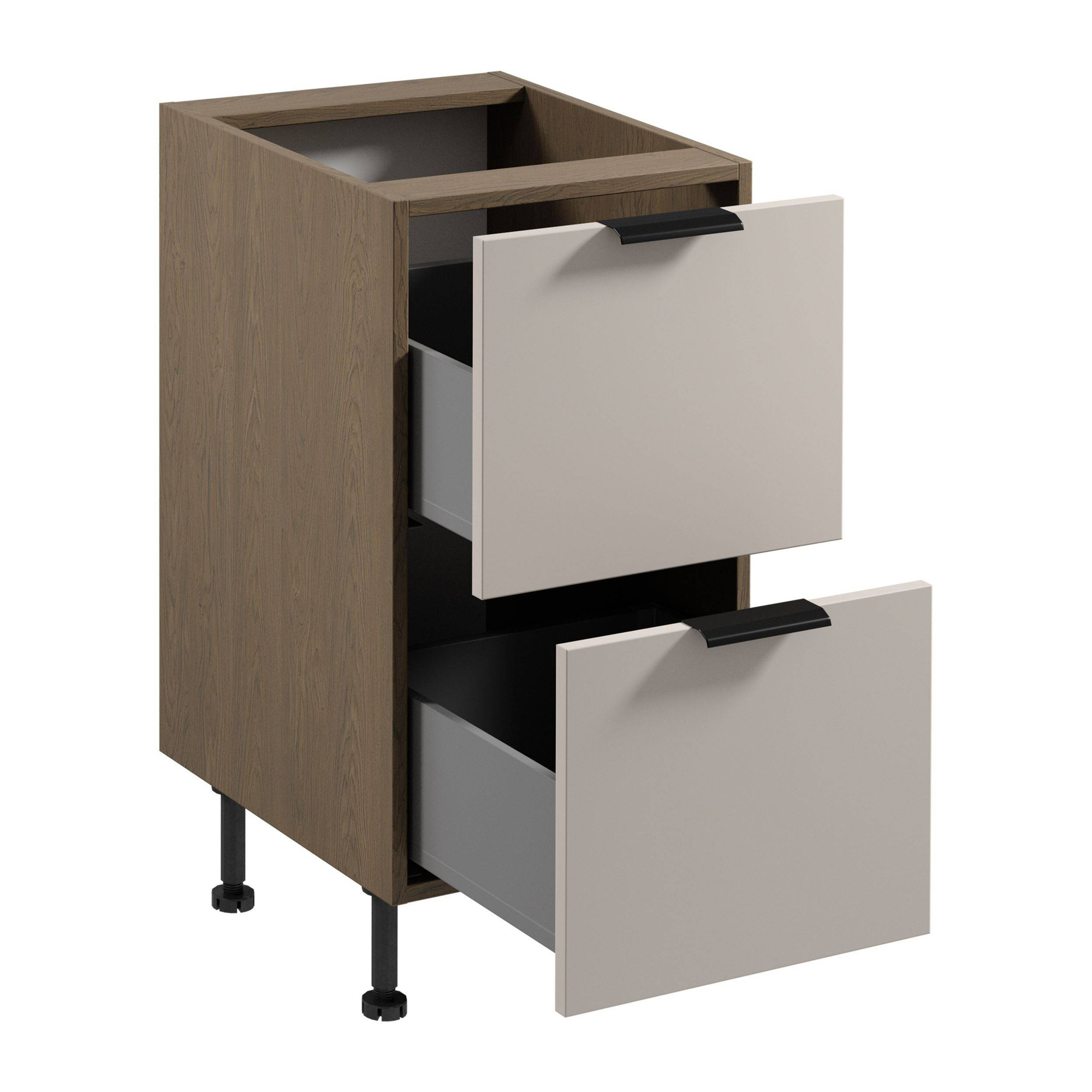 • Szafka kuchenna Sorento D45S2 w kolorze beżowego matu z korpusem Baltic Storm to elegancja i funkcjonalność. Dzięki metalowym uchwytom i pełnemu wysuwowi szuflad, oferuje komfort użytkowania. Samodzielny montaż i regulowane nóżki dodają elastyczności.