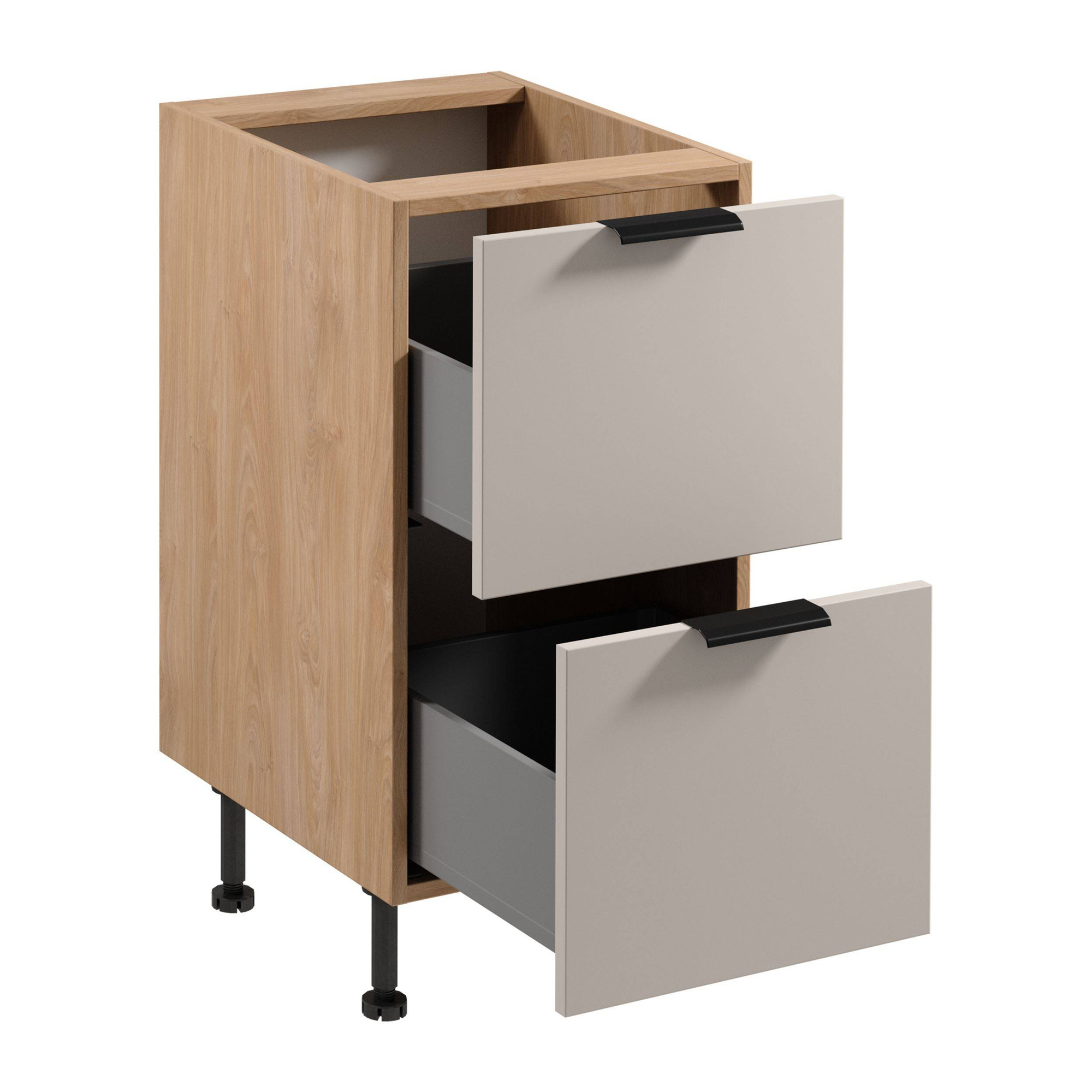 Szafka Kuchenna Dolna Sorento to wyjątkowa propozycja z beżowym frontem matowym i regulowanymi czarnymi uchwytami metalowymi. Wyposażona w dwie pojemne szuflady z pełnym wysuwem i cichym domykiem. Idealna do nowoczesnej kuchni, do samodzielnego montażu.