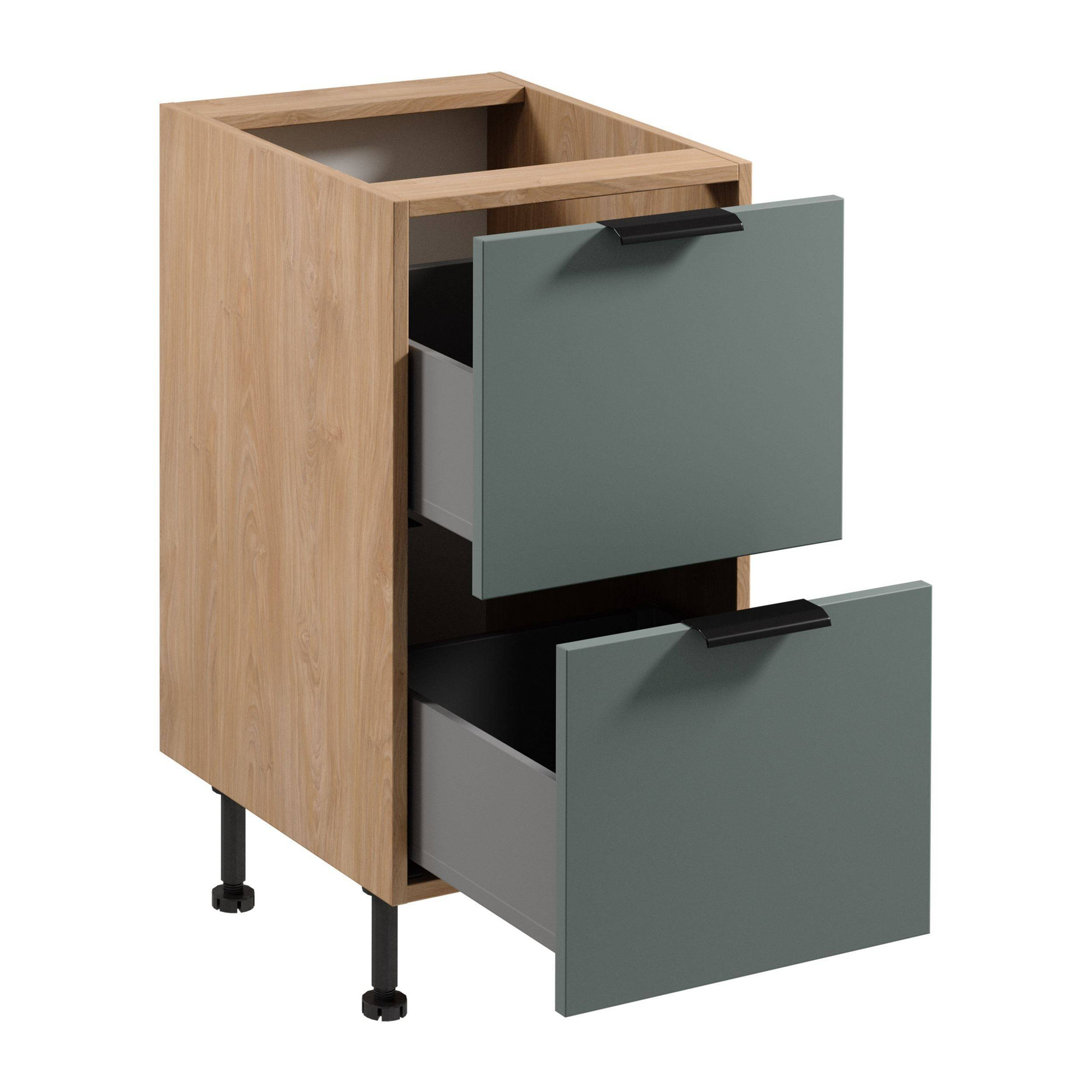Funkcjonalna szafka kuchenna Sorento w odcieniu zieleni Puccini z eleganckim czarnym uchwytem. Wykonana z wytrzymałej płyty laminowanej. Dwie pojemne szuflady na prowadnicach z pełnym wysuwem i cichym domykiem. Regulowane nóżki zapewniające stabilność.
