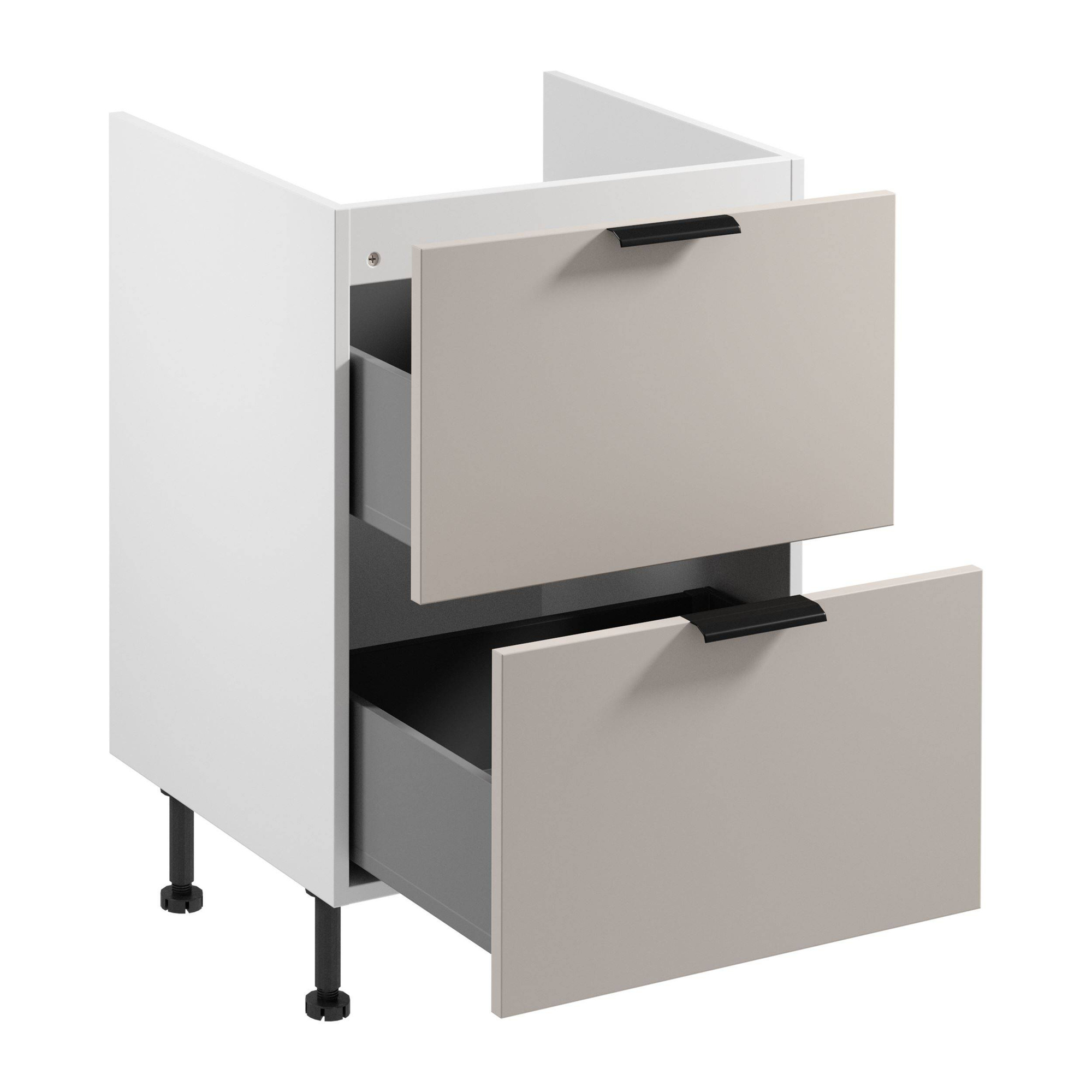 Szafka kuchenna Sorento z beżowym frontem i białym korpusem to funkcjonalność i styl. Posiada dwie pojemne szuflady z cichym domykiem i pełnym wysuwem. Metalowy czarny uchwyt oraz regulowane nóżki dodają elegancji i wygody.