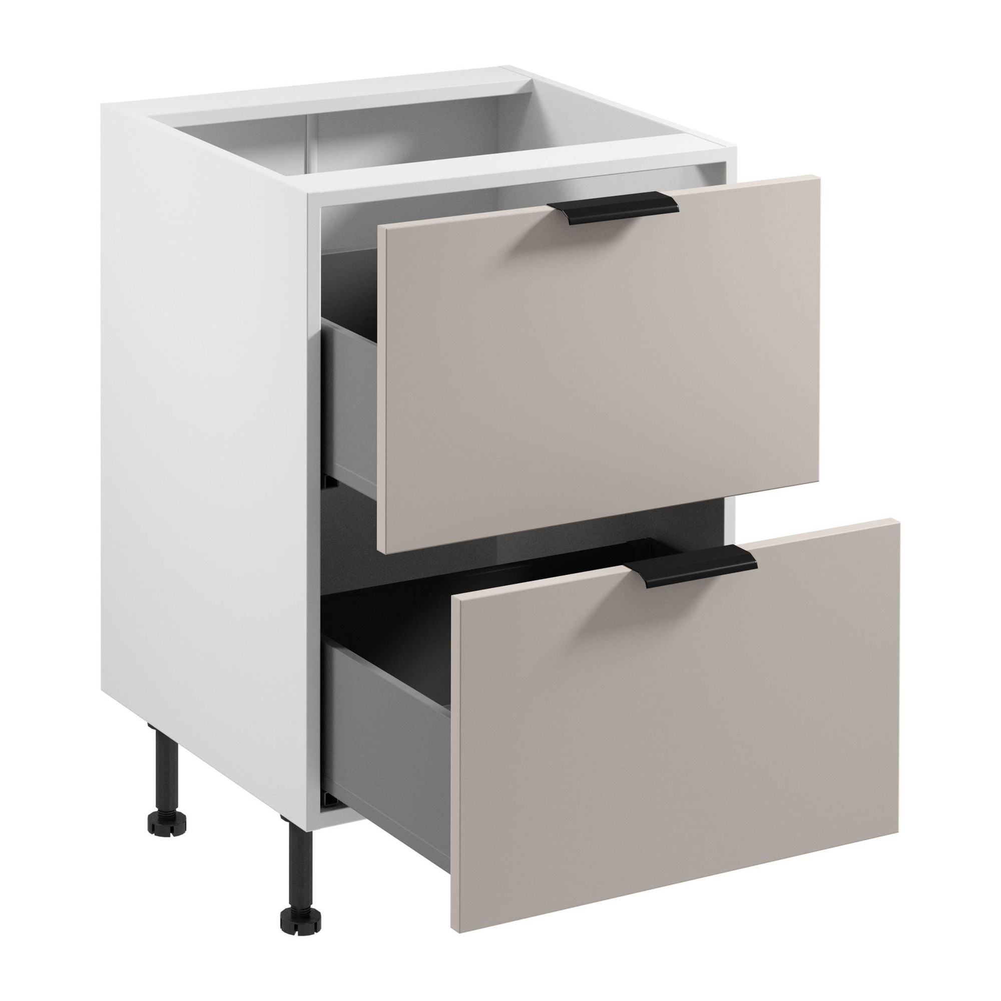 Szafka kuchenna Sorento z podwójnymi szufladami to elegancja i funkcjonalność w kuchni. Beżowy matowy front i biały korpus z laminatu oraz metalowe, czarne uchwyty dodają nowoczesnego stylu. Pełny wysuw szuflad, cichy domyk oraz regulowane nóżki.