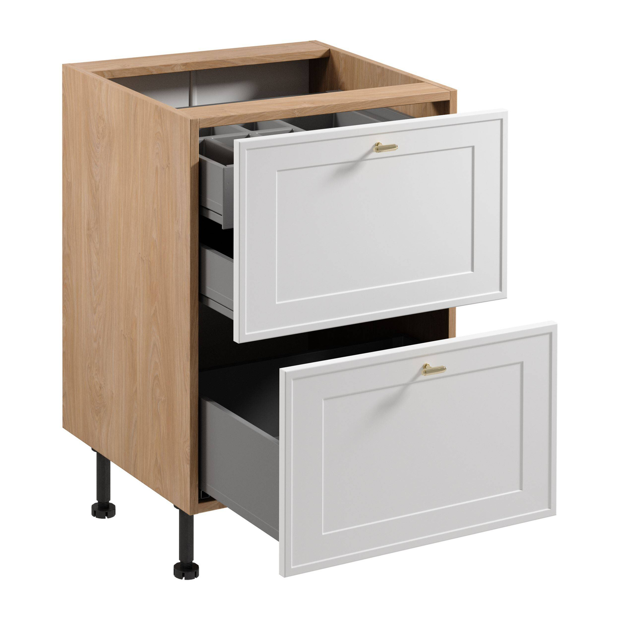 Sercem tej szafki jest jej funkcjonalność – wewnętrzna szuflada z wkładem na sztućce pozwala na intuicyjne organizowanie drobnych akcesoriów kuchennych, a dwie dodatkowe szuflady zewnętrzne zapewniają łatwy dostęp do większych przedmiotów. Wszystko to wspiera system pełnego wysuwu, gwarantując ciche i płynne działanie. Zapewni to komfort codziennego korzystania i długowieczność produktu.