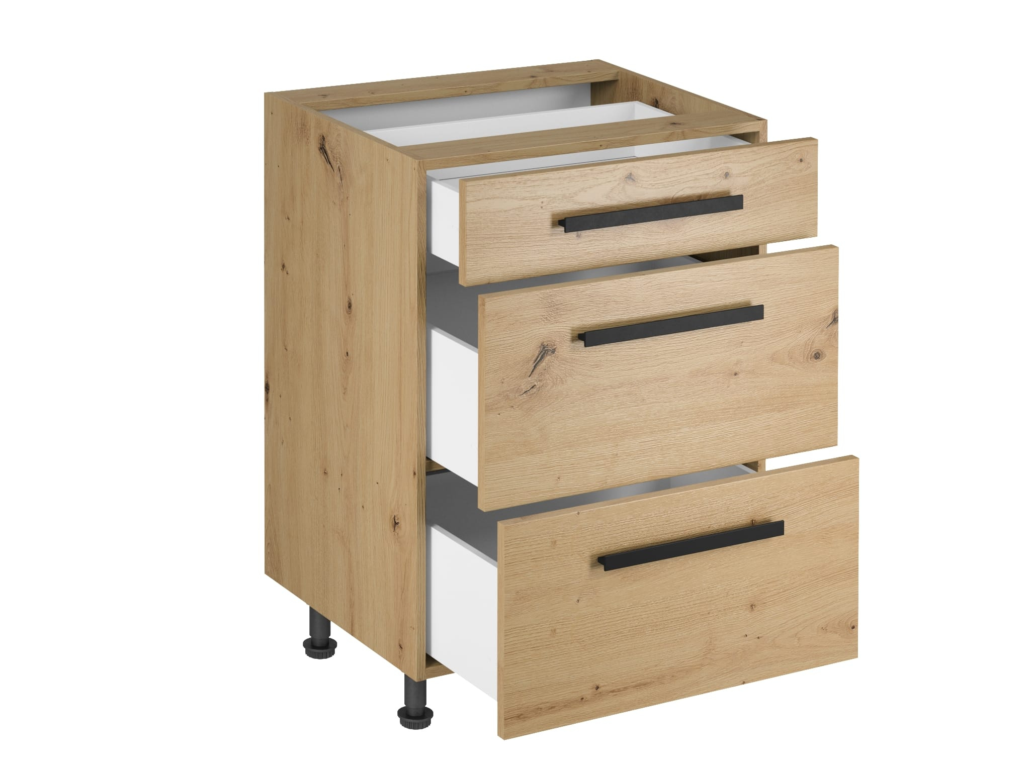 Szafka kuchenna dolna Gała Meble z trzema szufladami w kolorze Dąb Artisan. Front i korpus wykonane z płyty laminowanej. Klasyczny czarny uchwyt metalowy i prowadnice z samodociągiem. Idealna do eleganckiej kuchni.