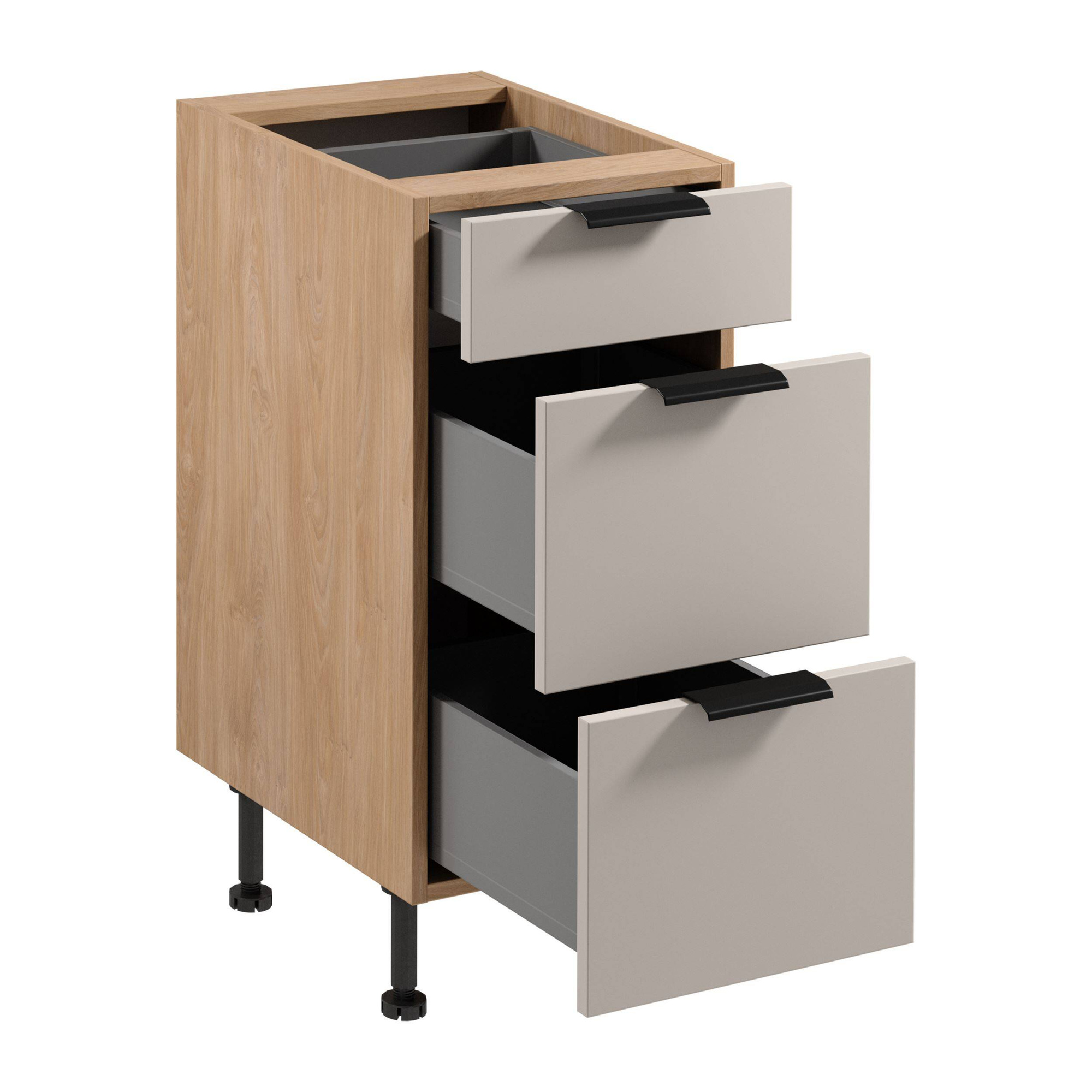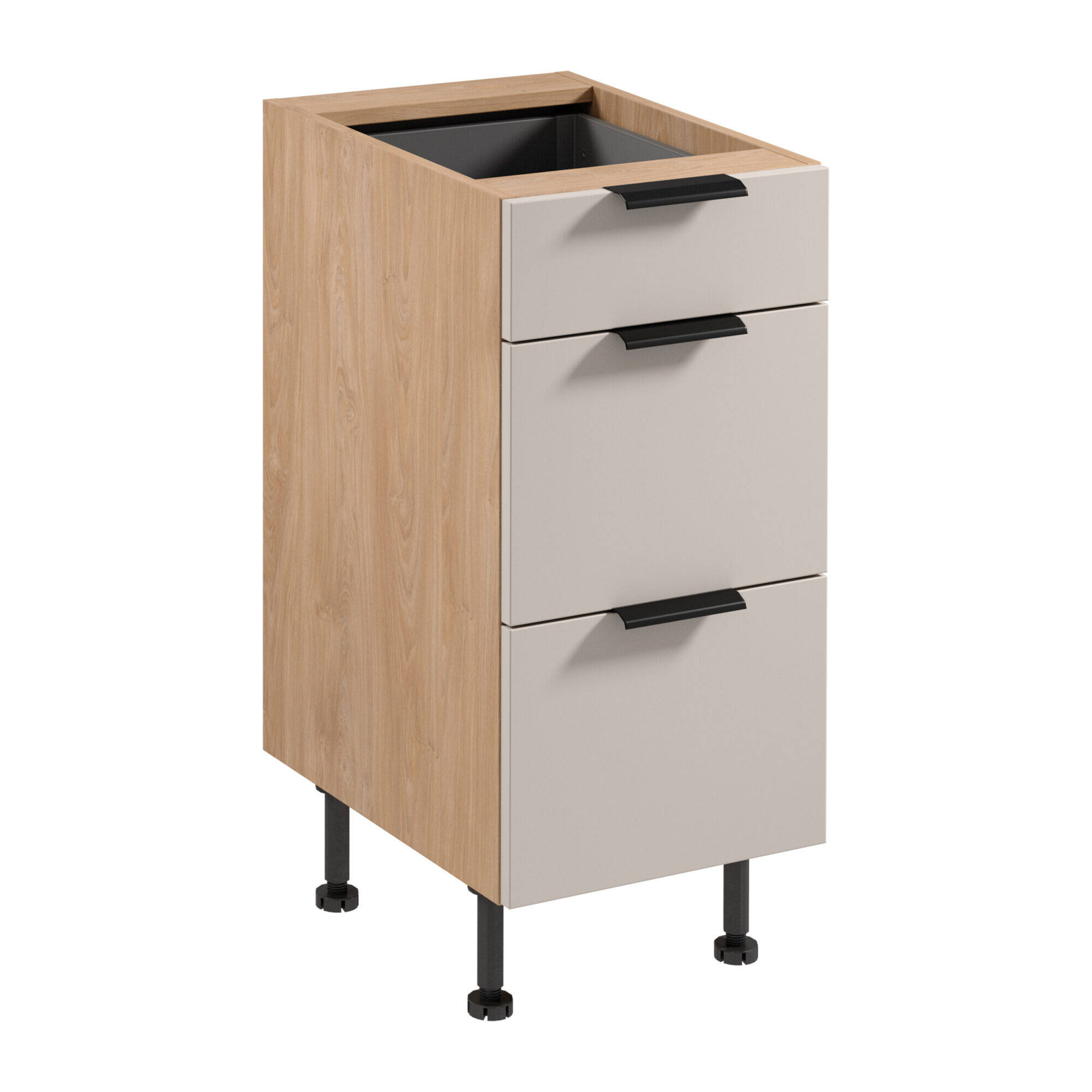 Szafka kuchenna Sorento D40S3 łączy elegancję i funkcjonalność. Wykonana z laminowanej płyty w beżowym macie z korpusem Puccini. Wyposażona w trzy szuflady z pełnym wysuwem i cichym domykiem. Metalowe, czarne uchwyty dodają nowoczesności.