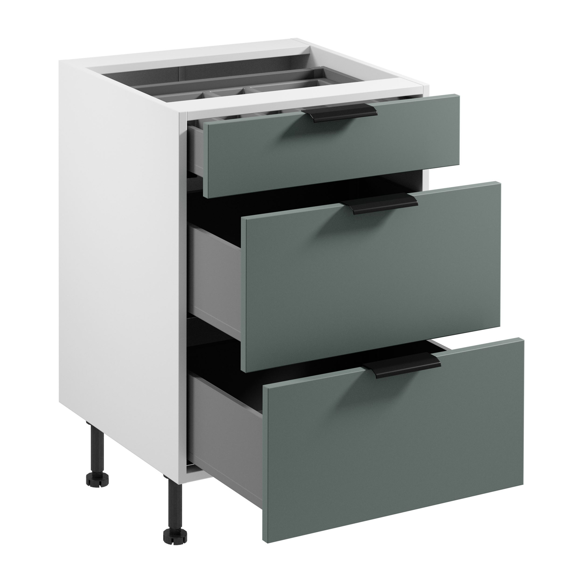 Oto Szafka Kuchenna Dolna 3S z Wkładem Na Sztućce Sorento D60S3 AX, idealne rozwiązanie dla każdej nowoczesnej kuchni. Dzięki eleganckiemu połączeniu białego matu z zielonym matowym frontem, ta szafka przyciąga wzrok i wprowadza do wnętrza wyjątkową atmosferę. Jej harmonijna kolorystyka doskonale zestawia się z różnorodnymi stylami aranżacyjnymi, czyniąc ją nie tylko praktycznym, ale i estetycznym elementem kuchennej przestrzeni.