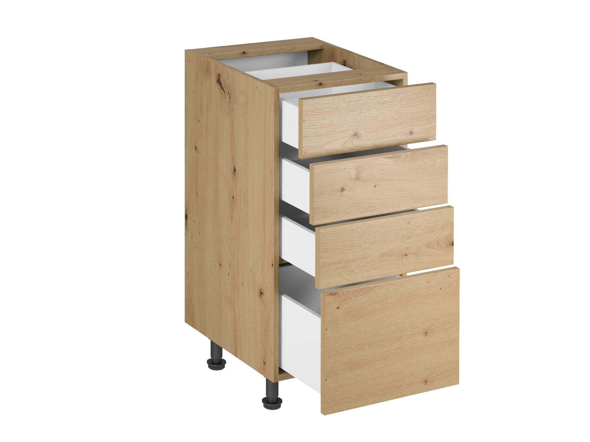 Szafka kuchenna Langen Artisan z 4 szufladami to praktyczne rozwiązanie o eleganckim wyglądzie. Fronty z płyty laminowanej w kolorze Dąb Artisan, system push to open i regulowane nóżki zapewniają nowoczesność i funkcjonalność. Do samodzielnego montażu.