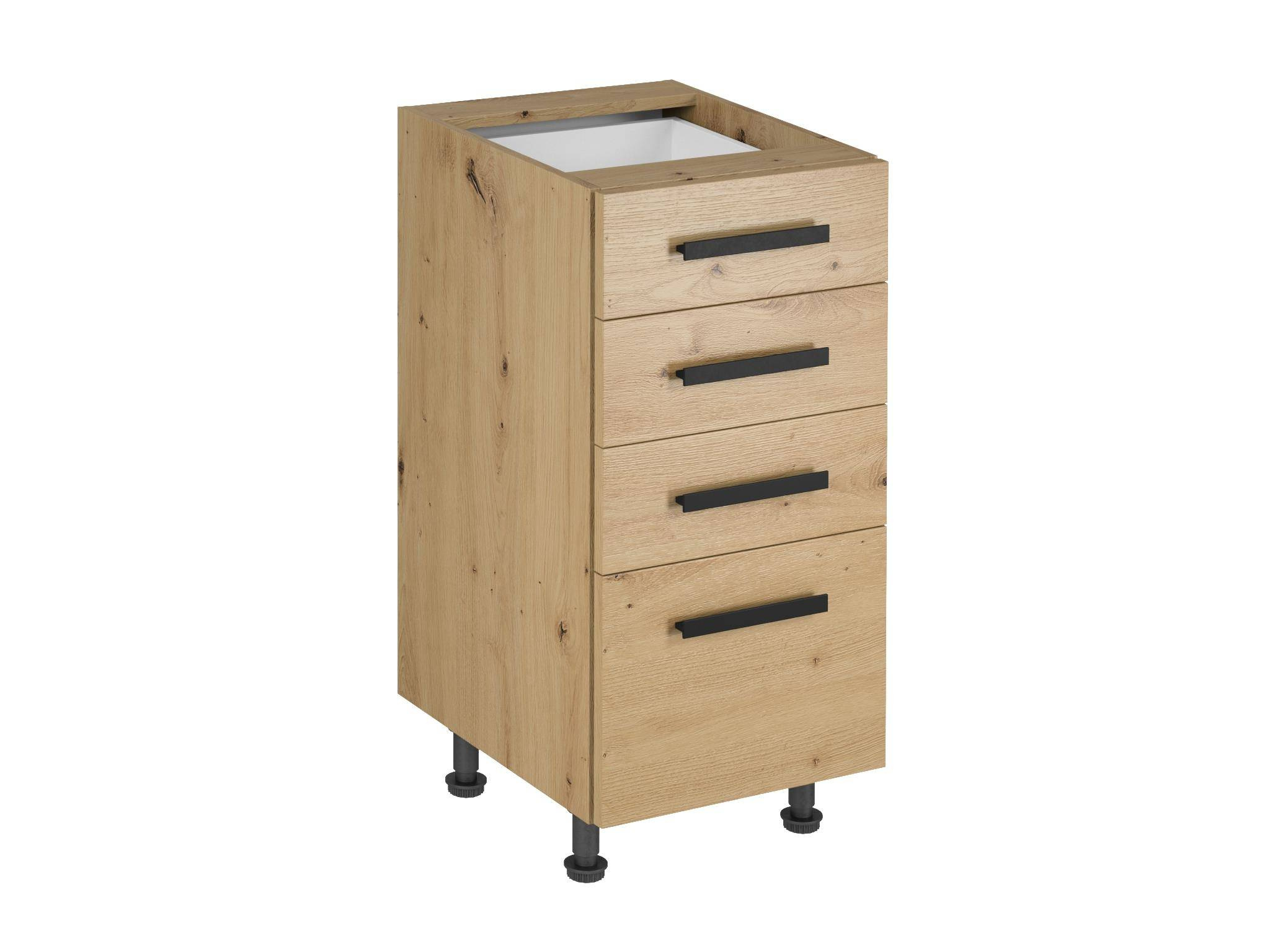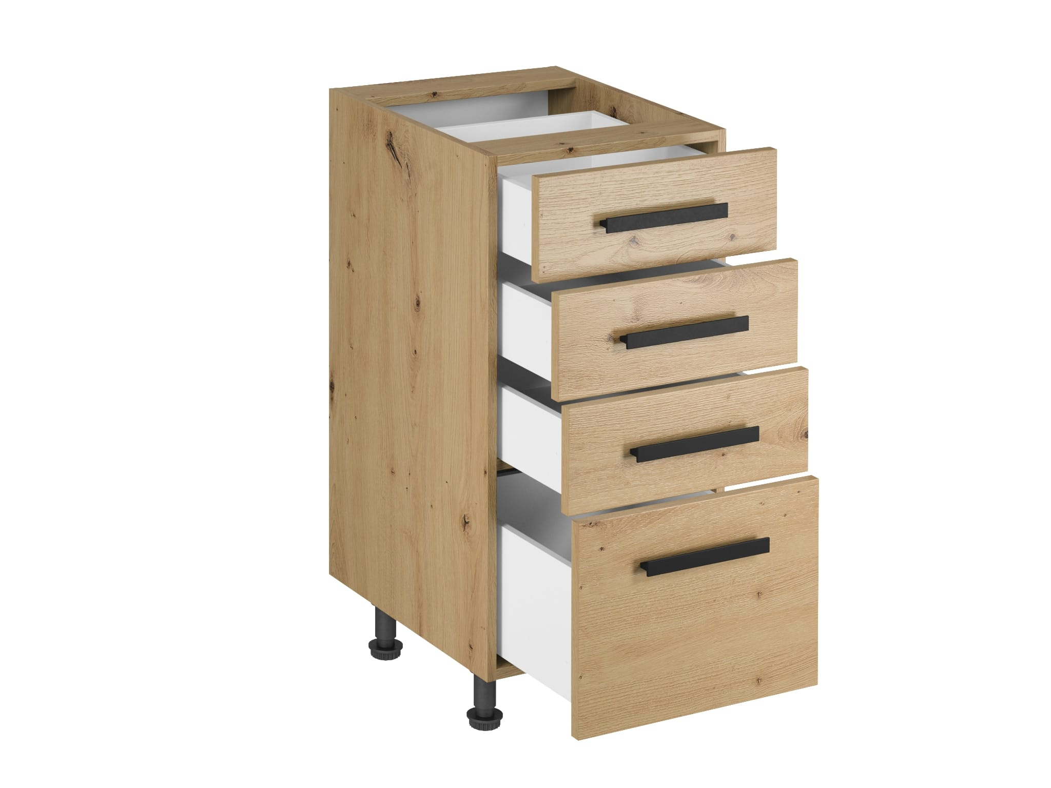 - Szafka kuchenna Langen Artisan z 4 szufladami to styl i funkcjonalność w jednym. Wykonana z wytrzymałej płyty laminowanej w kolorze dębu Artisan. Klasyczne, czarne metalowe uchwyty i regulowane nóżki dodają elegancji. Idealna do samodzielnego montażu.