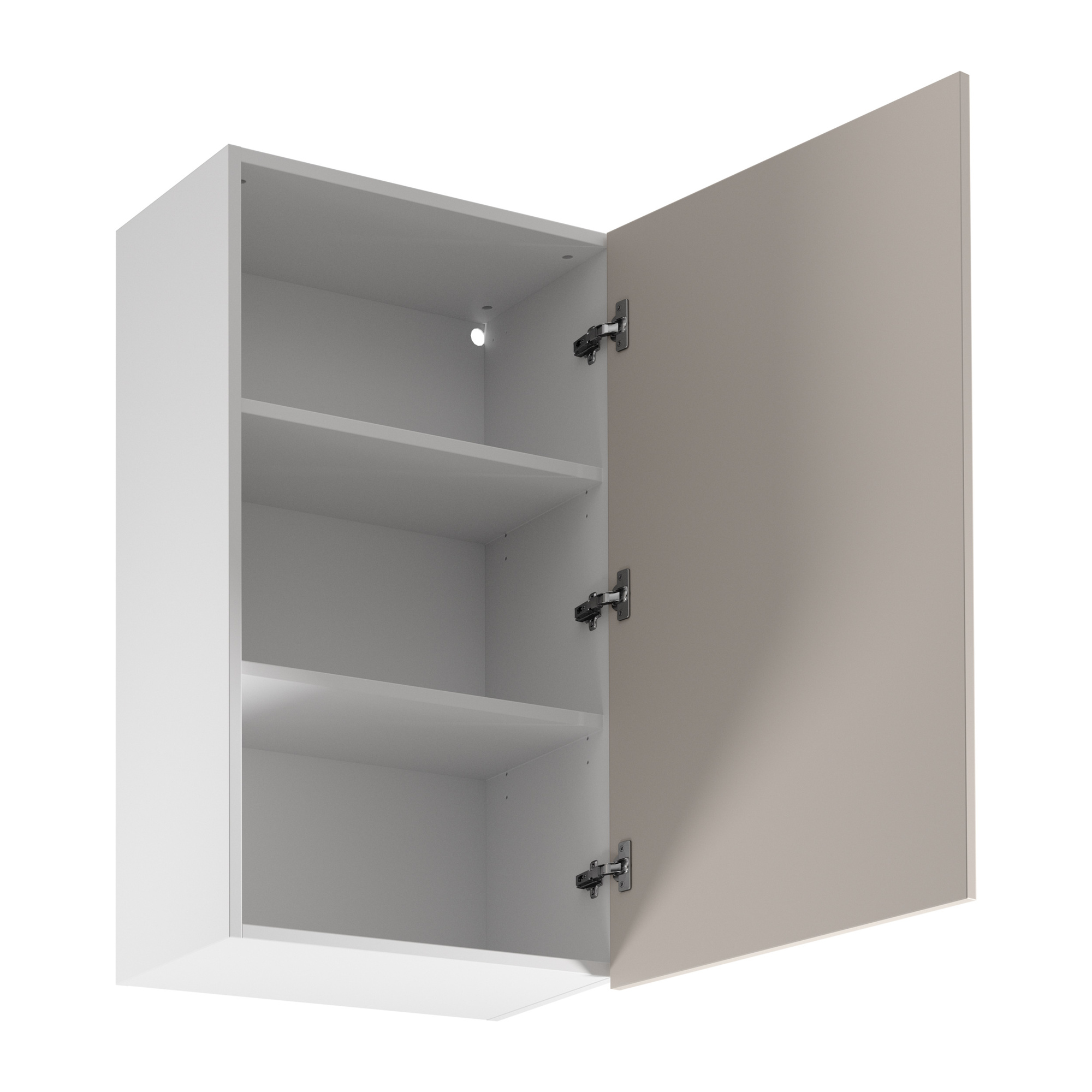 Szafka kuchenna górna Sorento G60 w białym i beżowym macie to nowoczesna elegancja do Twojej kuchni. Wykonana z trwałej płyty laminowanej, oferuje ciche domykanie dzięki zawiasom Clip-On. Dwustronny montaż, funkcjonalność podkreślają 2 regulowane półki.