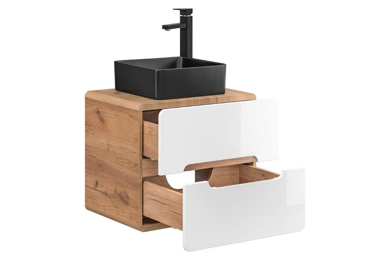 - Biała szafka nastawna o szerokości 60 cm z dekorem dębowym z umywalką nastawną czarną bez baterii.