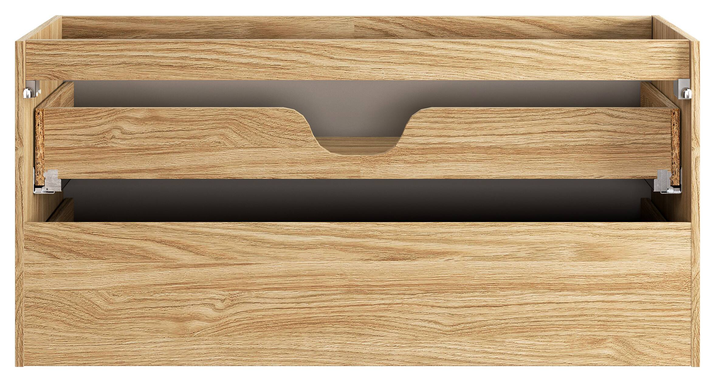 Szafka posiada dwie pojemne szuflady. Górna szuflada wyposażona jest w pełne dno z wycięciem w tylnej listwie, co umożliwia montaż syfonu ściennego niskiego (syfon nie znajduje się w zestawie). Podczas gdy górna szuflada wysuwa się na 3/4 długości, dolna szuflada oferuje pełen wysuw, zapewniając łatwy dostęp do przechowywanych przedmiotów. Obie szuflady mają cichy domyk, co zapobiega gwałtownej reakcji podczas zamykania.